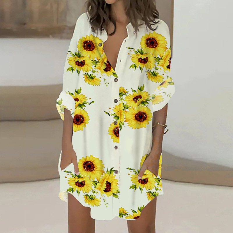 2022 Summer New Women's Fashion Print Long-sleeved Shirts Single-breasted Long Loose Shirts Sunflower Printed Cardigan Blouses
