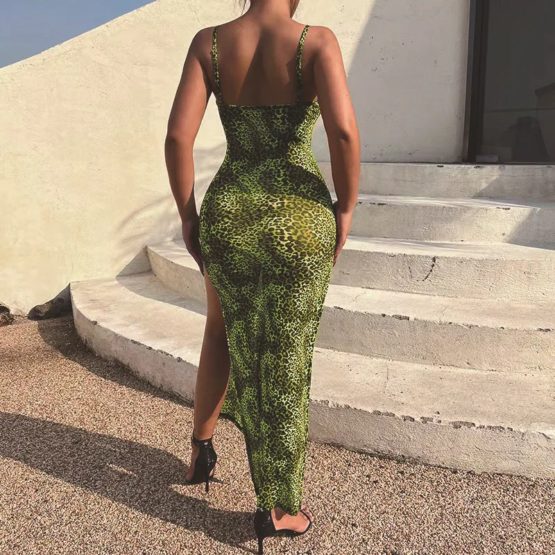 2022 Summer Sexy Vacation High Slit Long Dress Fashion Sleeveless Sling Leopard Maxi Dresses For Women Vesitdos De Mujer Femme