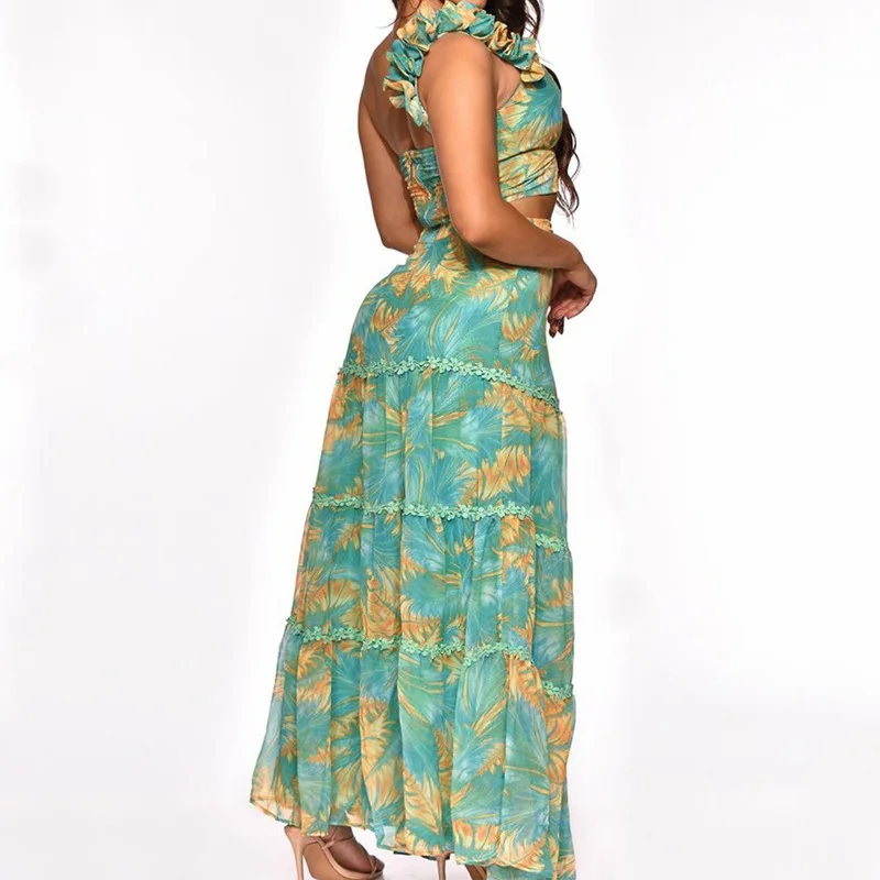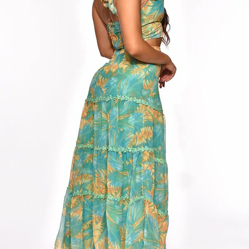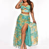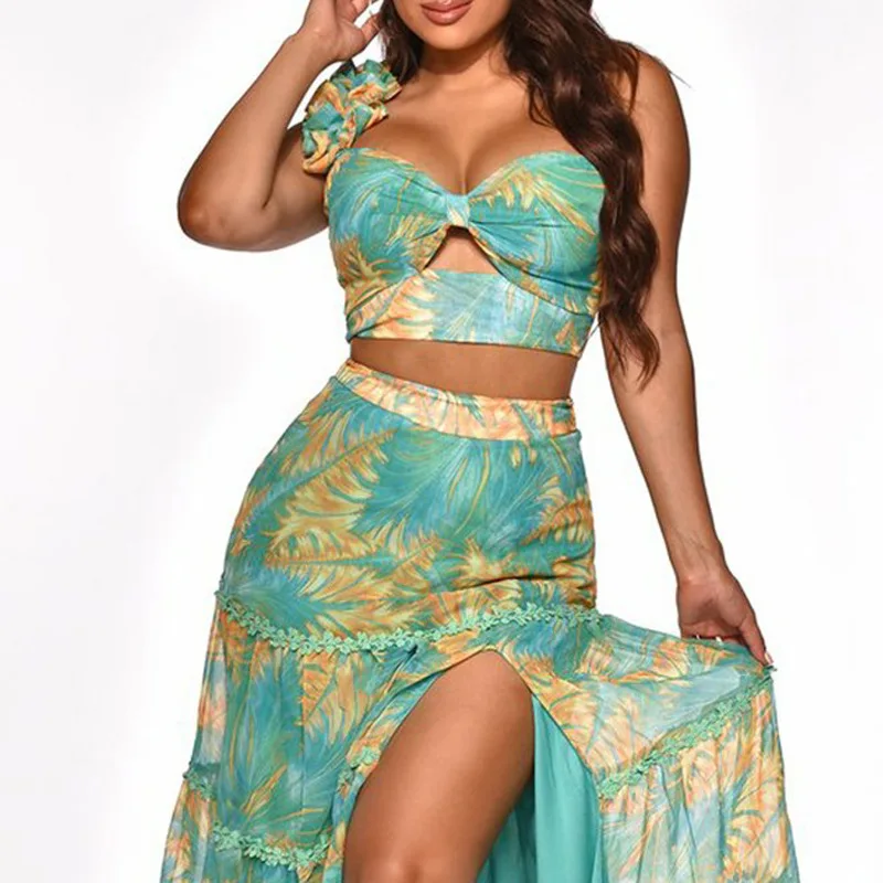 2022 Women's Fashion Sexy Strap Tube Top Printed Slit Skirt Two Piece Set For Women Elegant Hollow Out Crop And Maxi Skirts Sets