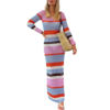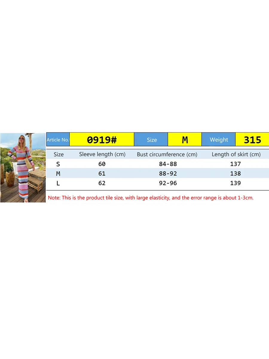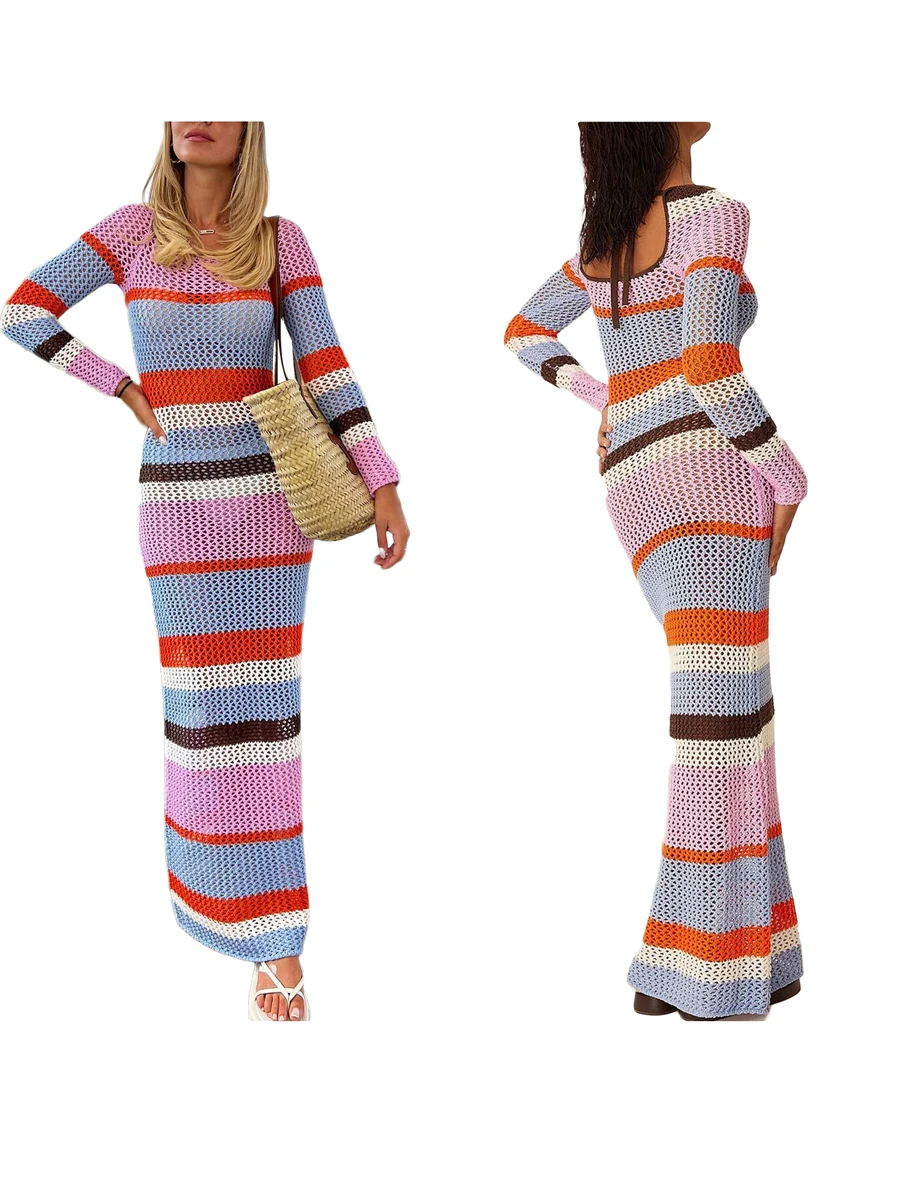 2023 Autumn Fashion Striped Knit Dress Women Long Sleeve Square Neck Casual Slim Fit Hollow Out See-Through Elastic Long Dresses