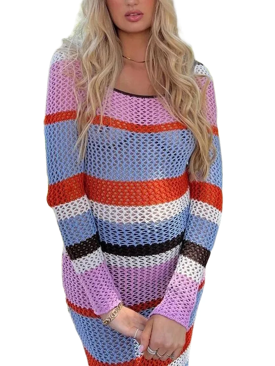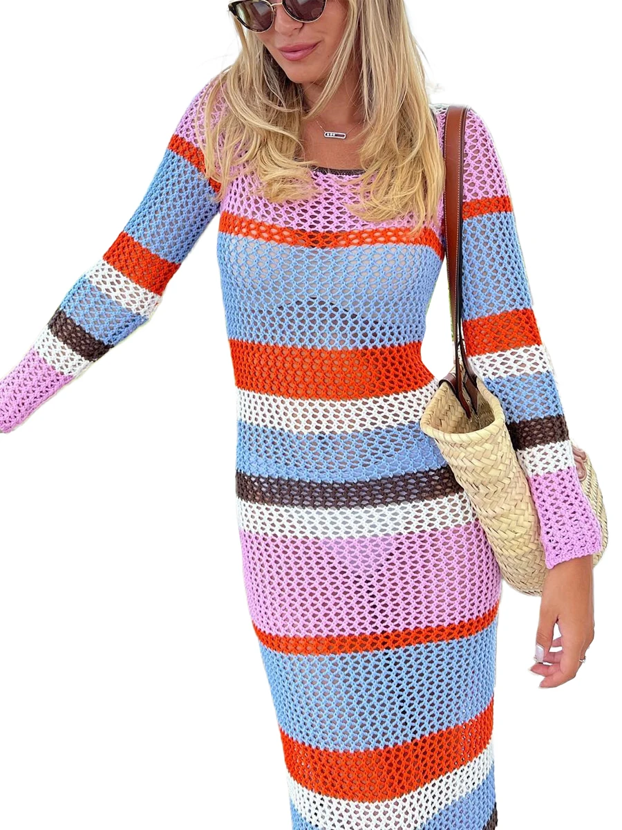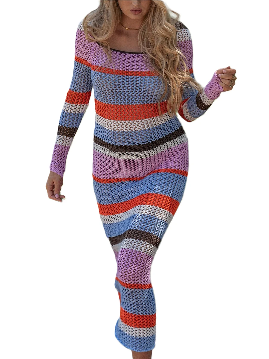 Women’s Knitted Dress, Square Neck Long Sleeve Striped Hollow Out See-Through Long Dresses