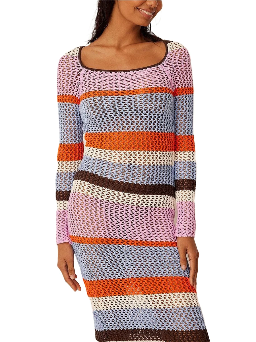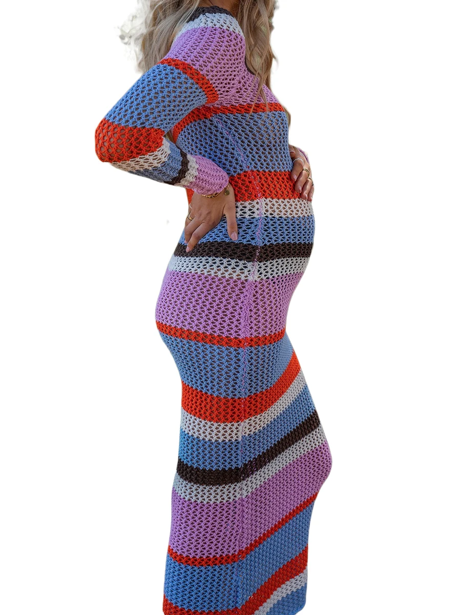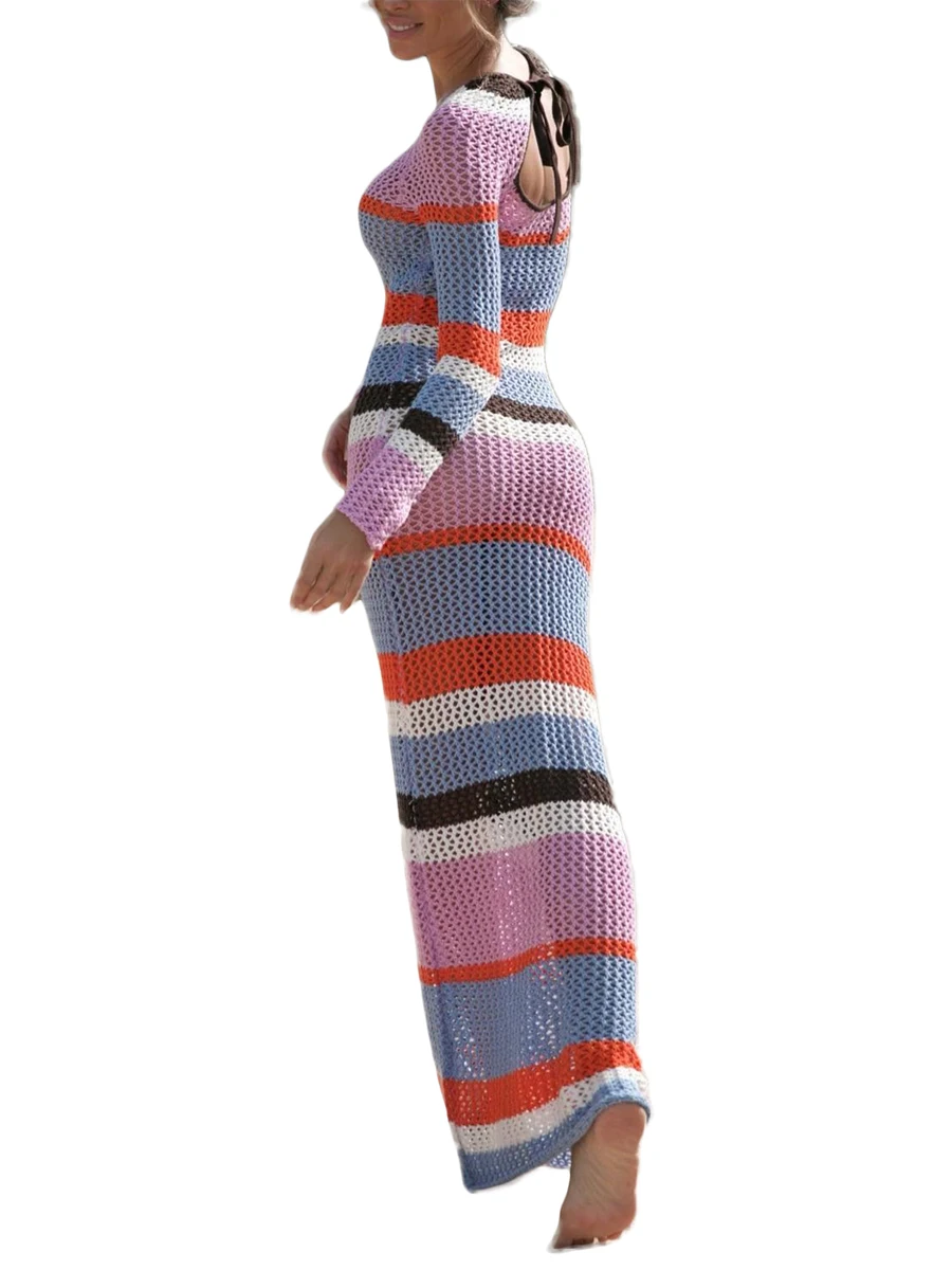 Women’s Knitted Dress, Square Neck Long Sleeve Striped Hollow Out See-Through Long Dresses