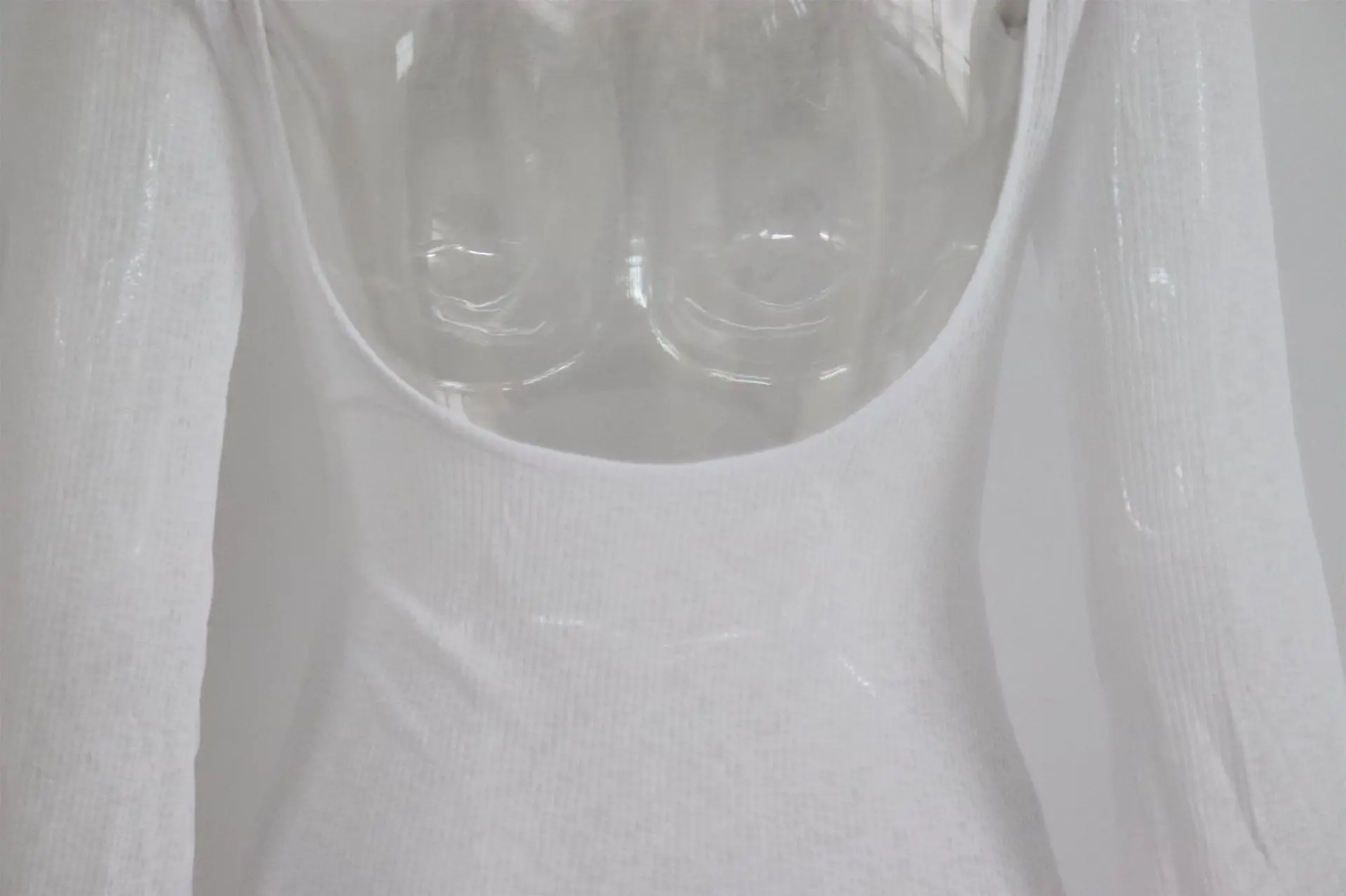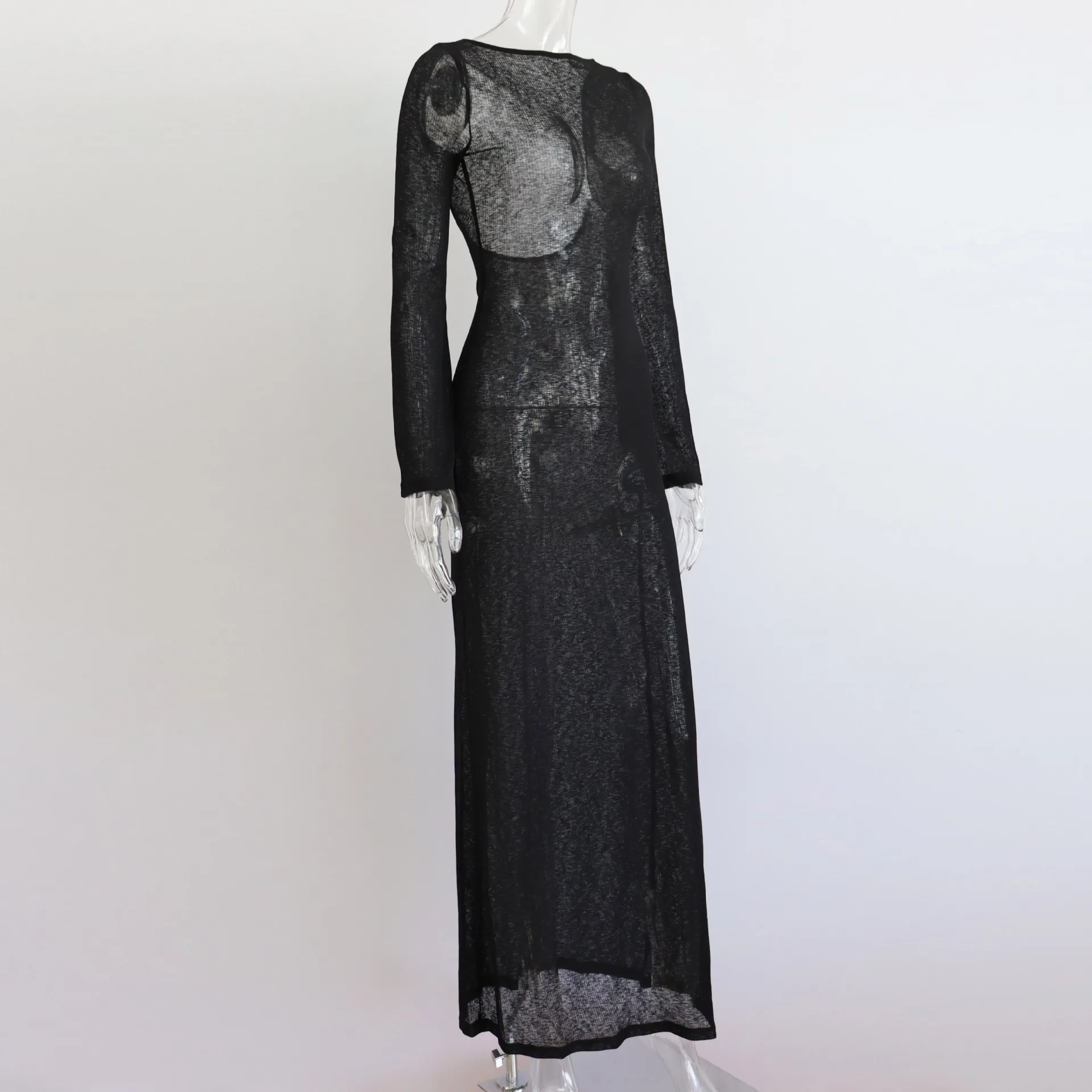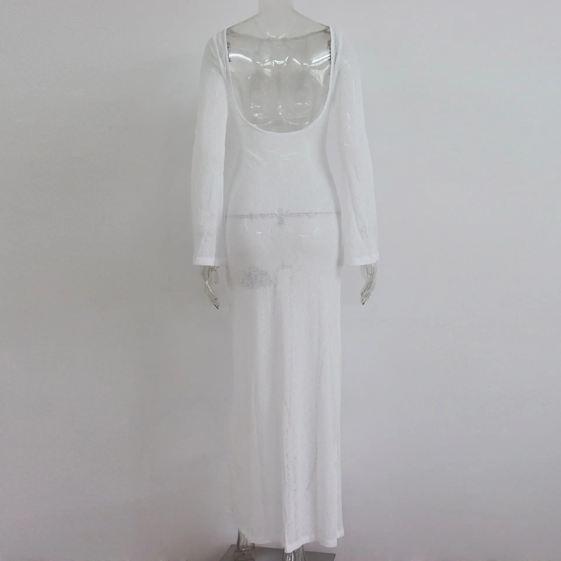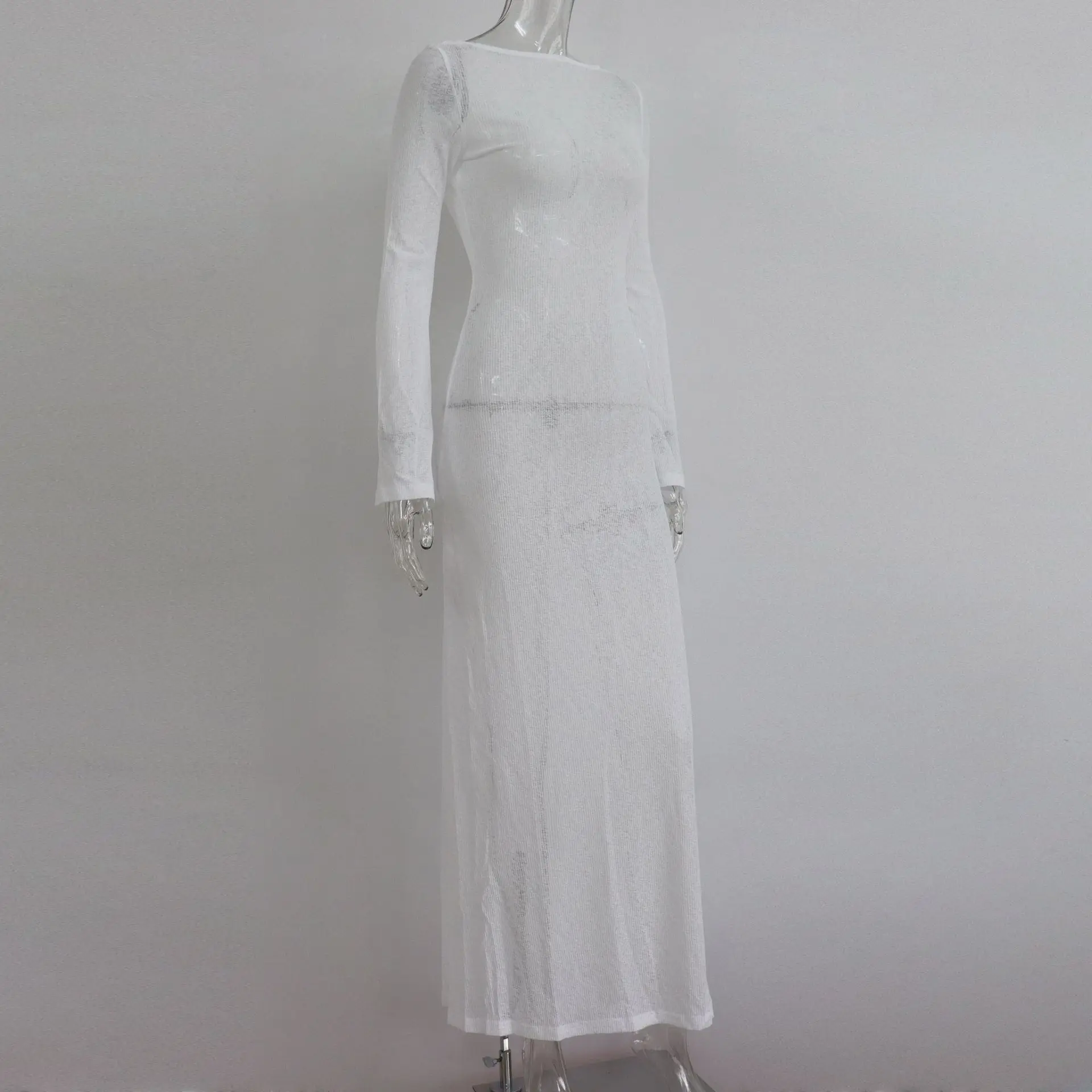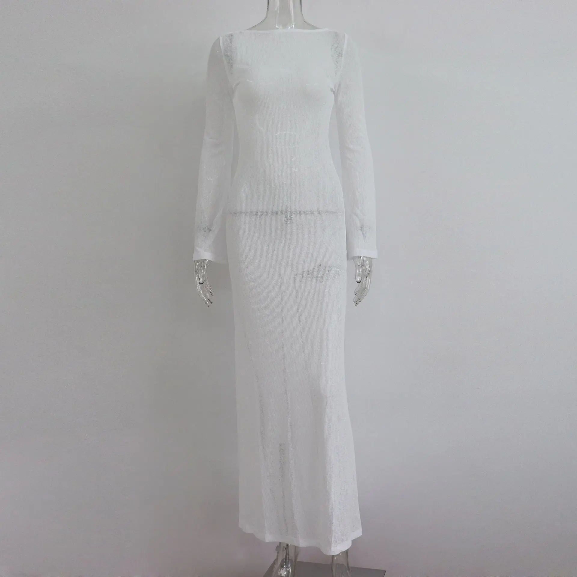 Women Wrapped Dress, Long Sleeve Round Neck See Through Sunscreen Solid Color Backless Beach Long Dress