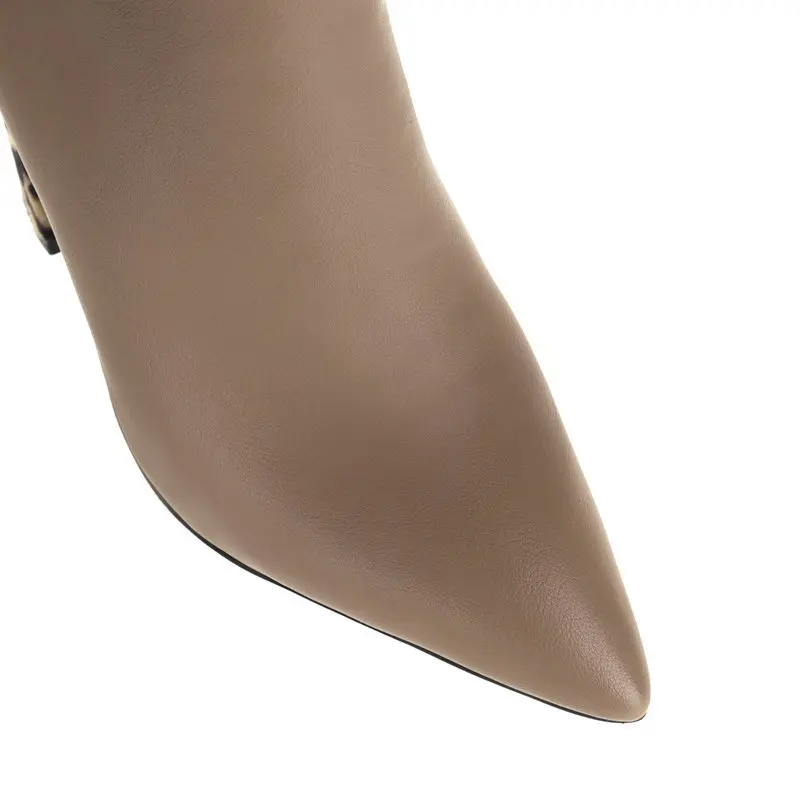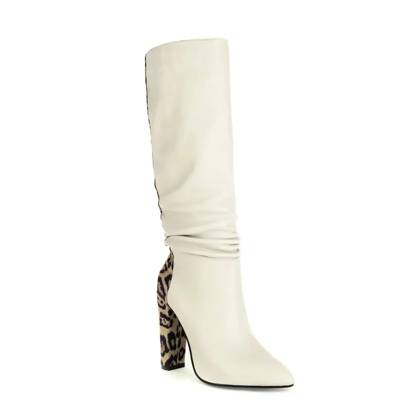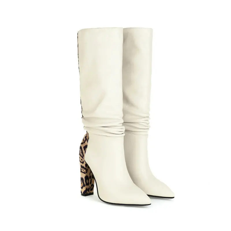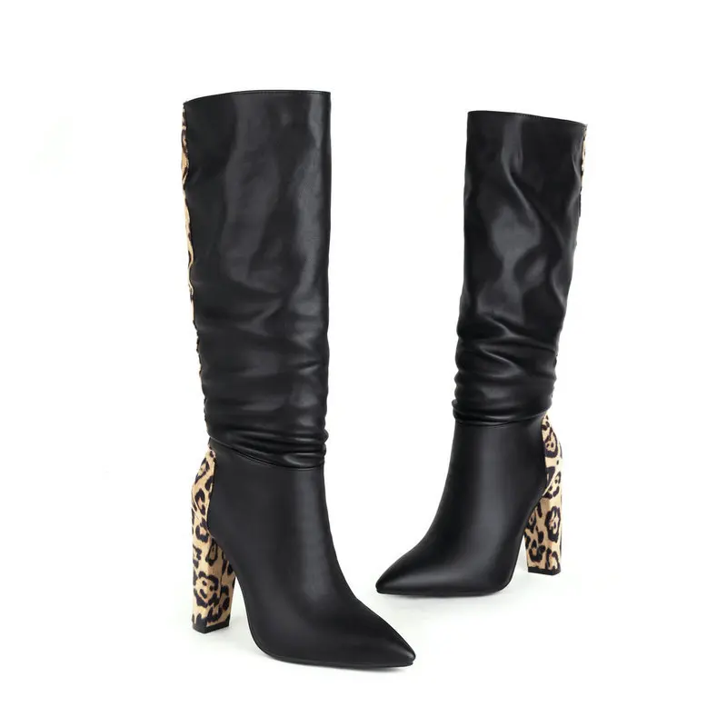 2023 pointed thick heeled high boots for women with pleated sleeves, high heels, and fashion boots that are below knee height