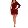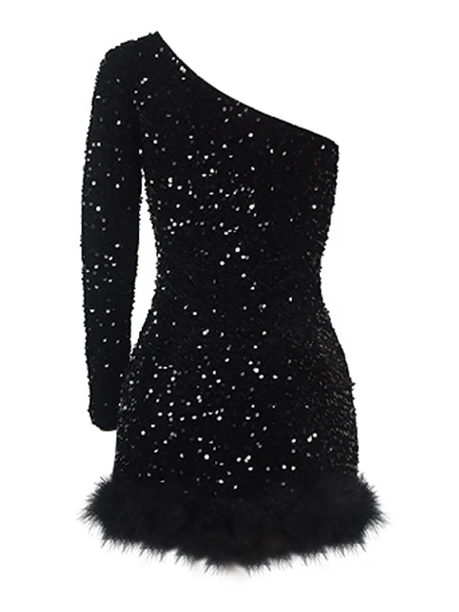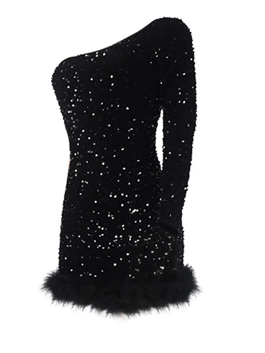 2023 Spring New Women Feather Sequin One Shoulder Bodycon Party Dress Fashion Long Sleeve Mini Dress