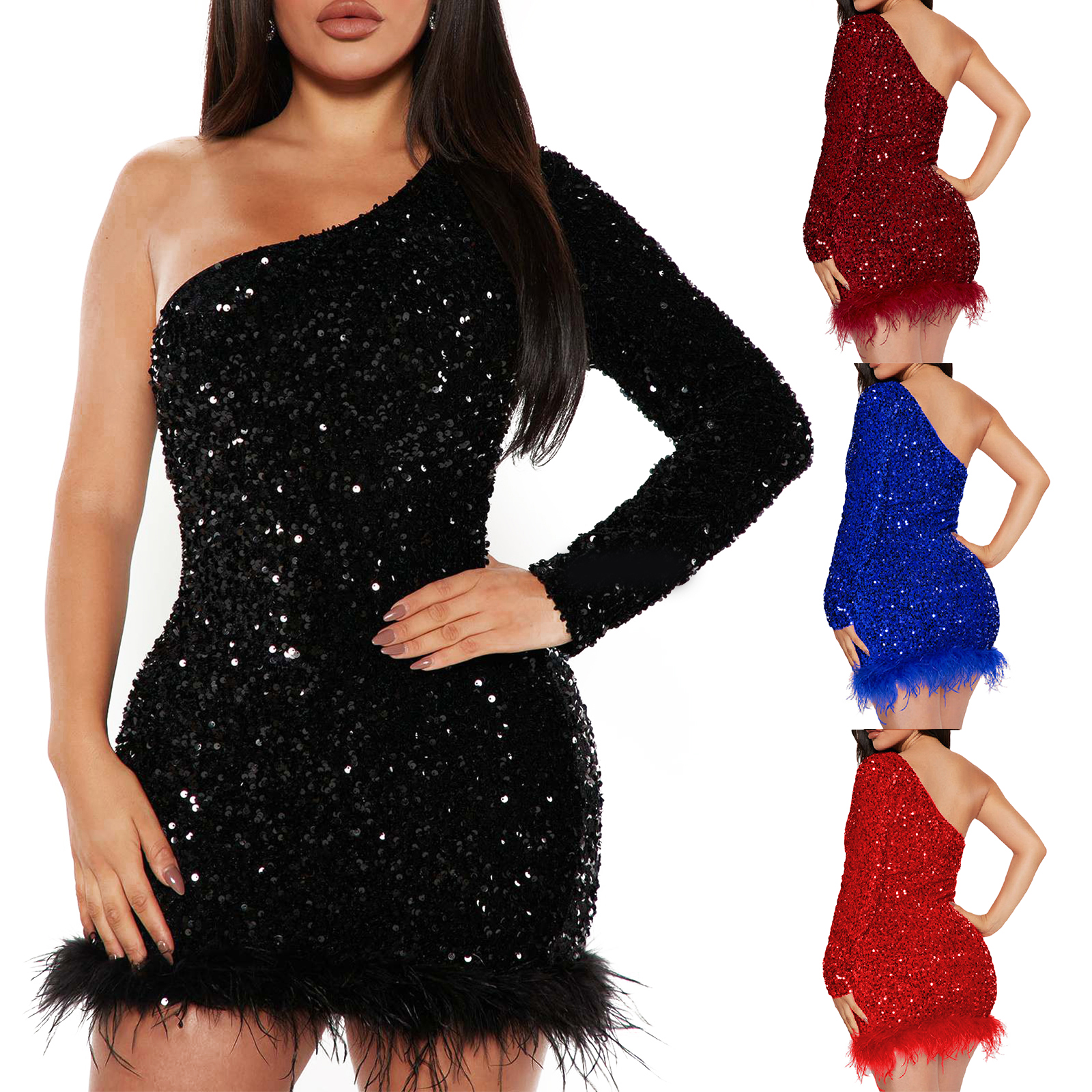 Women Long Sleeve Dress Feather Sequin One Shoulder Bodycon Party Dress for Beach Club Streetwear