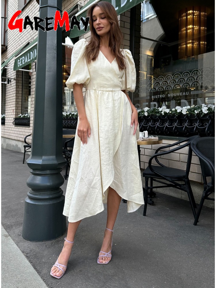 2024 Casual Lace Up Puff Sleeve Women’s Long Dress Elegant A-line Midi Dress with Side Slits Spring Summer Dresses for Women