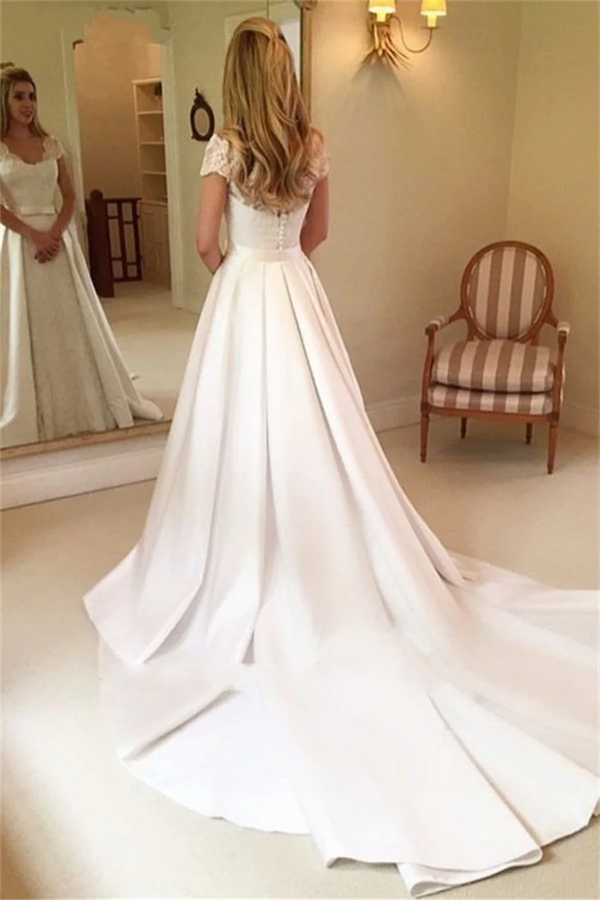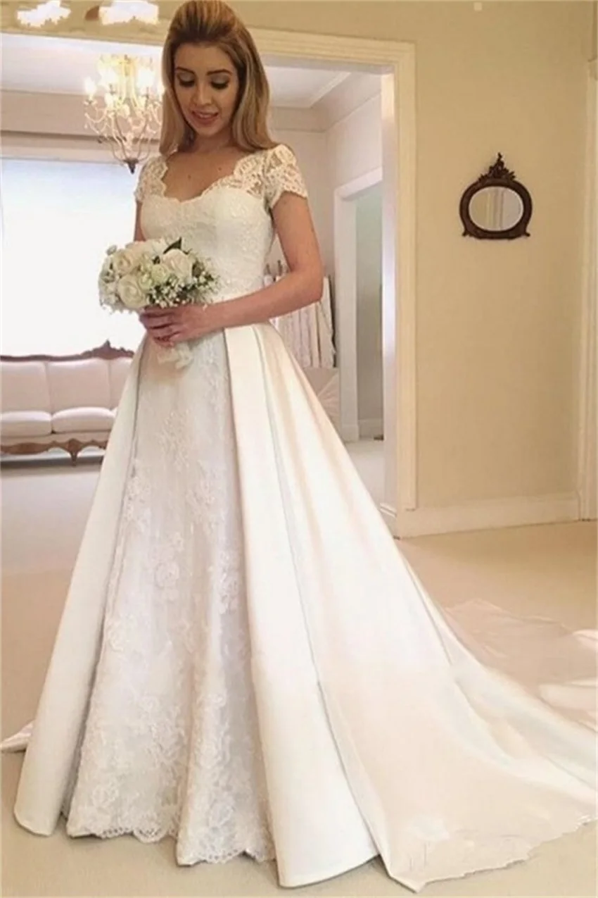 2024 Vintage Long Lace Wedding Dresses V-Neck Short Sleeves Button Back Detachable Satin Train Bridal Dreeses robe de mariee