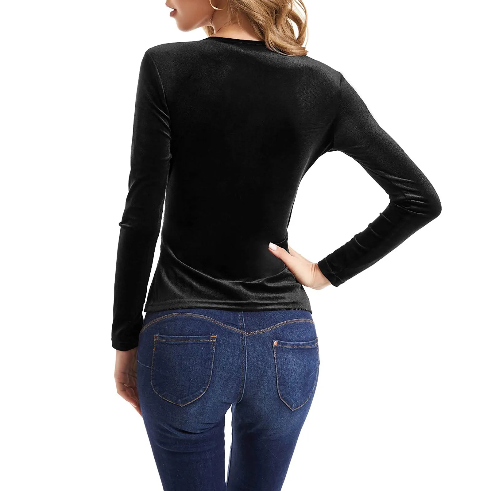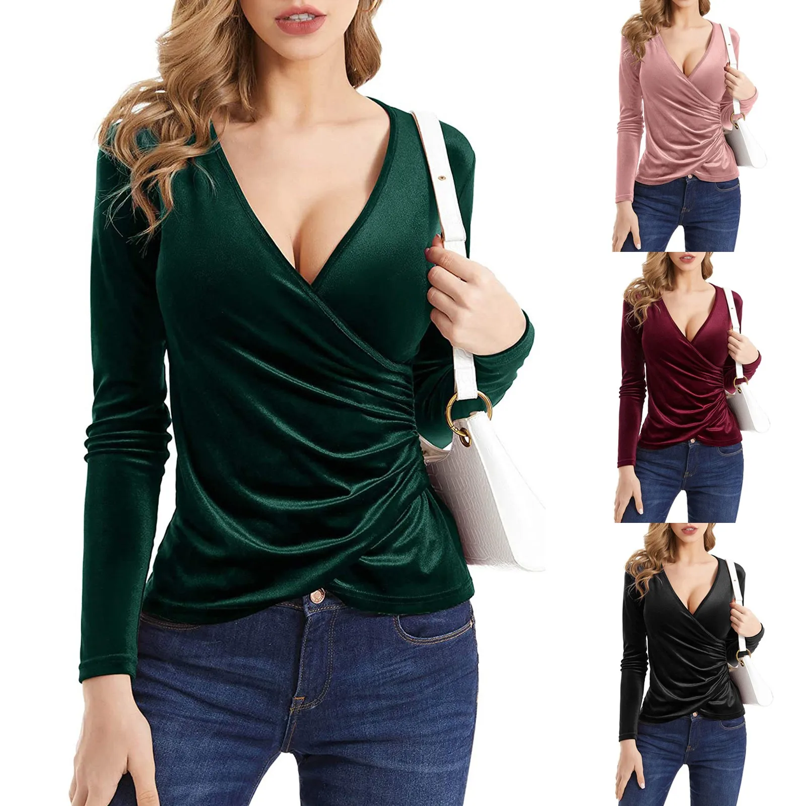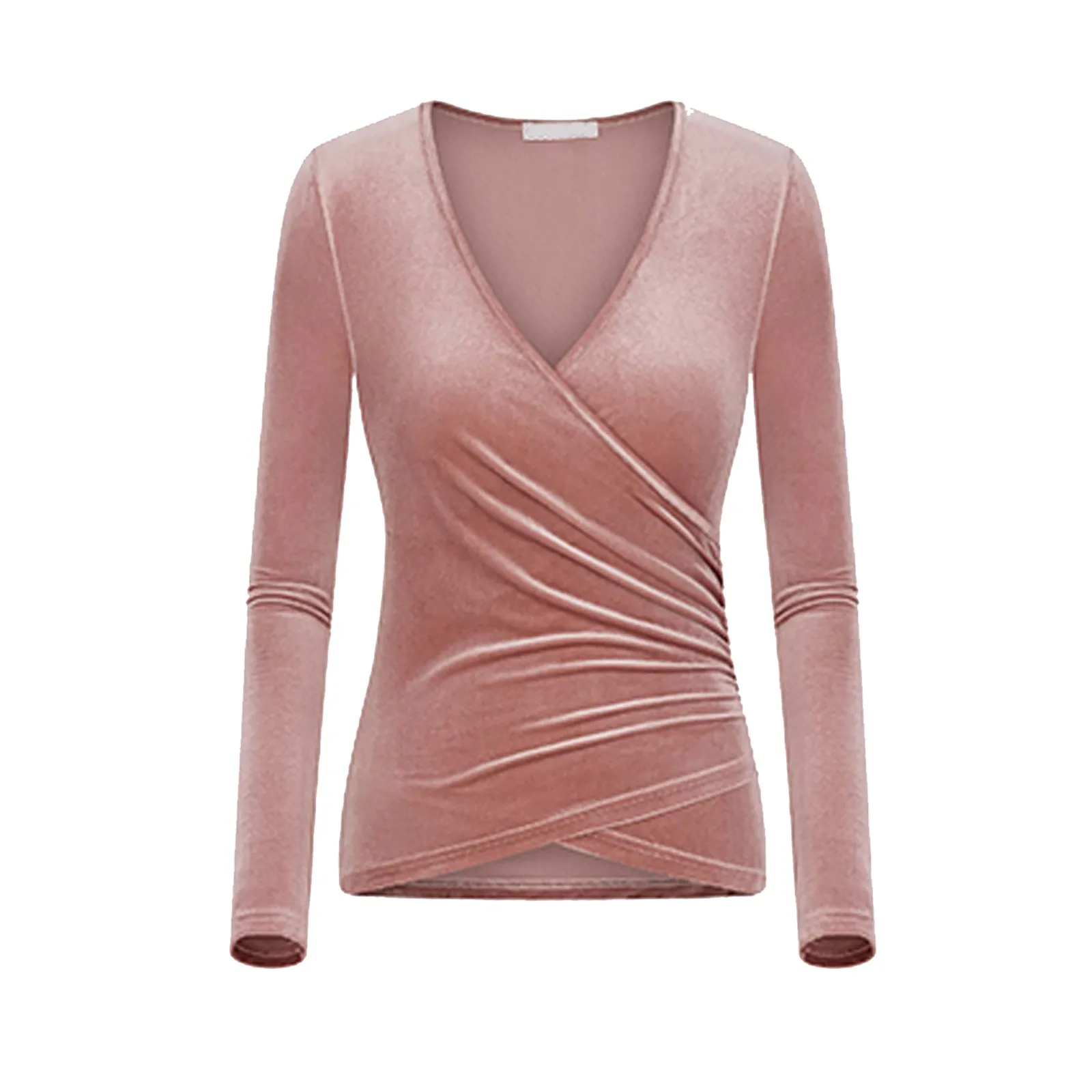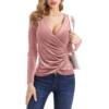 Women Deep V Neck Long Sleeve Velvet Unique Cross Wrap Sexy Slim Fit Tops