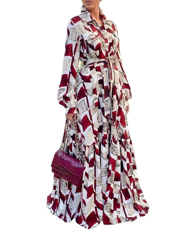 African Shirt Maxi Dress Women High Waist Full Sleeve Robes Fashion Chiffon Print Elegant Streetwear Dresses Vestidos