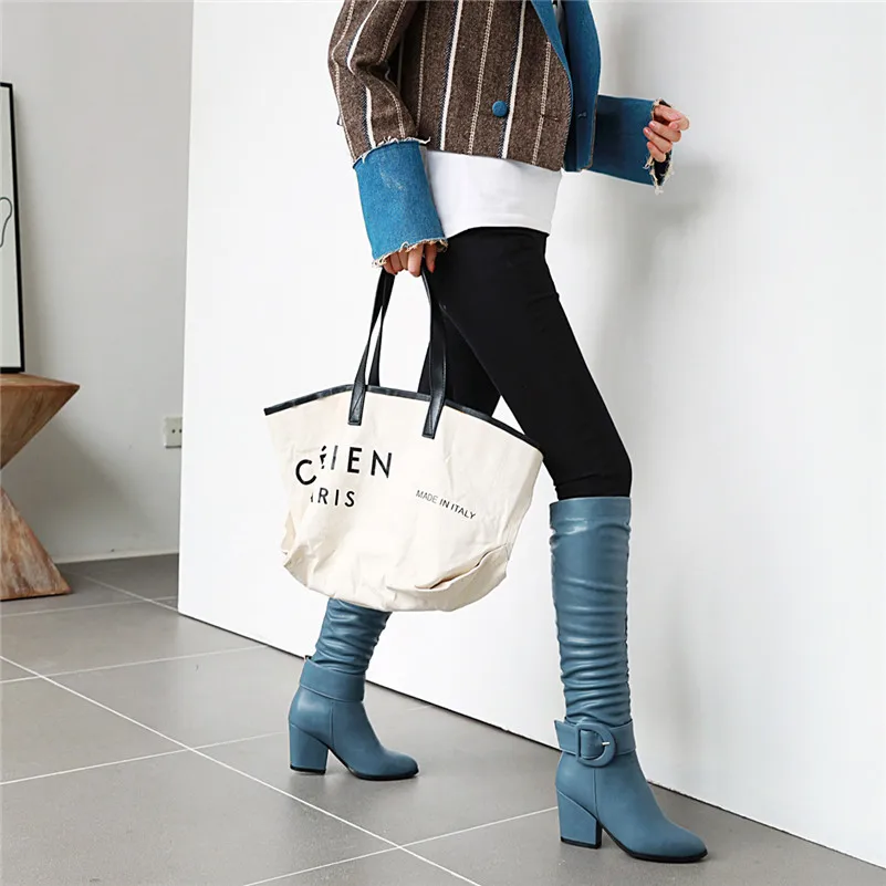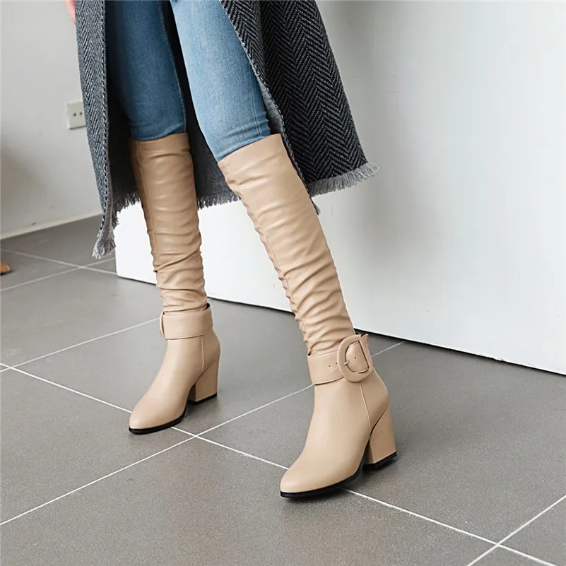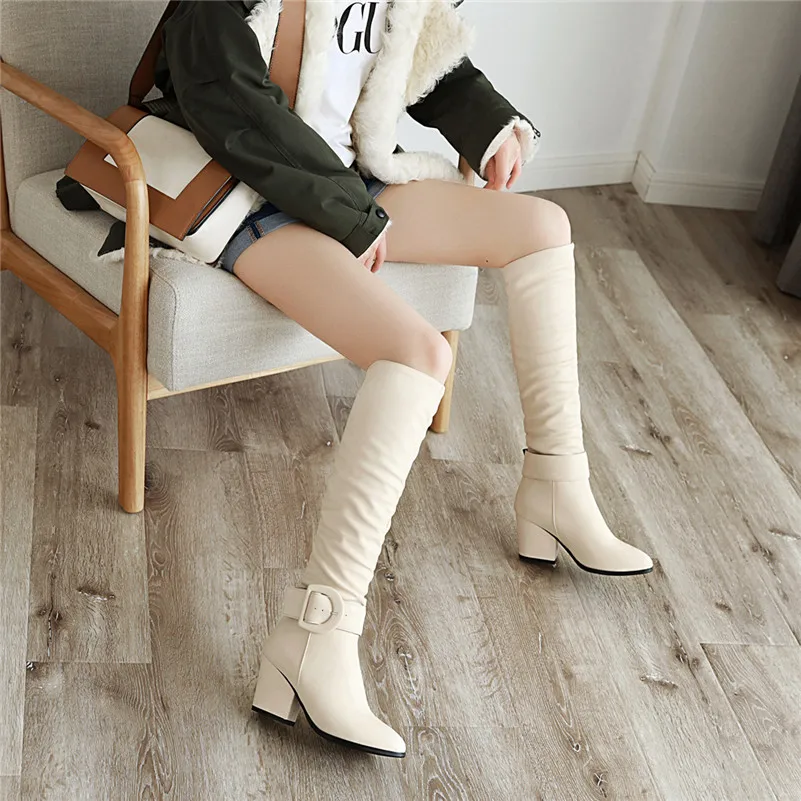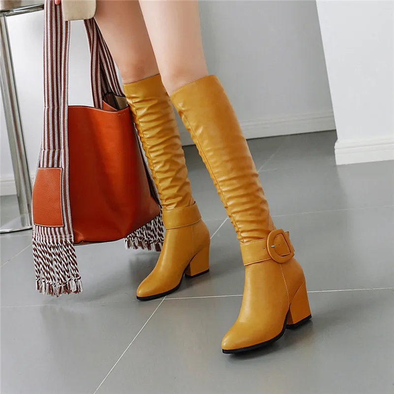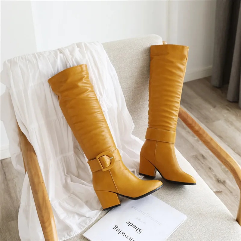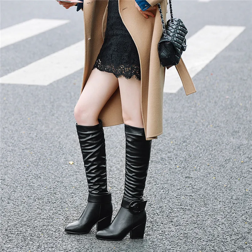 ANNYMOLI Winter Knee High Boots Women Buckle Square High Heels Long Boots Pleated Pointed Toe Shoes Lady Autumn Large Size 3-12