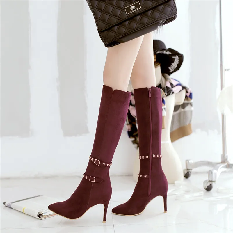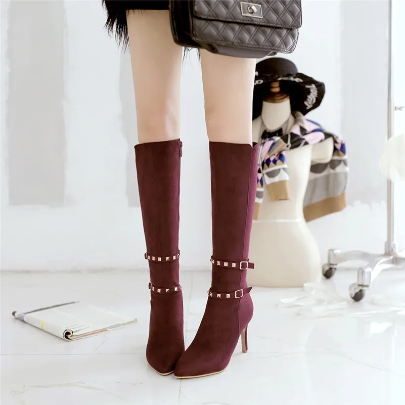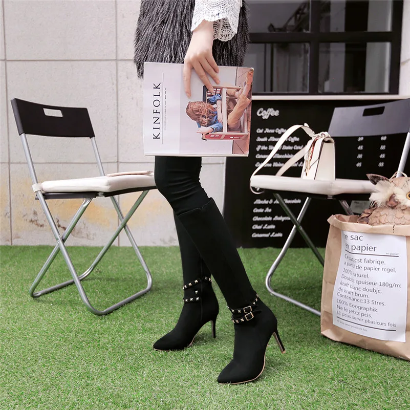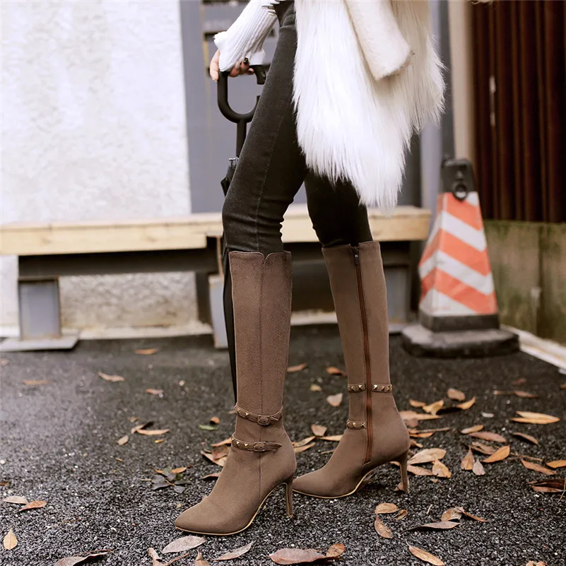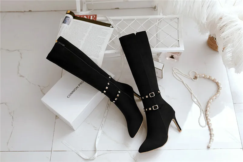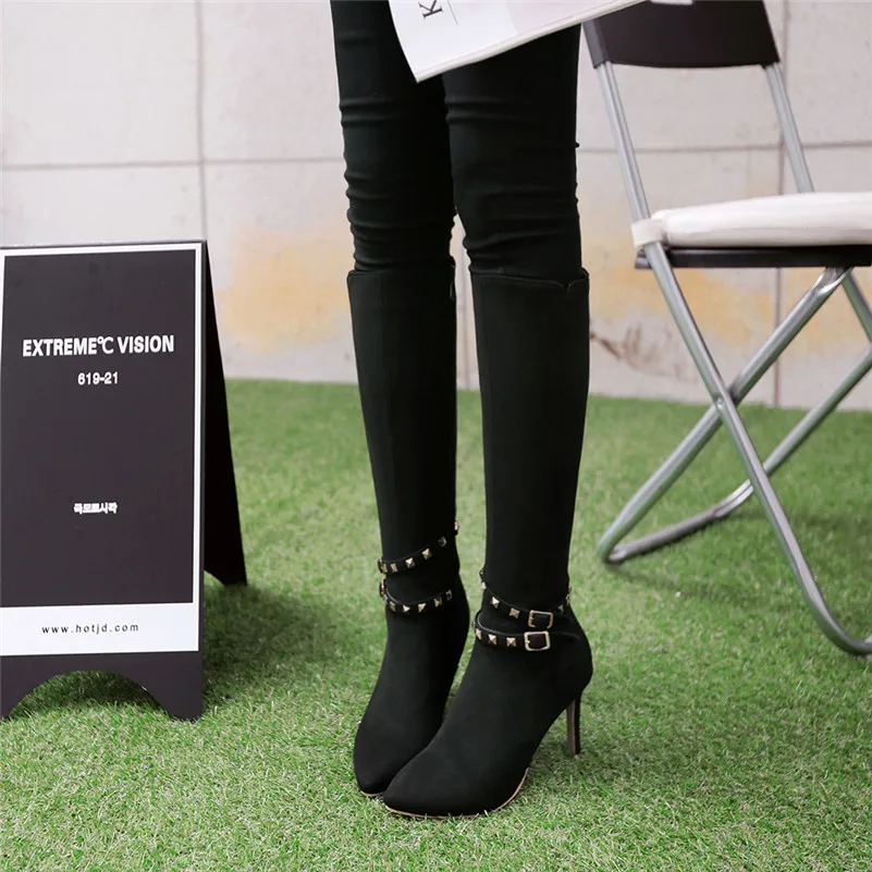 ANNYMOLI Winter Knee High Boots Women Rivets Zipper Thin Heel Tall Boots Buckle Super High Heel Shoes Ladies Fall Big Size 33-43