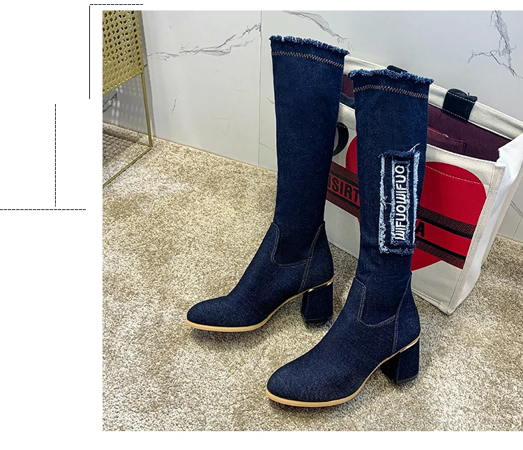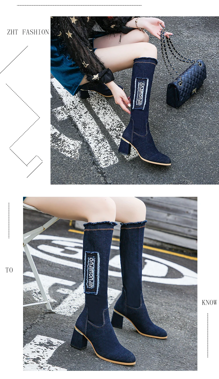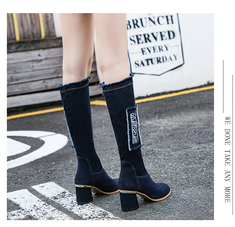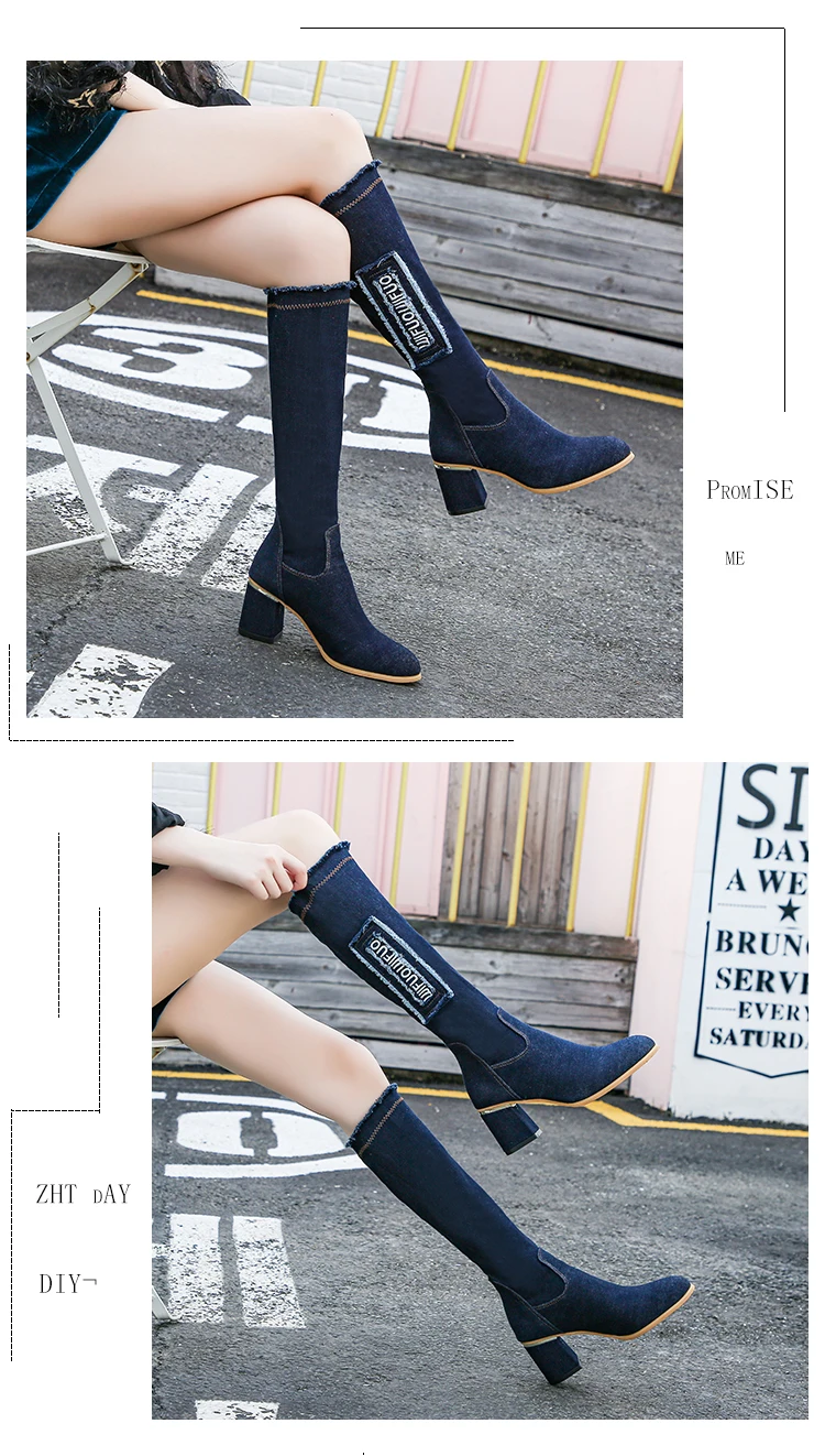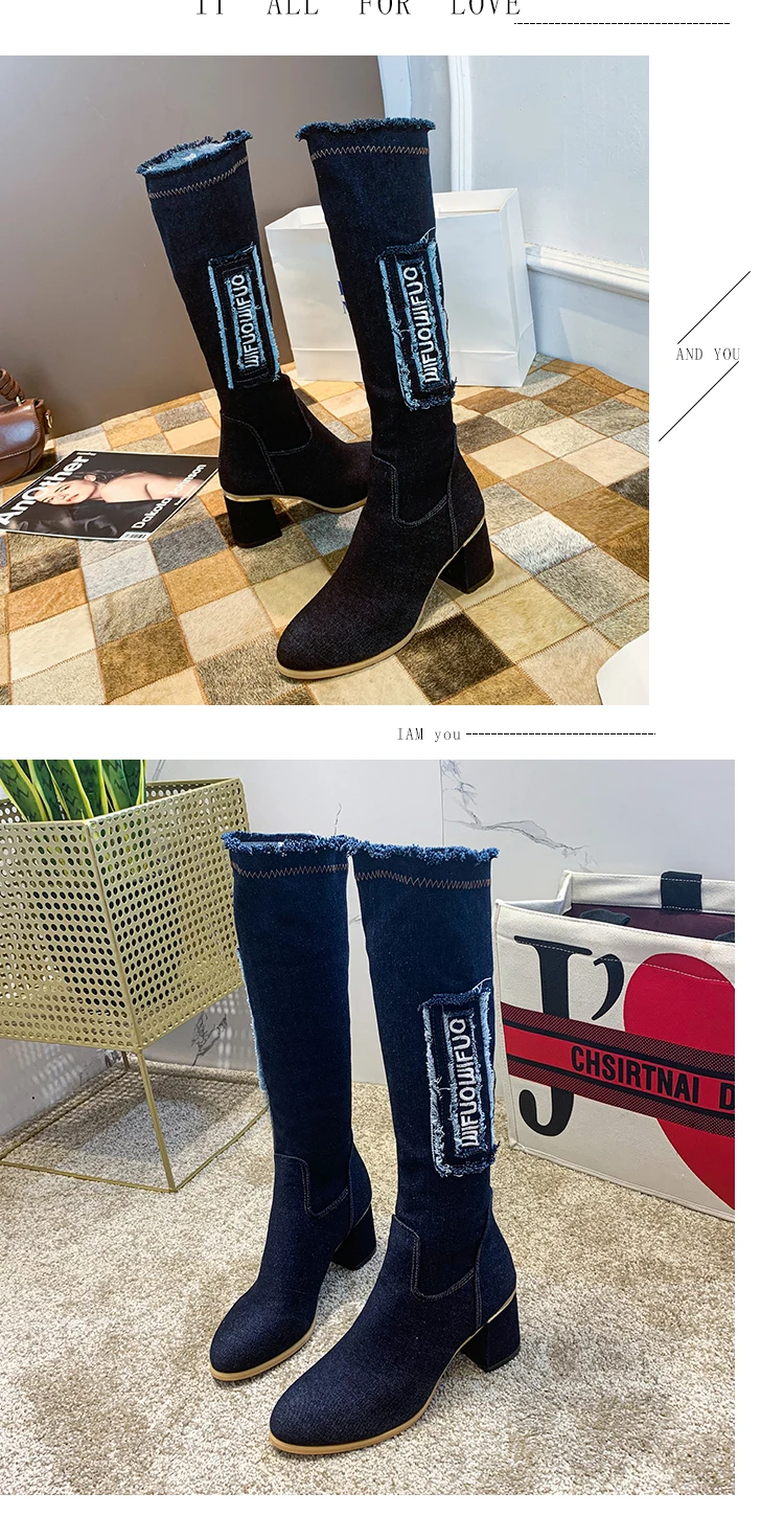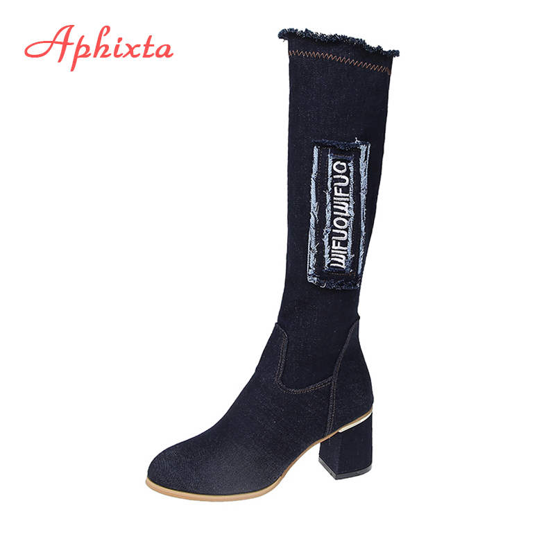 Aphixta 2020 New Denim Shoes Women Knee-High Boots 6.5cm Square Heels Winter Long Boot Round Toe Girls Shoe Big Size 41