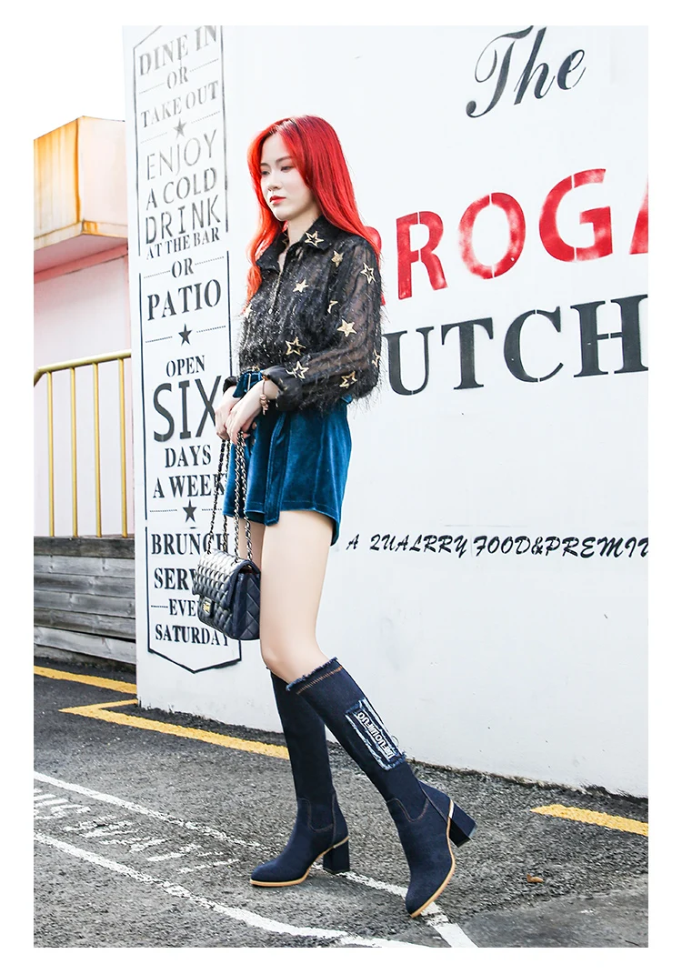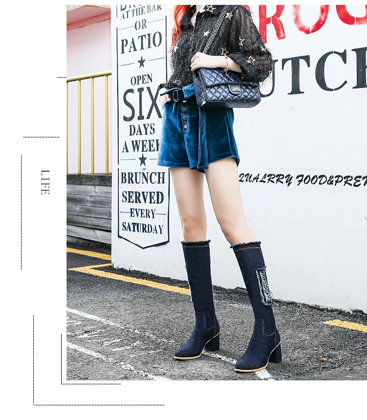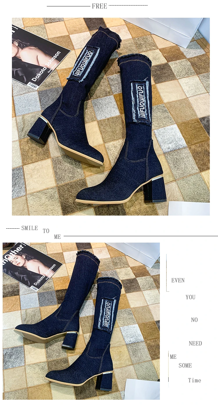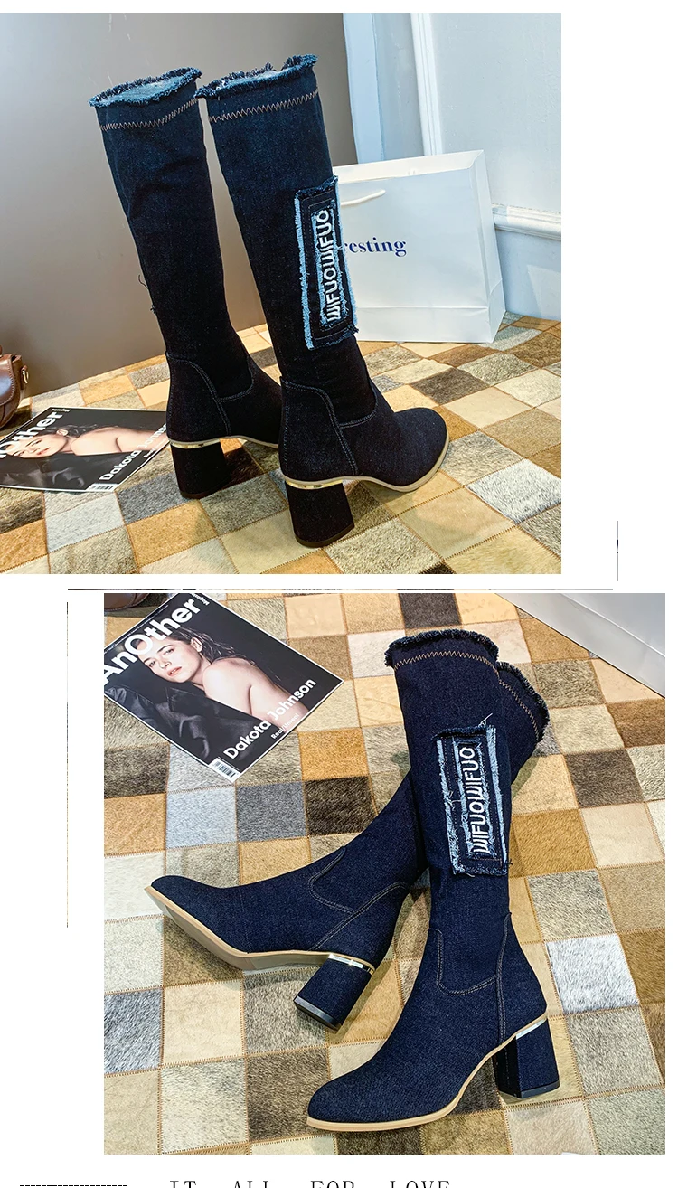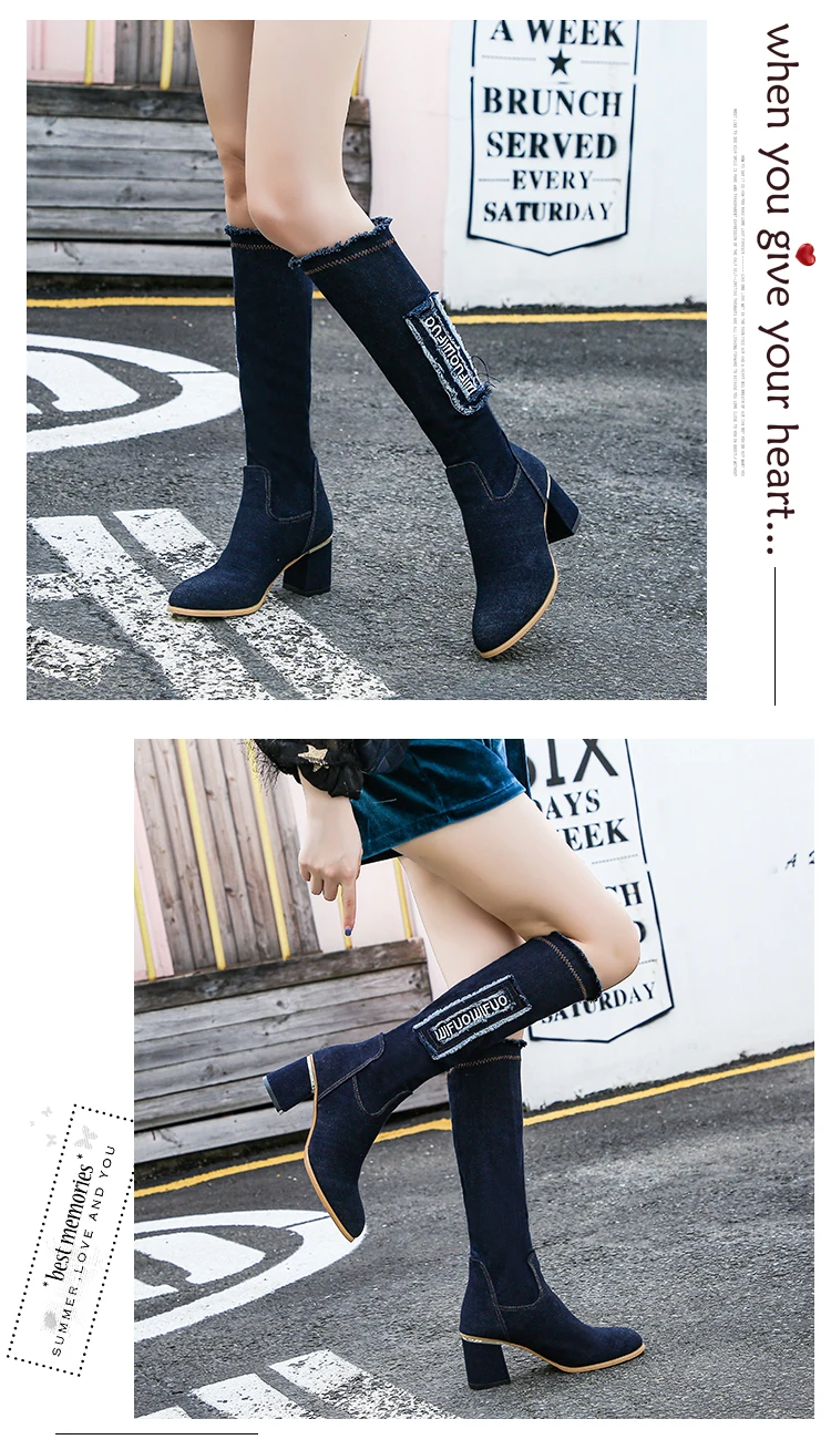 Aphixta 2020 New Denim Shoes Women Knee-High Boots 6.5cm Square Heels Winter Long Boot Round Toe Girls Shoe Big Size 41