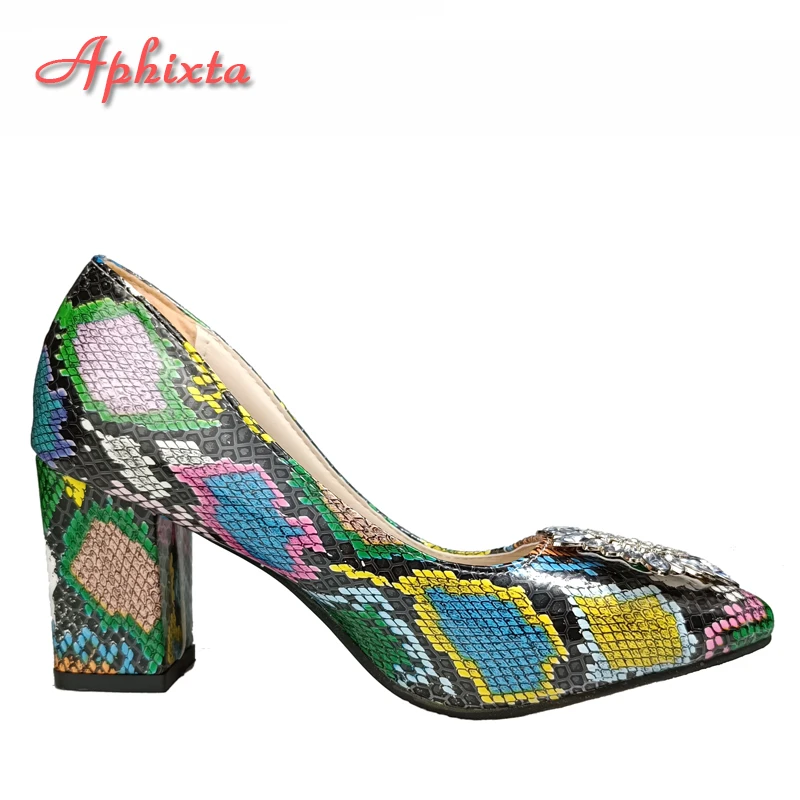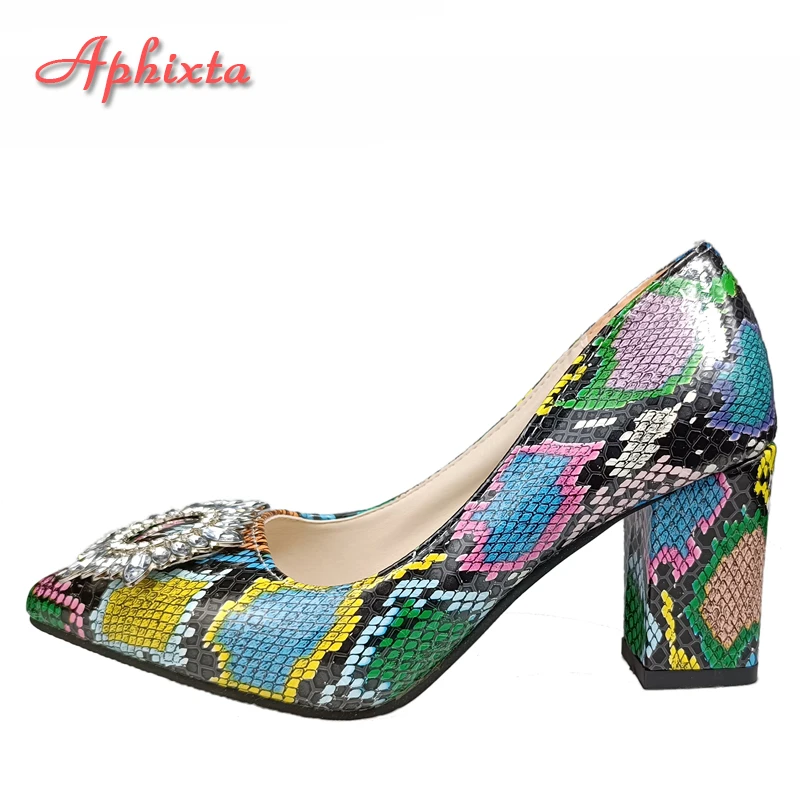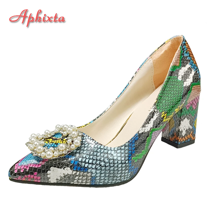 Aphixta 2022 Snake Prints 7cm Square Heels Pumps Women Shoes Crystal Pearl Sunflower Buckle Party Leisure Big Szie 35-46
