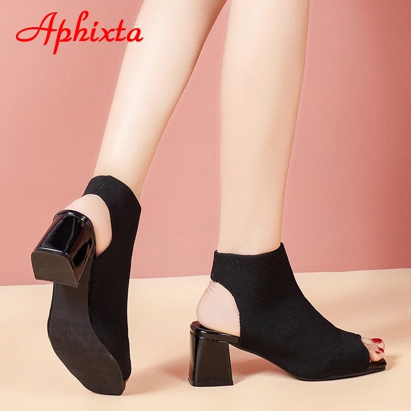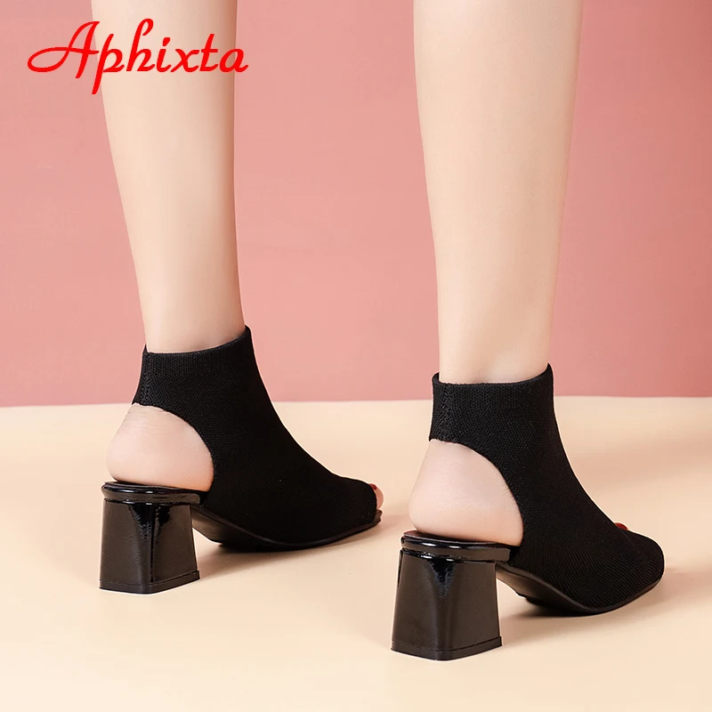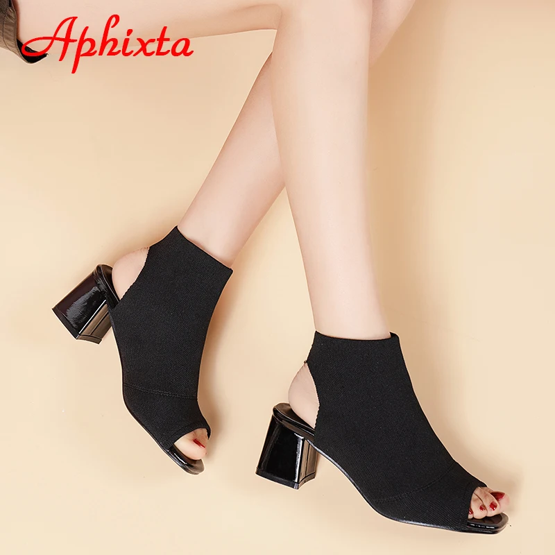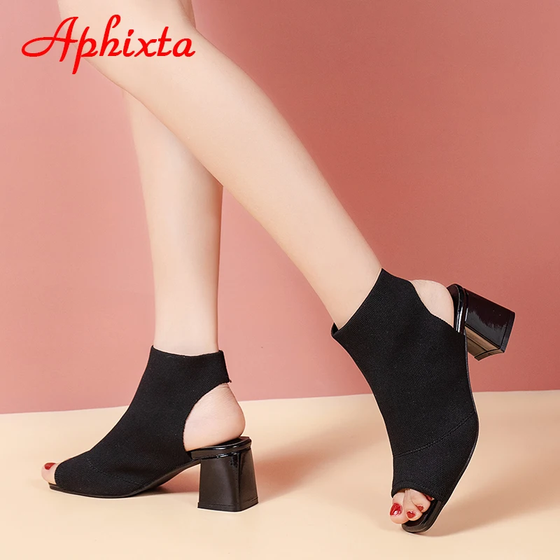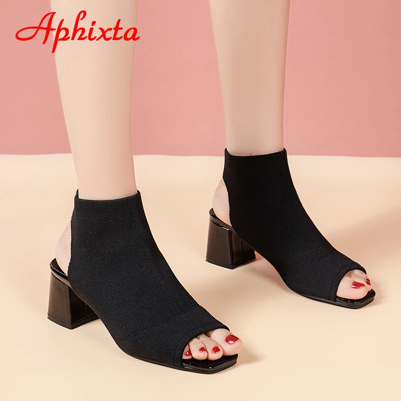 Aphixta 2022 Summer Breathable Peep Toe Cotton Fabric Sandals Women Socks Boots 5.5cm Square Heels Cool Boots Plus Size 41