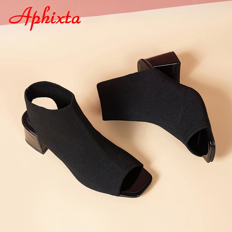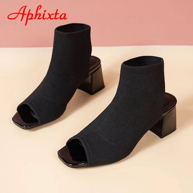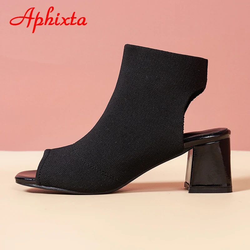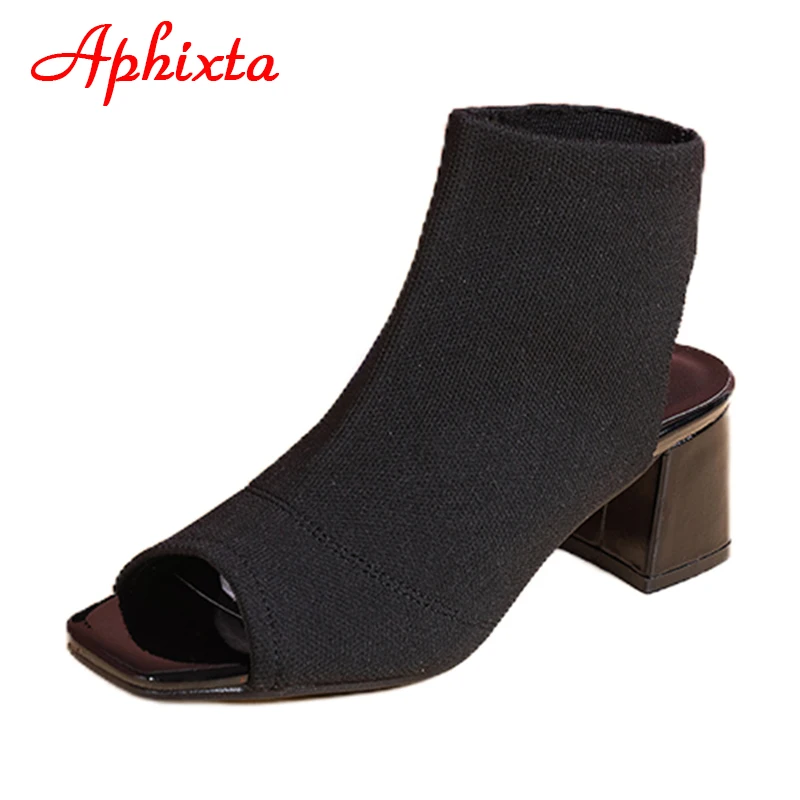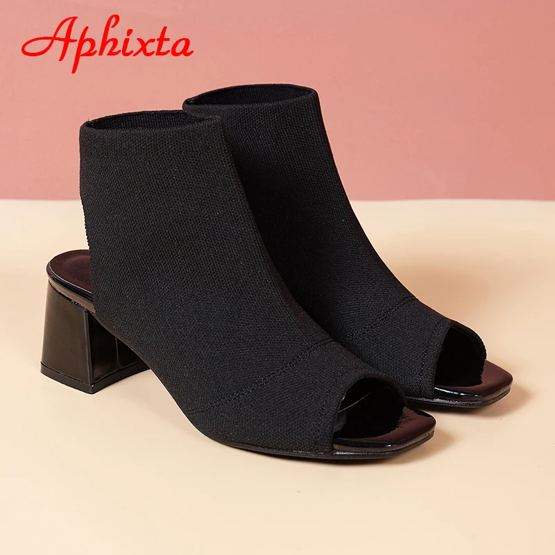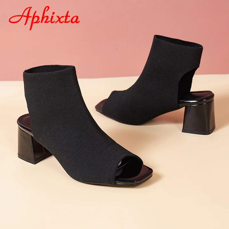 Aphixta 2022 Summer Breathable Peep Toe Cotton Fabric Sandals Women Socks Boots 5.5cm Square Heels Cool Boots Plus Size 41