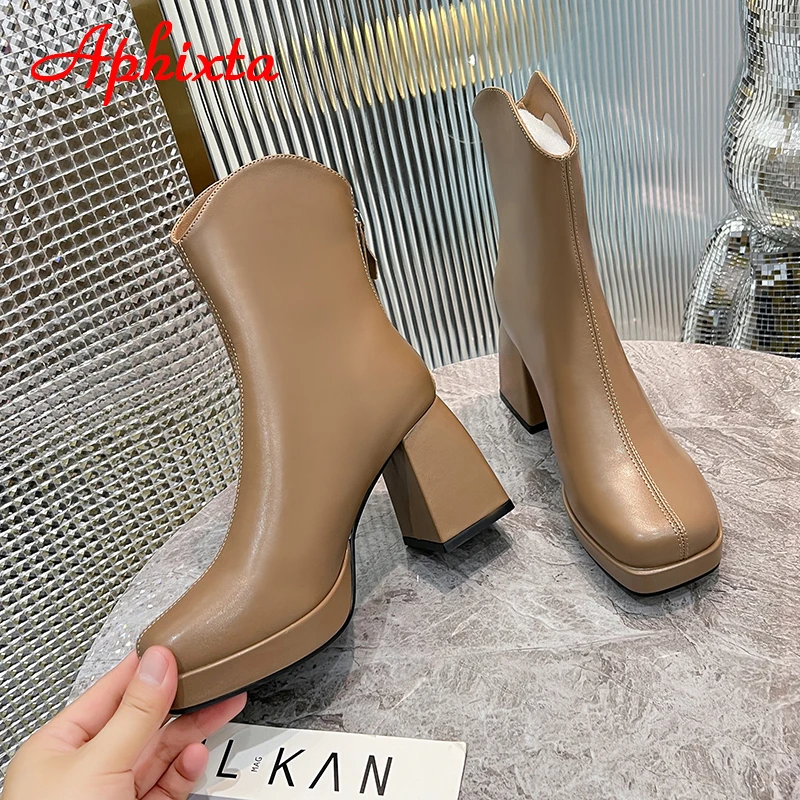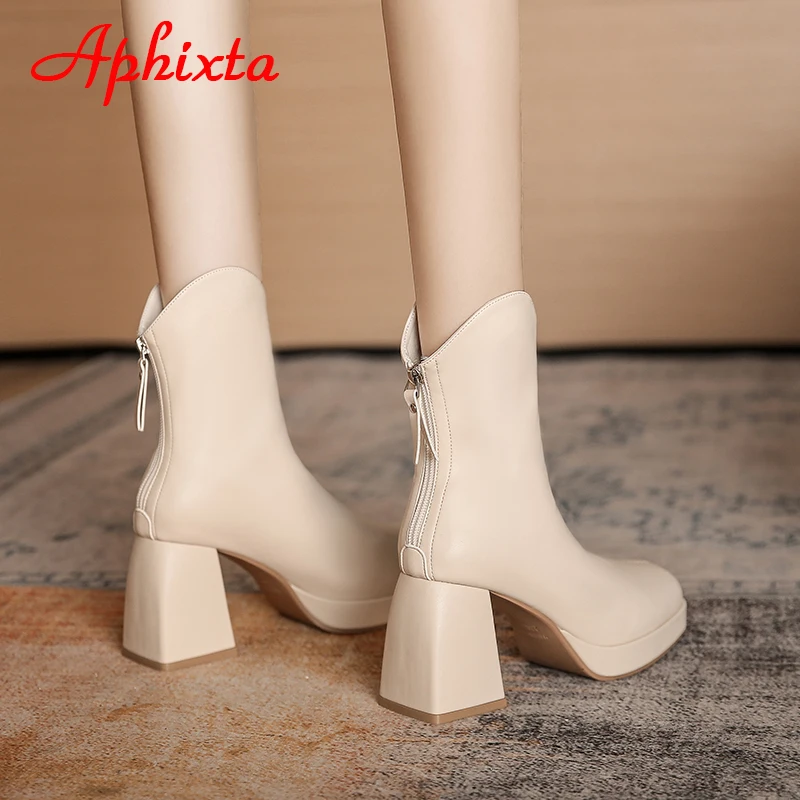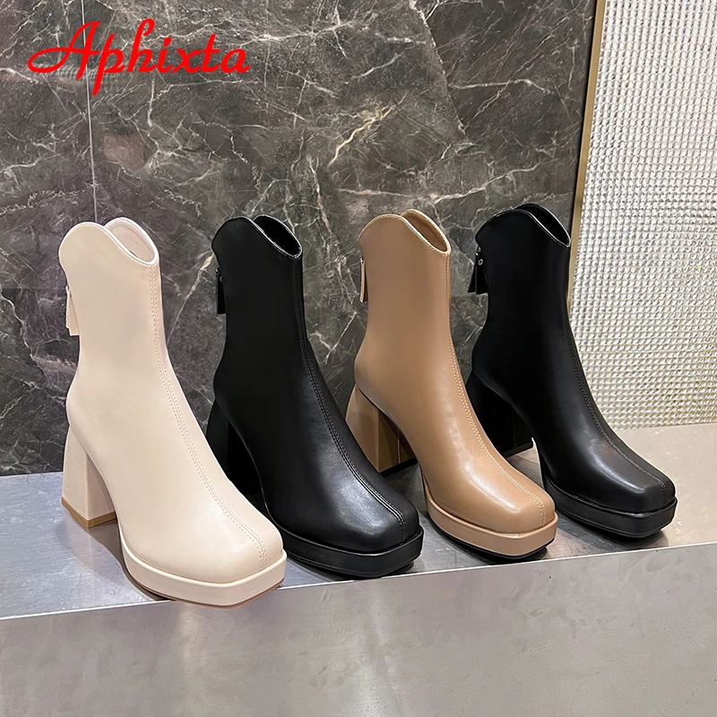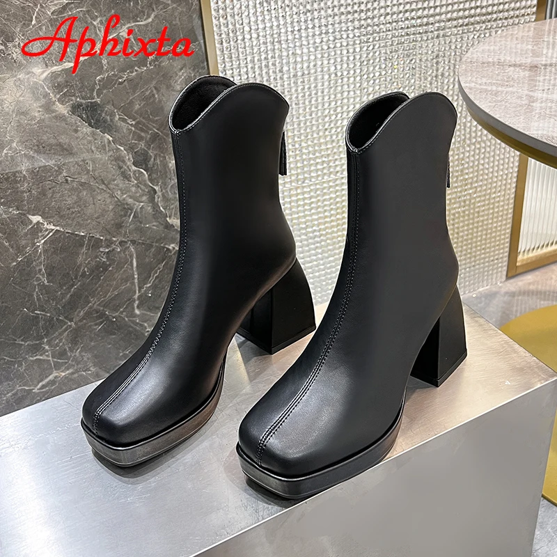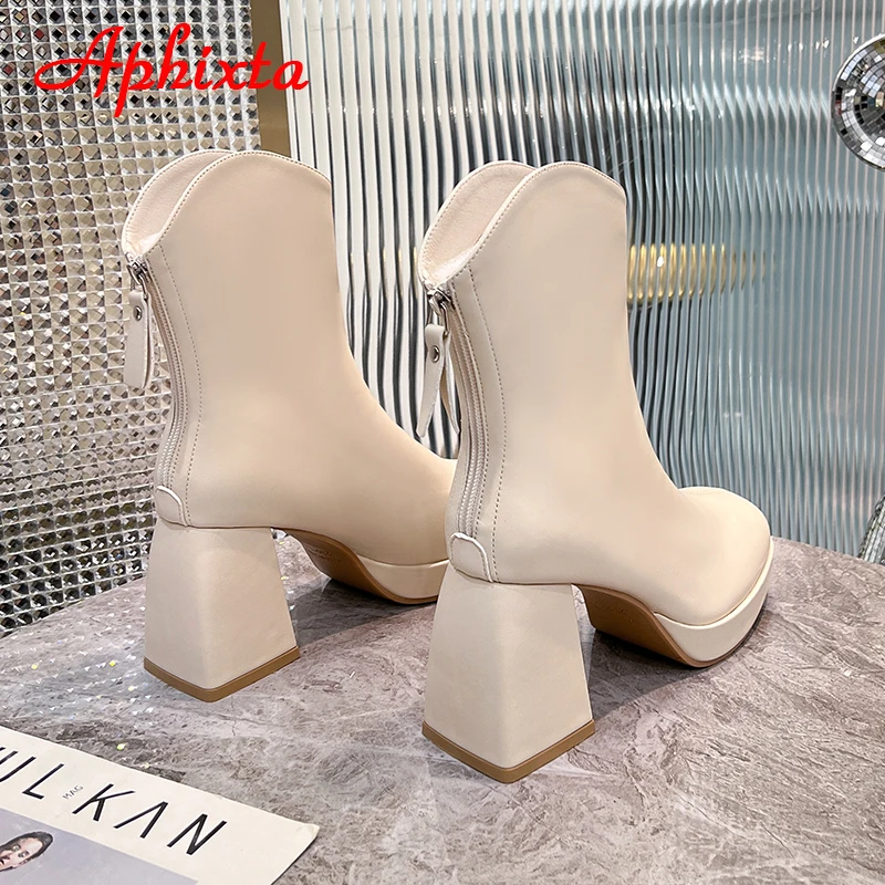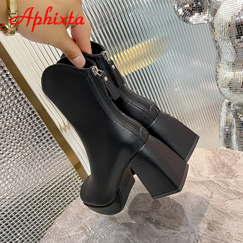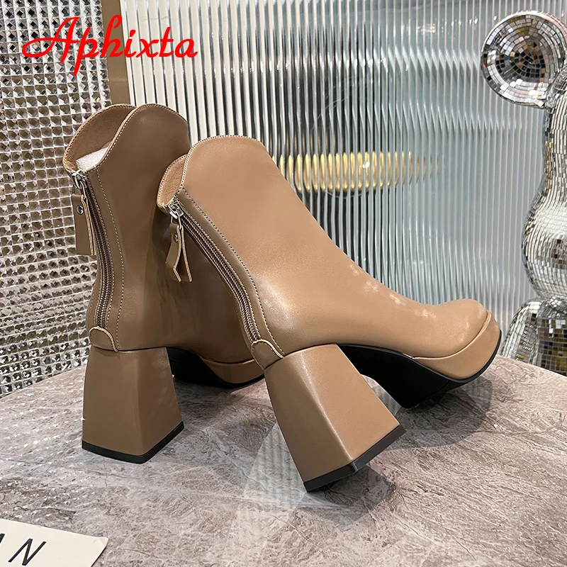 Aphixta 2022 Winter Warm Platform Short Ankle Boots Women 8cm Square Heel Back Fringe Zip Lady Footwear Shoes Big Size 43
