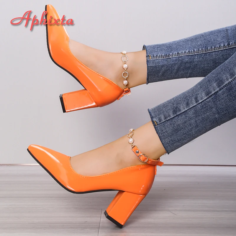 Aphixta 2023 New Luxury Rhinestone Pearl Chain 7cm Chunky Heels Pumps Women Shoes String Bead Pointed Toe Bling Crystals Pumps