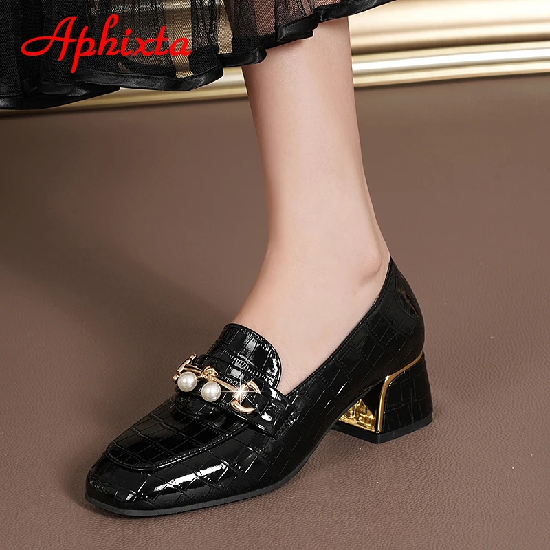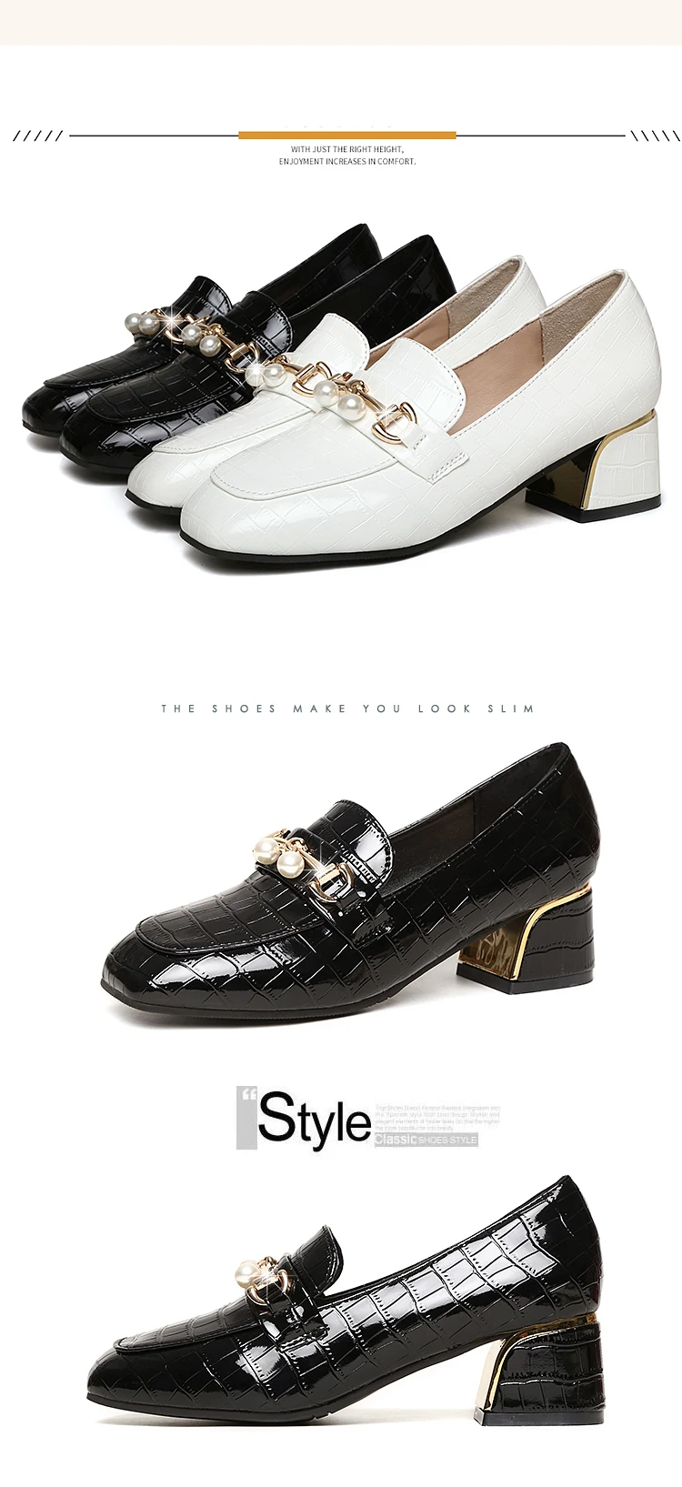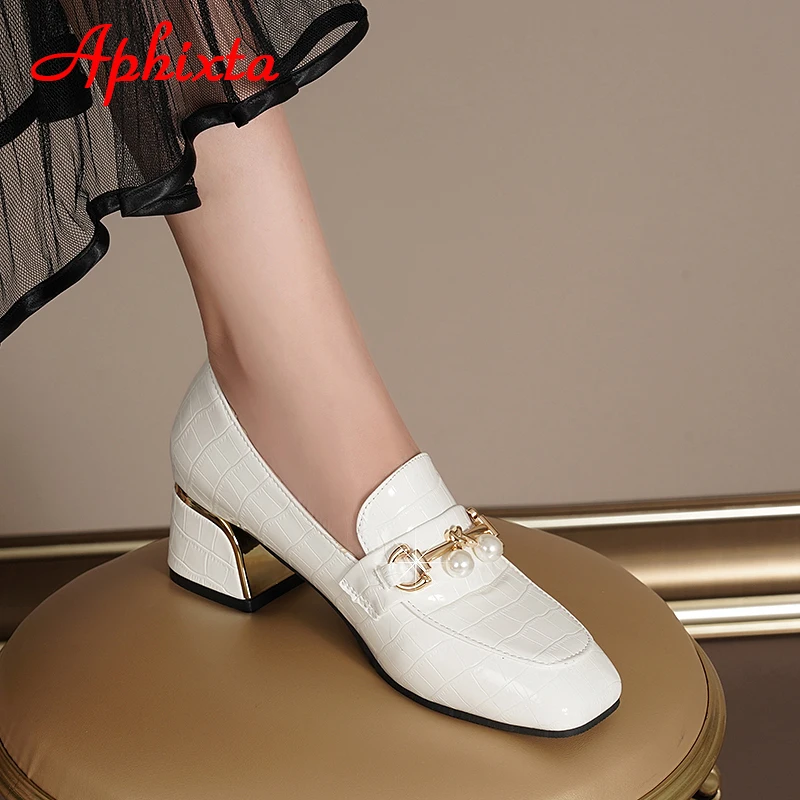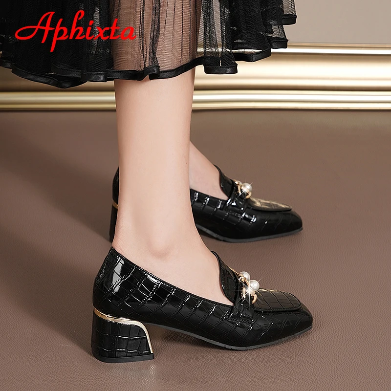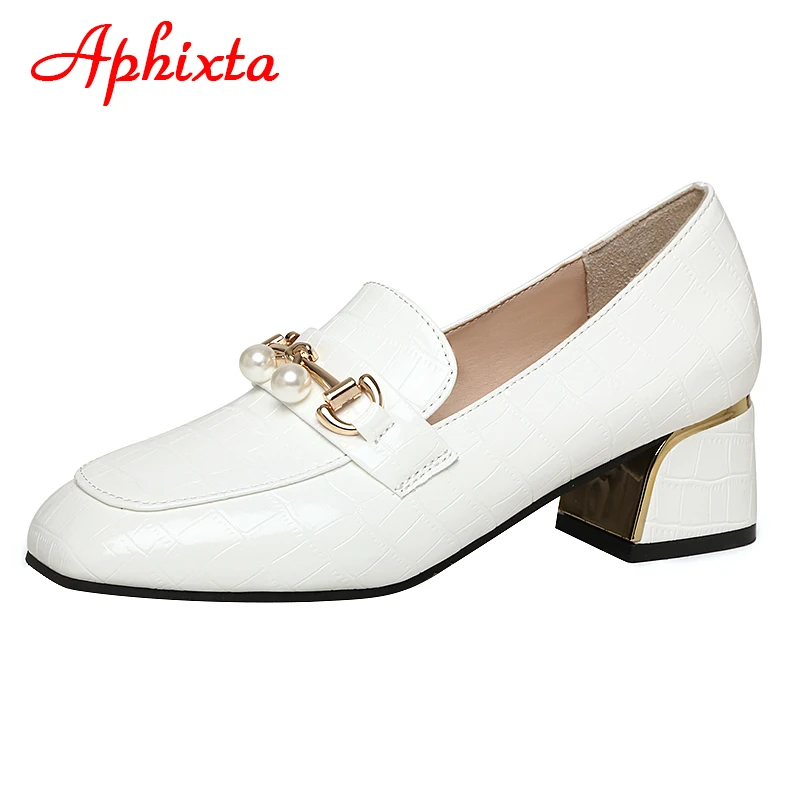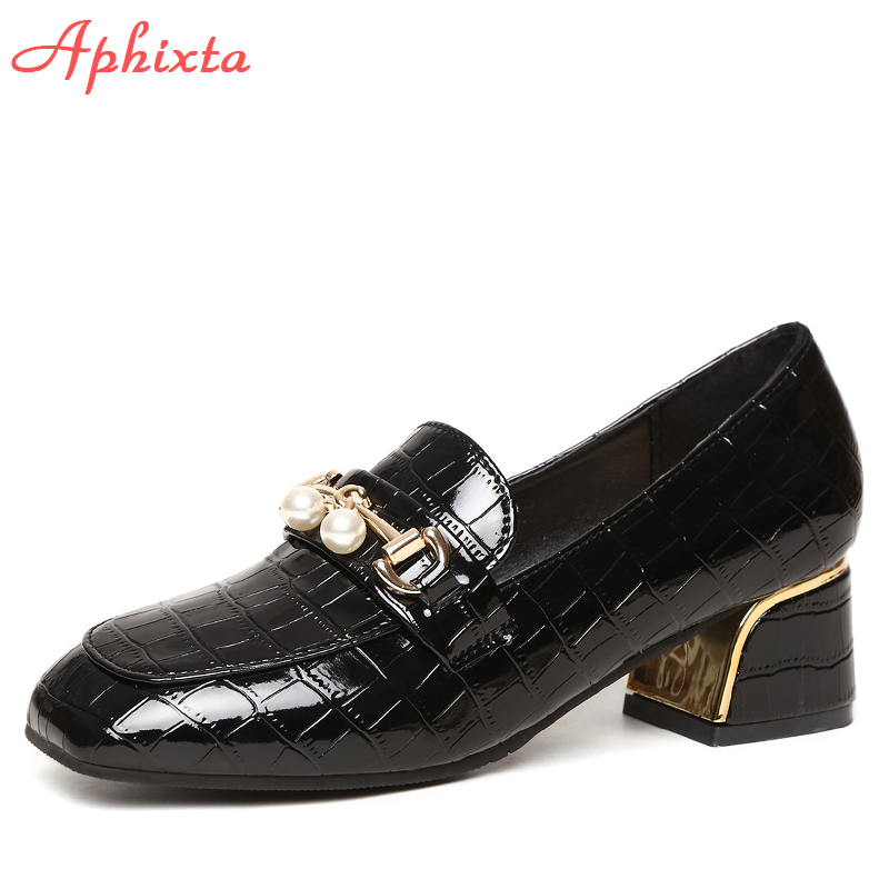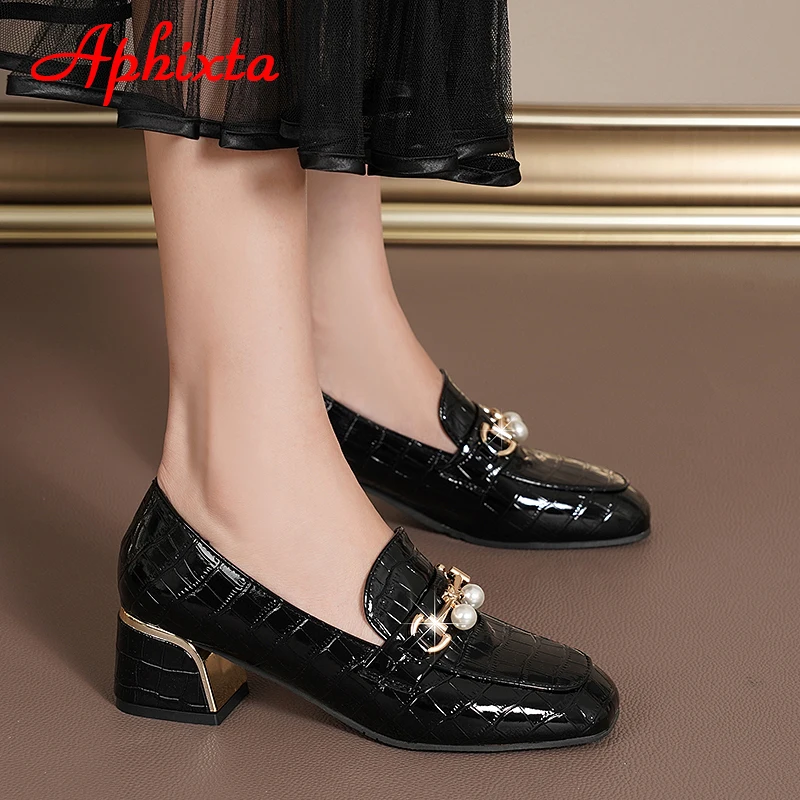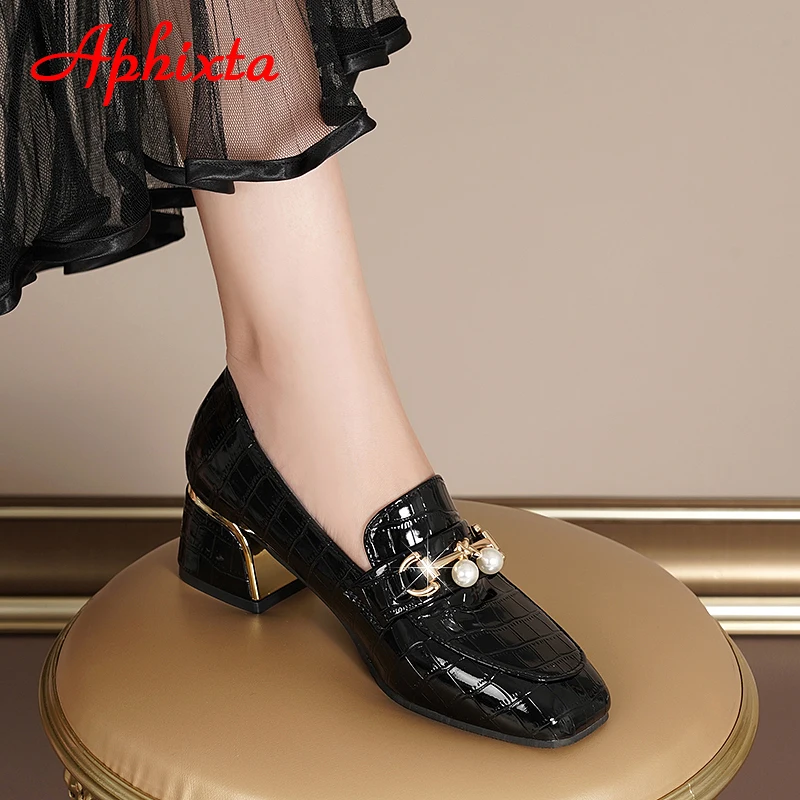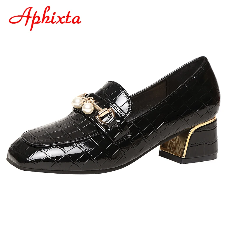 Aphixta 5cm Square Heels Pumps Patent Leather Pearl Buckle Shoes Girls Classics Toe Mary Janes Official Pumps Party Big Size 42
