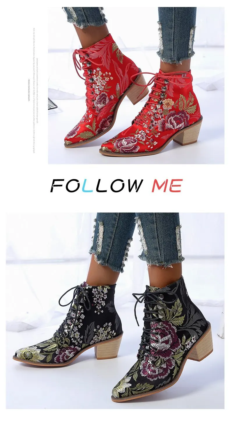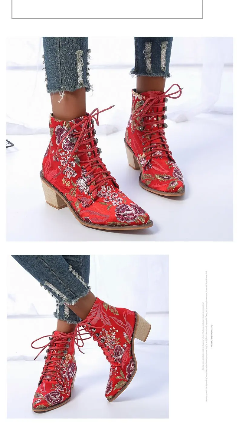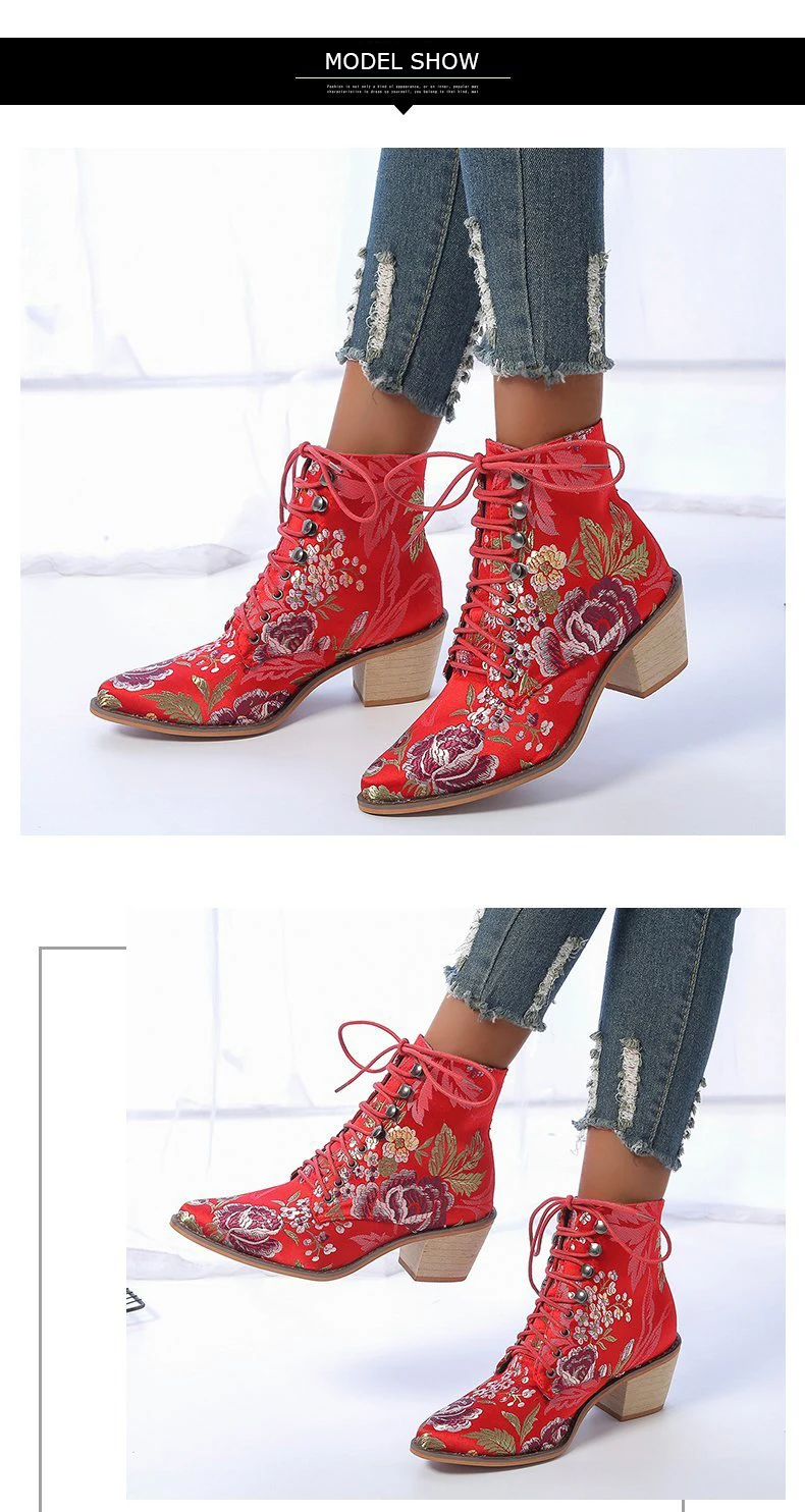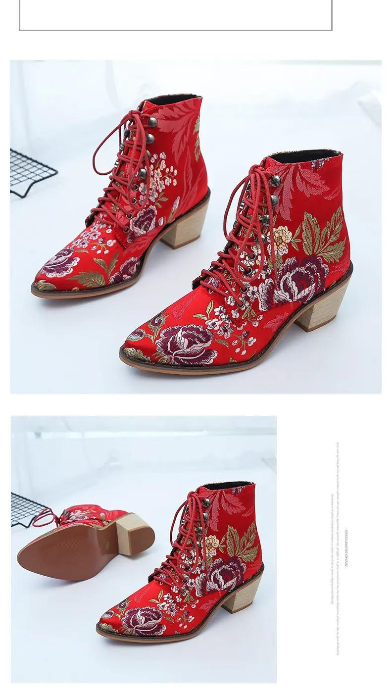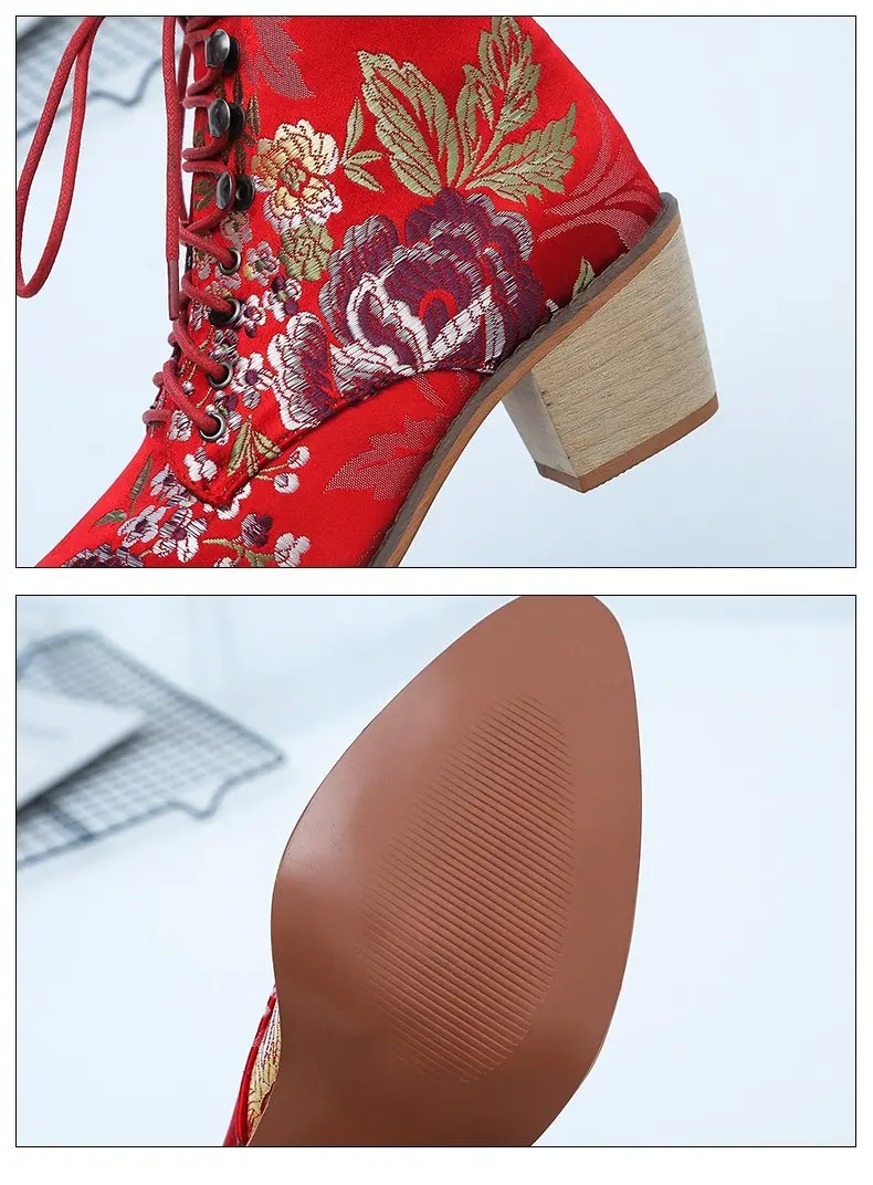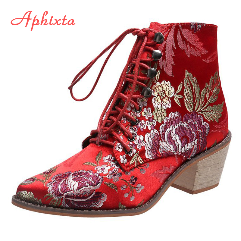 Aphixta 6cm Wood Spike Heels Embroider Boots Women Antiskid Lace-up Pointed Toe Red Ankle Boots Shoes Woman Boats Big Szie 43