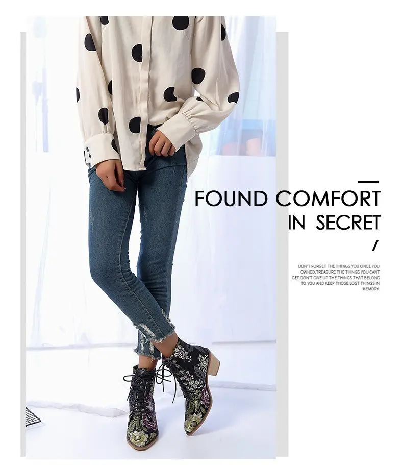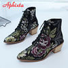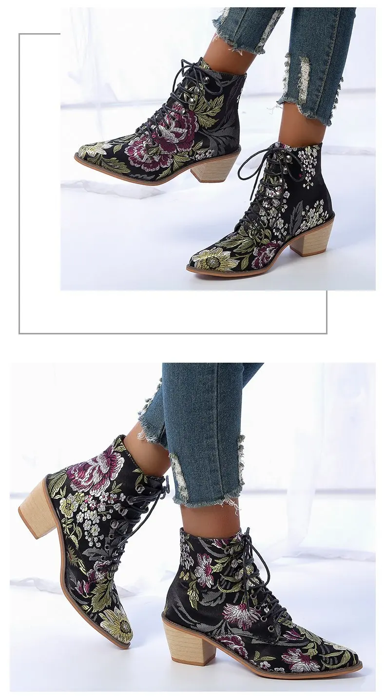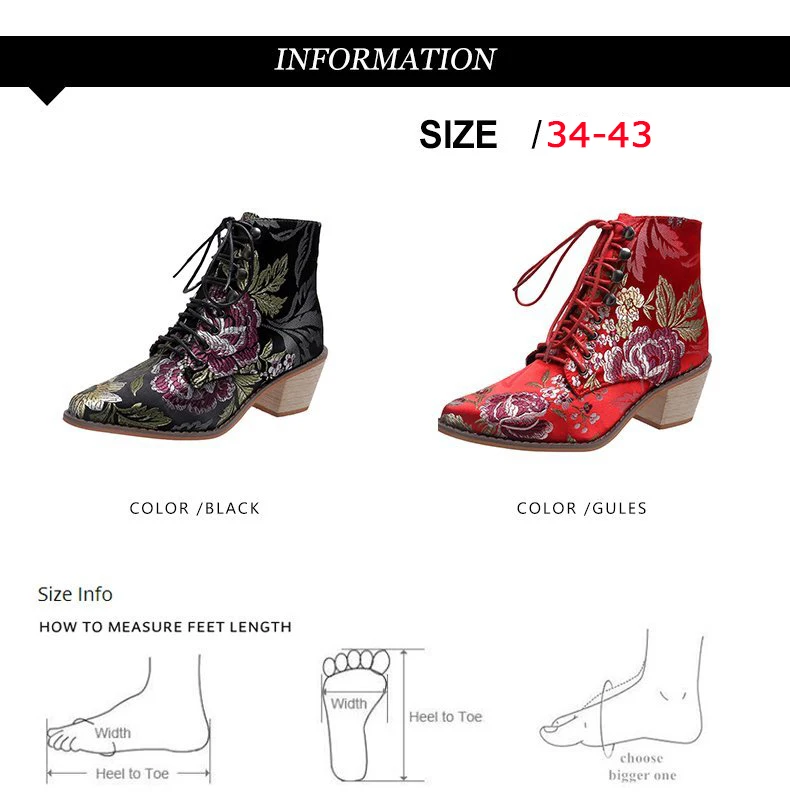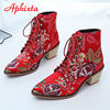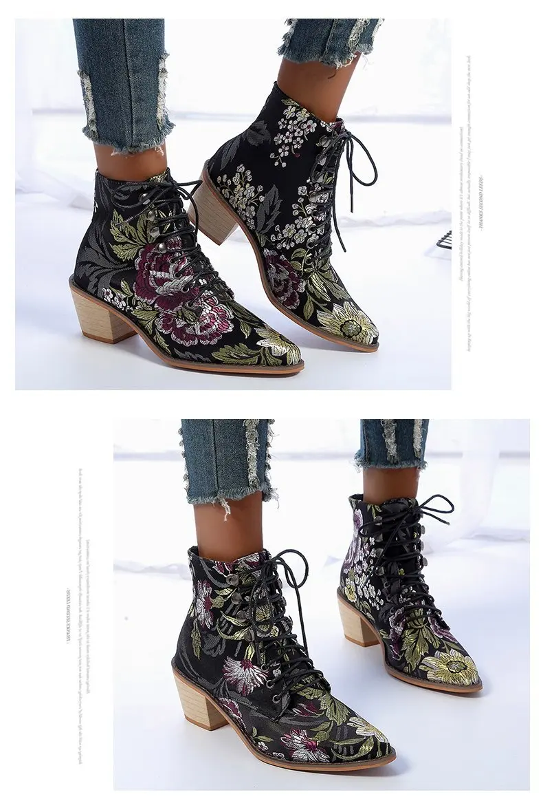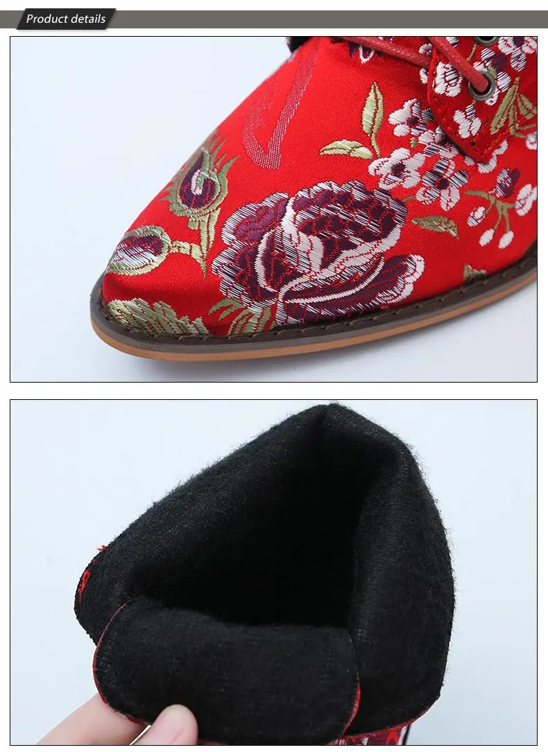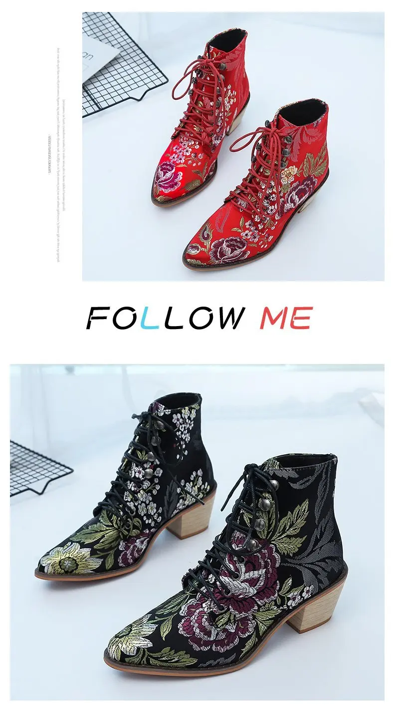 Aphixta 6cm Wood Spike Heels Embroider Boots Women Antiskid Lace-up Pointed Toe Red Ankle Boots Shoes Woman Boats Big Szie 43