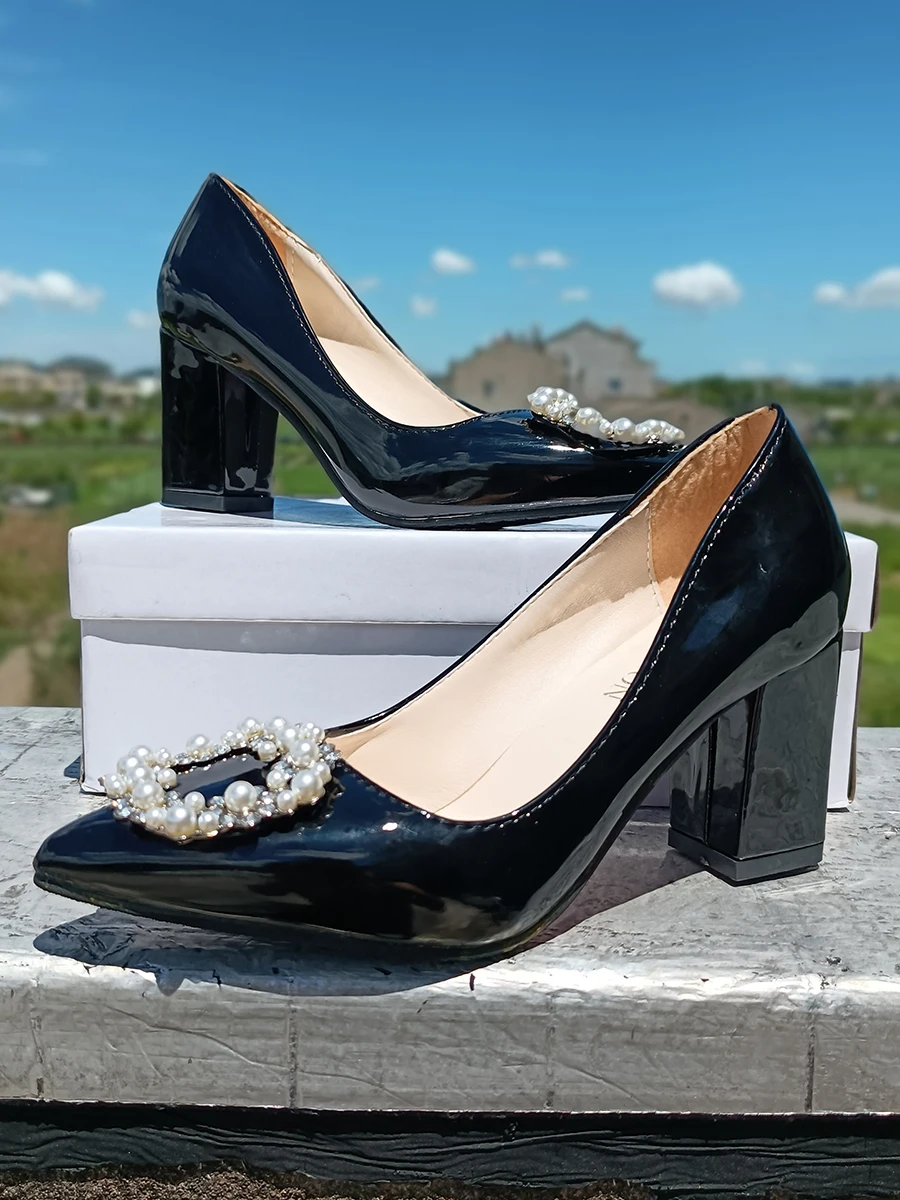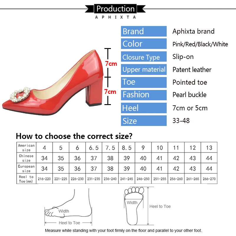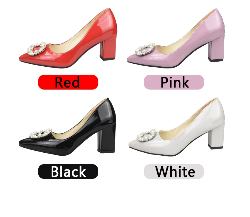 Aphixta 7cm 5cm Square Heels Patent Leather Pearl Buckle Shoes Woman Classics Pointed Toe Dress Official Pumps Party Big Size 48