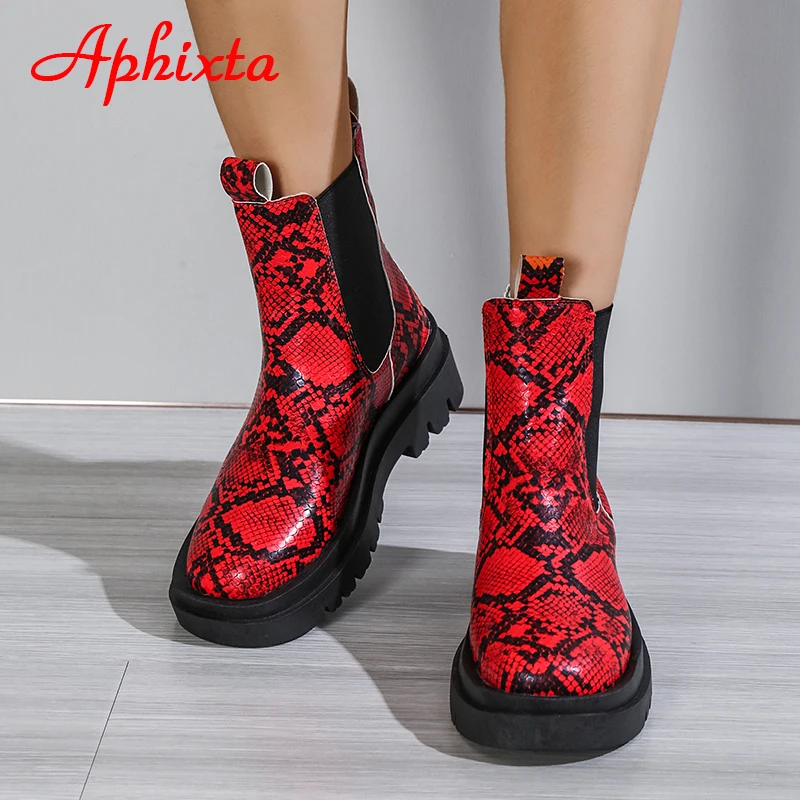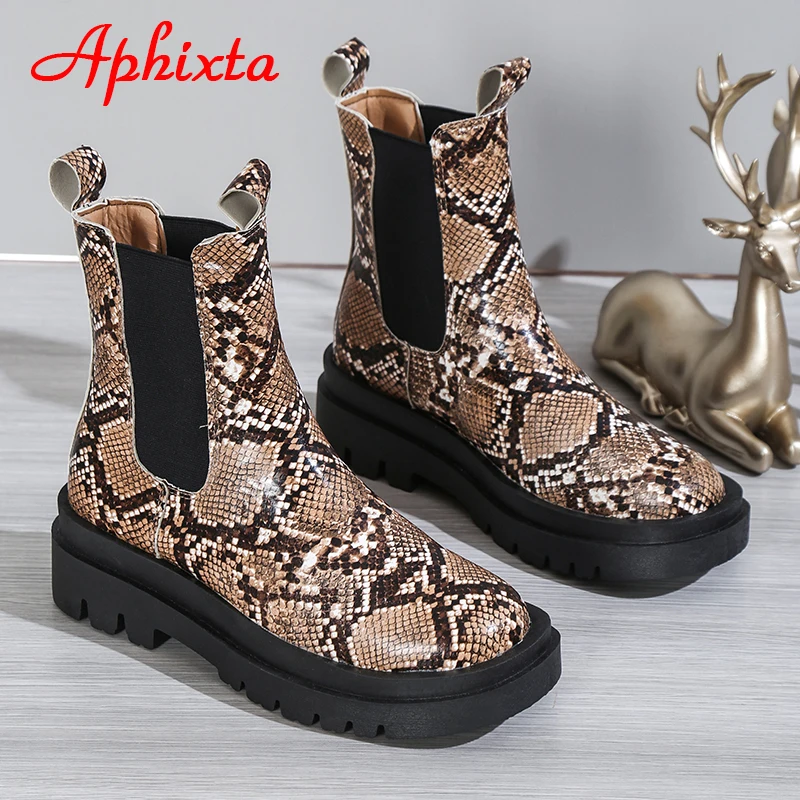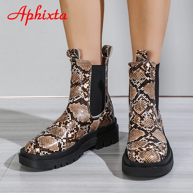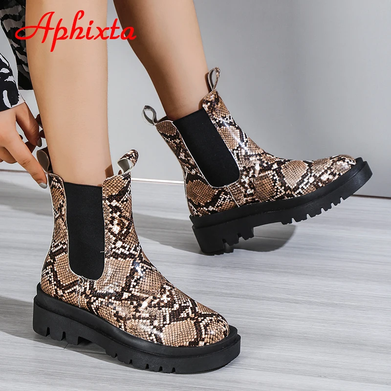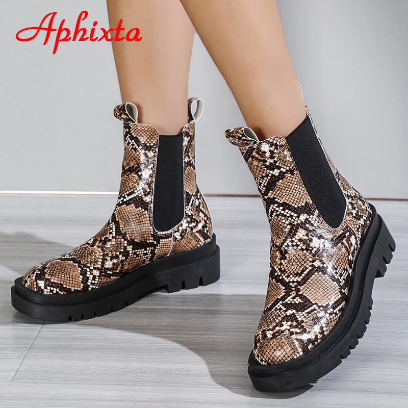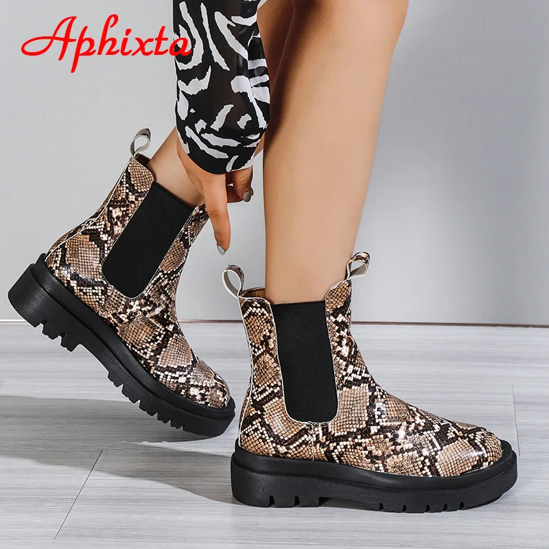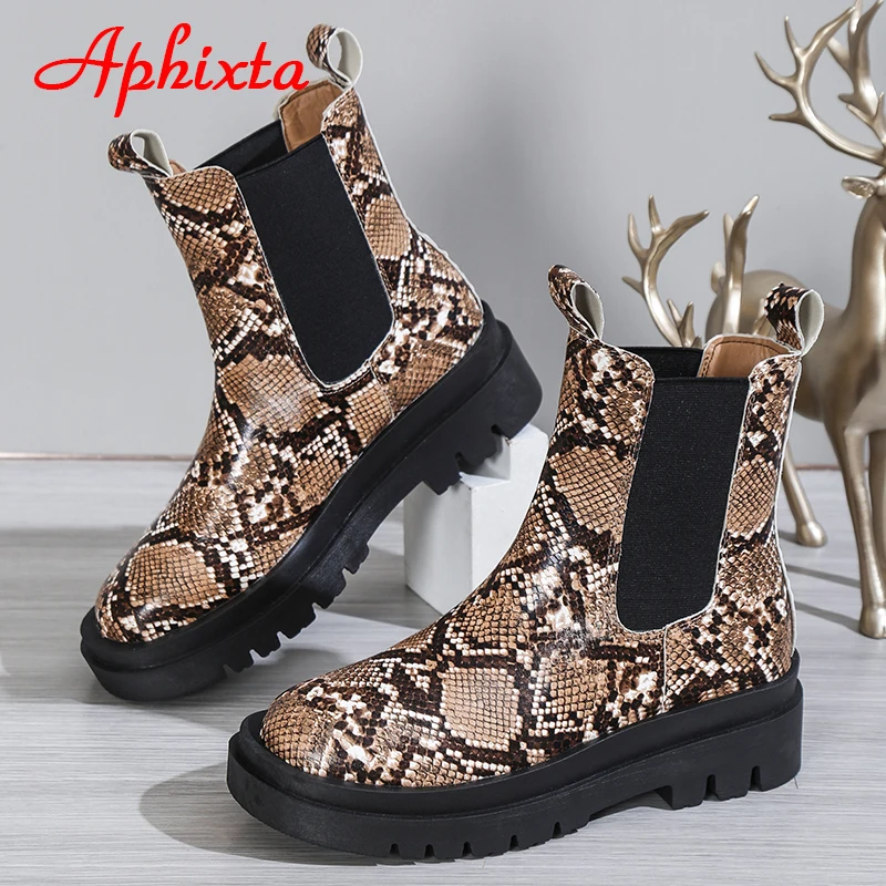 Aphixta Double Layer Women Short Boots Snake Prints Elastic Band Ankle Boots Casual Punk Shoes Motorcycle Boots Plus Size 43