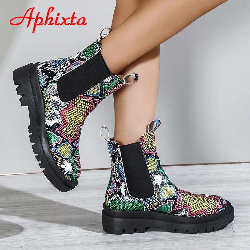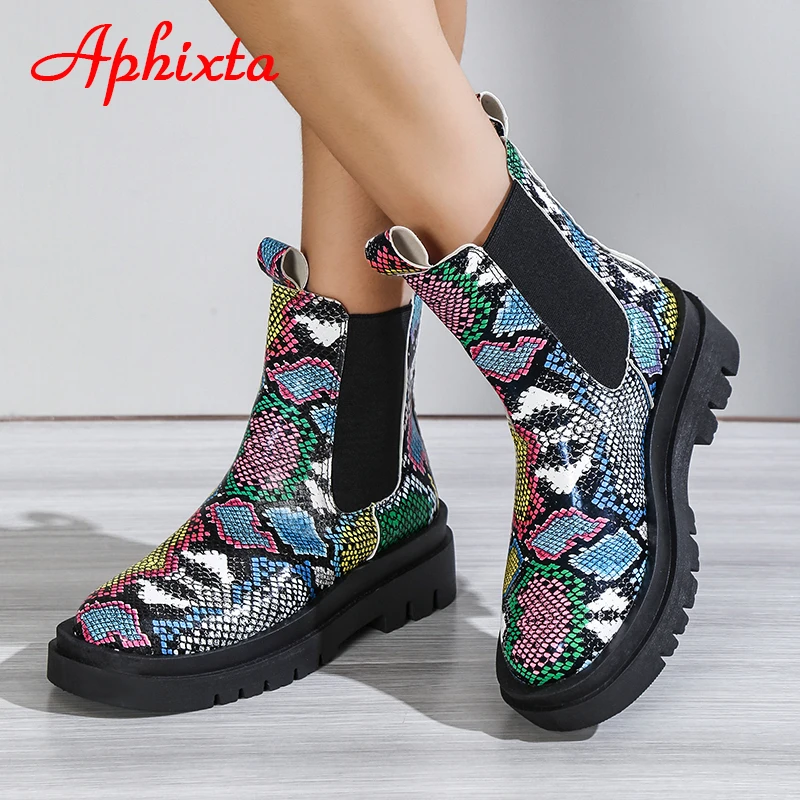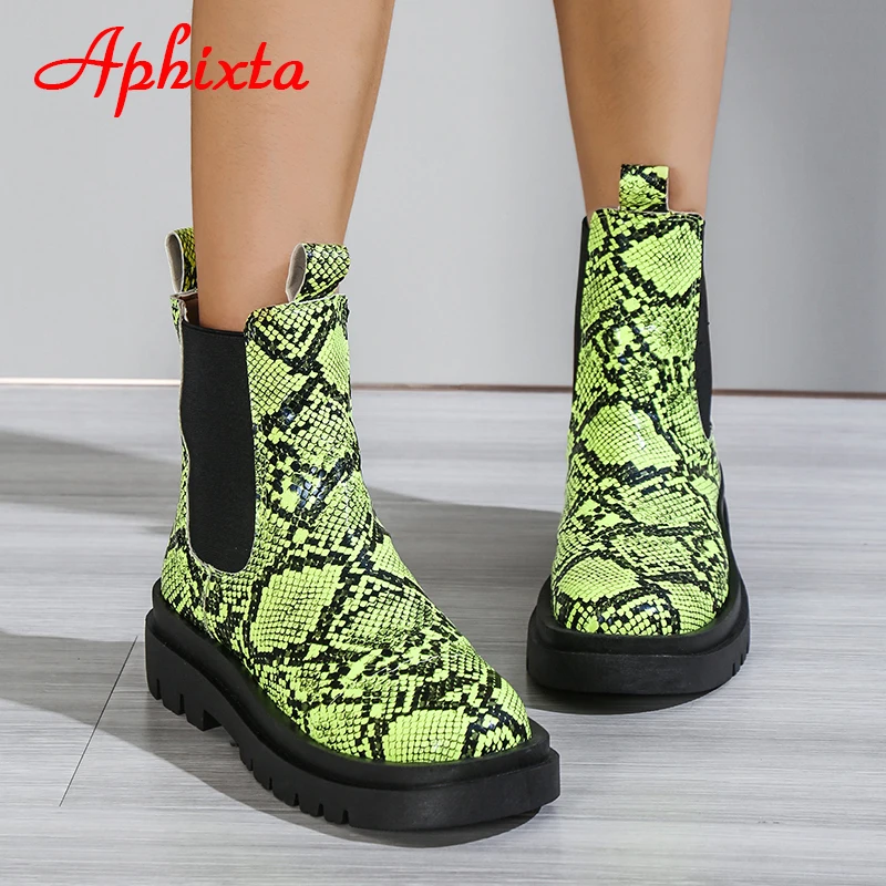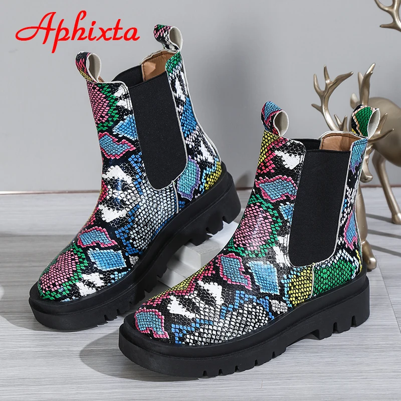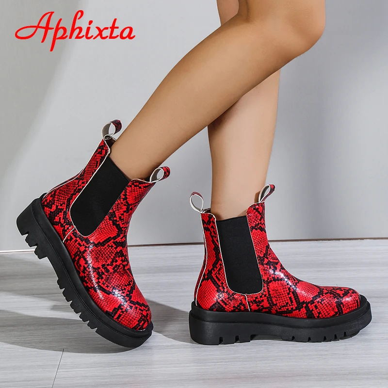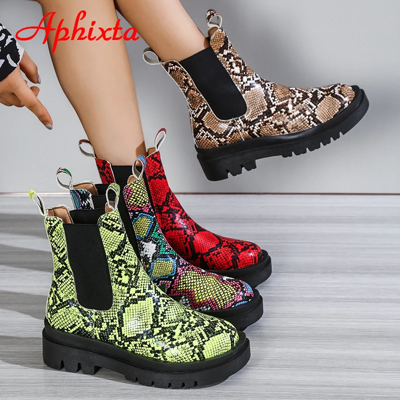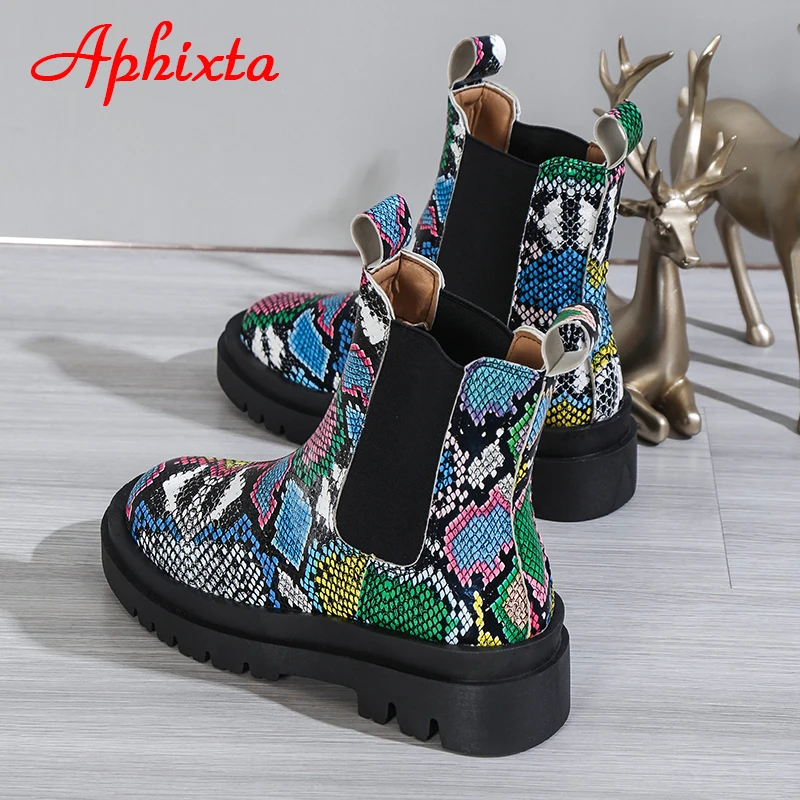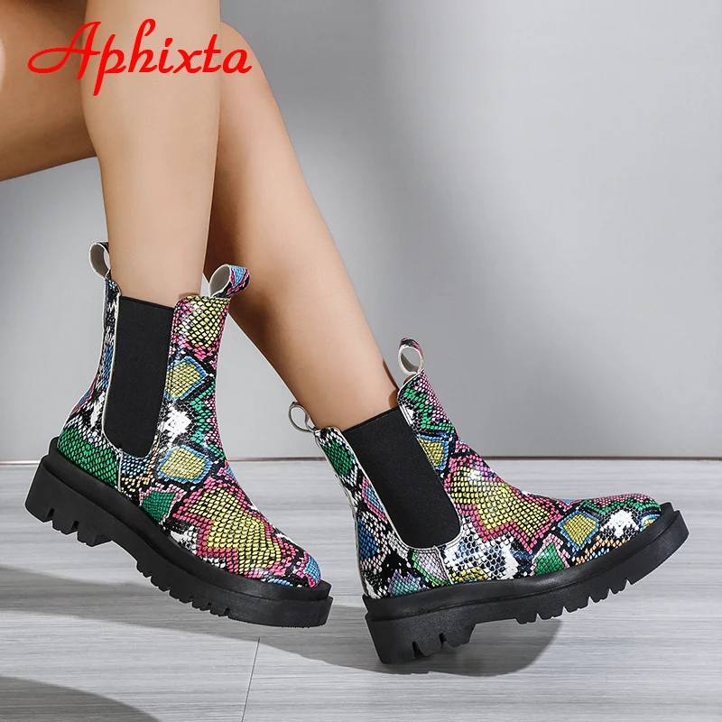 Aphixta Double Layer Women Short Boots Snake Prints Elastic Band Ankle Boots Casual Punk Shoes Motorcycle Boots Plus Size 43