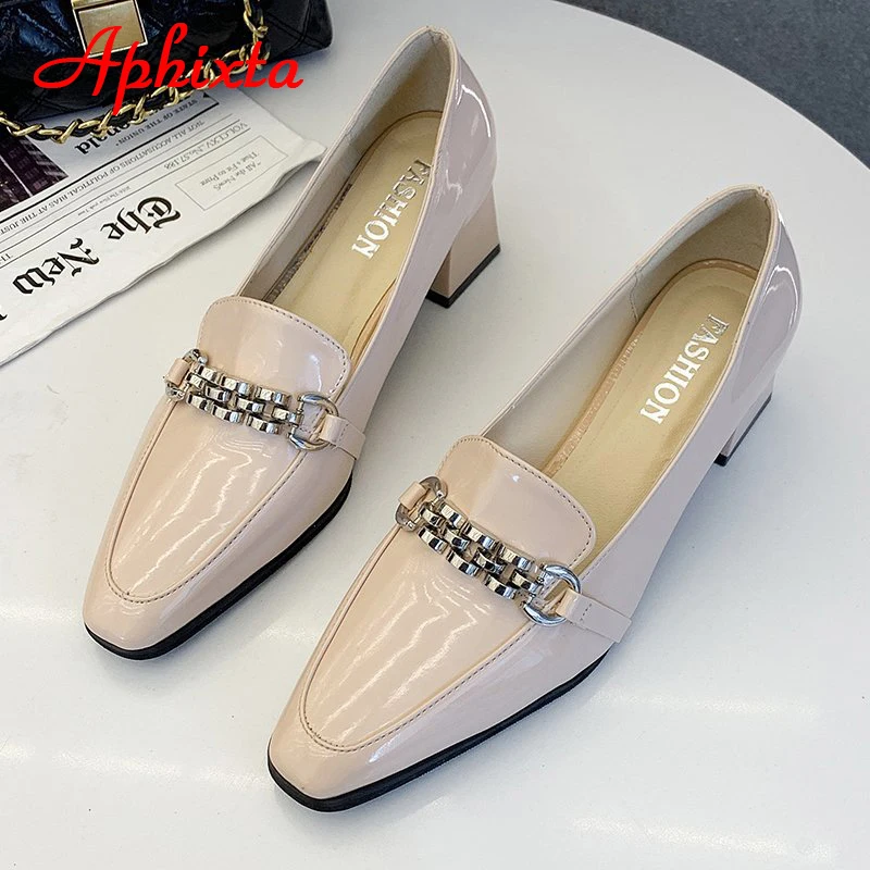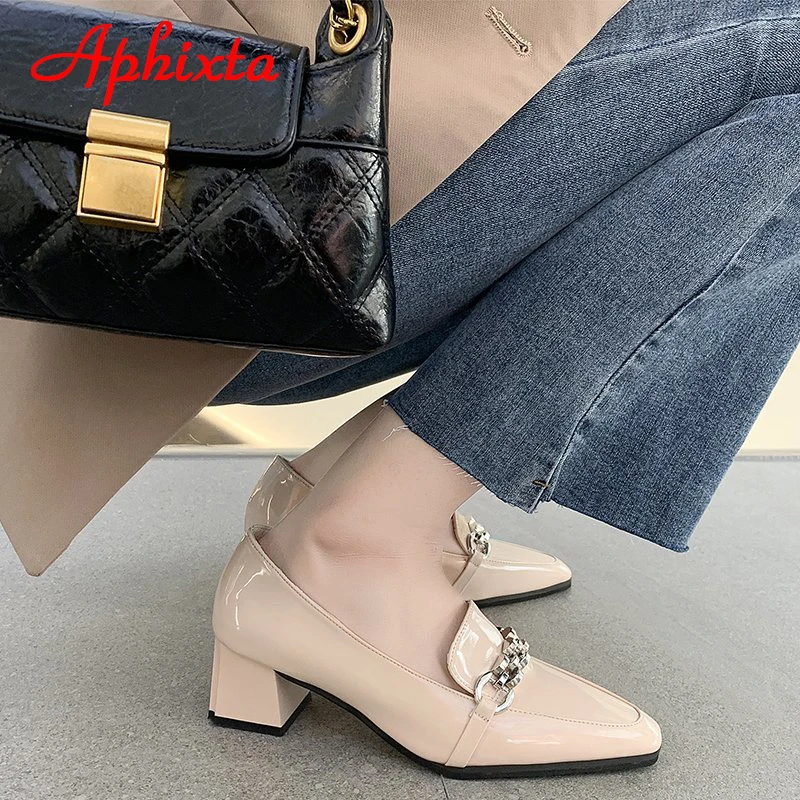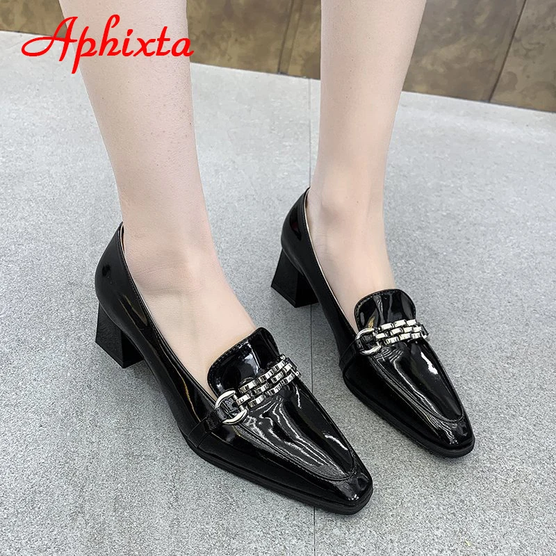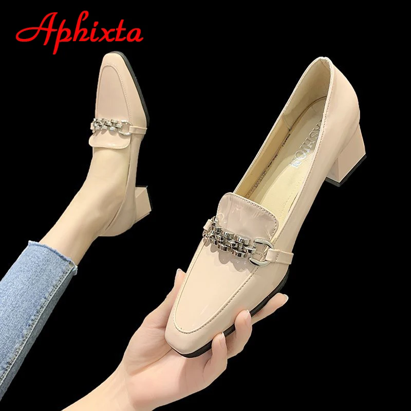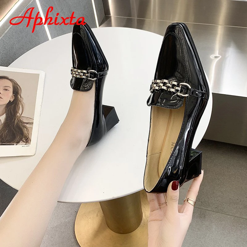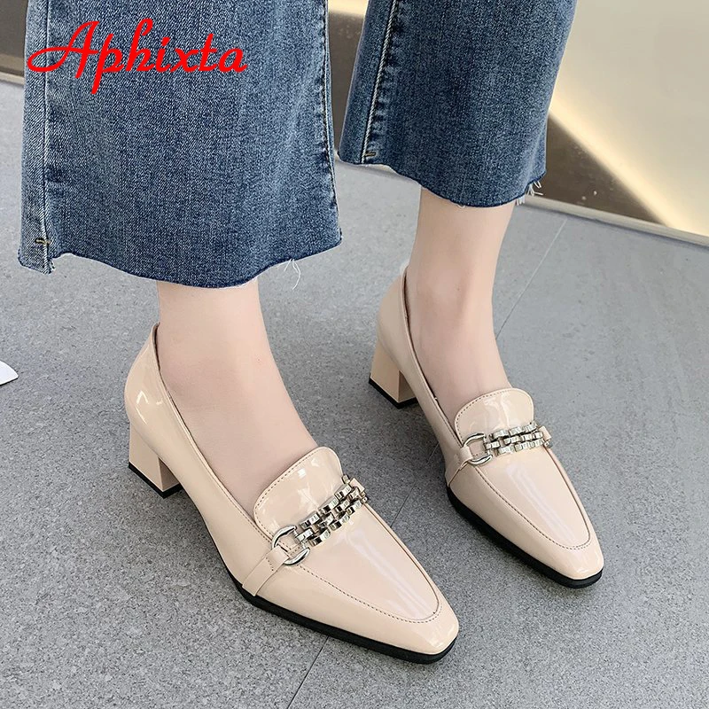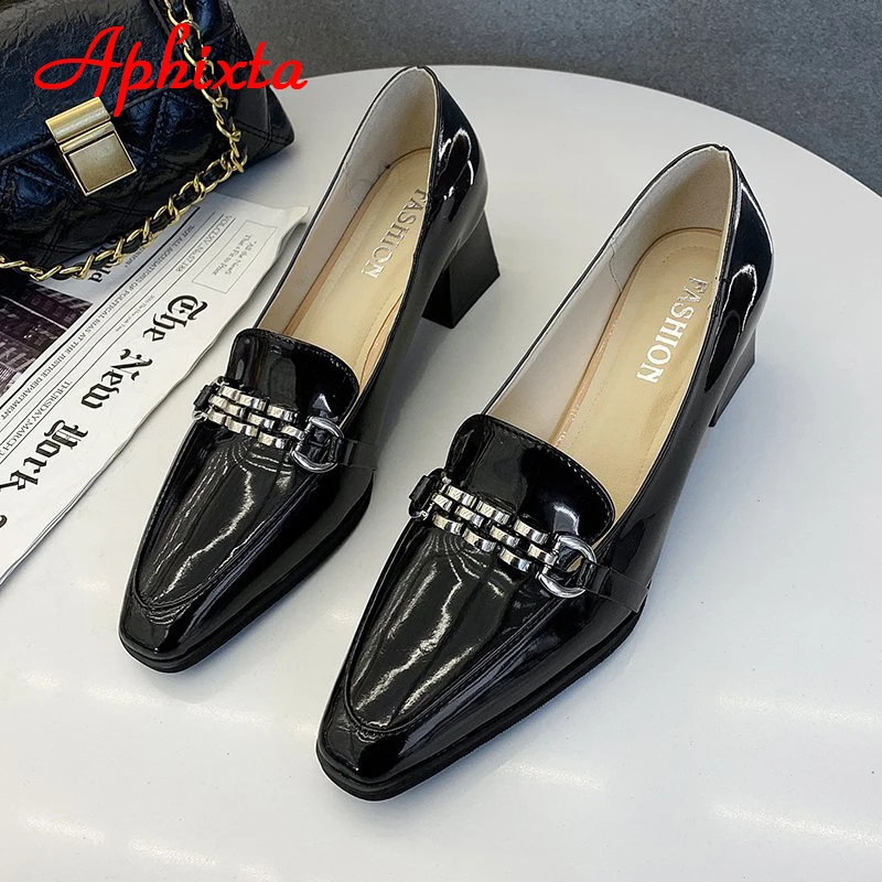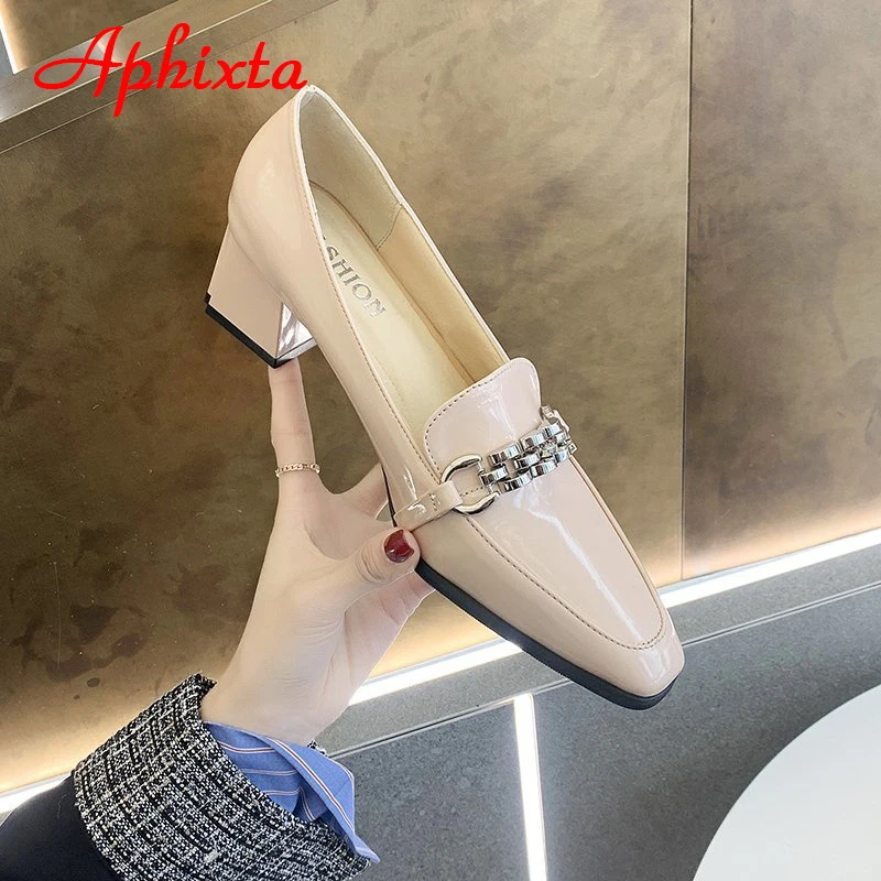 Aphixta Little Square Toe Shoes Women Pumps Metal Chain Buckle Square Heels Bling Fashion Work Office Party Shoes