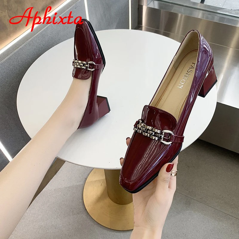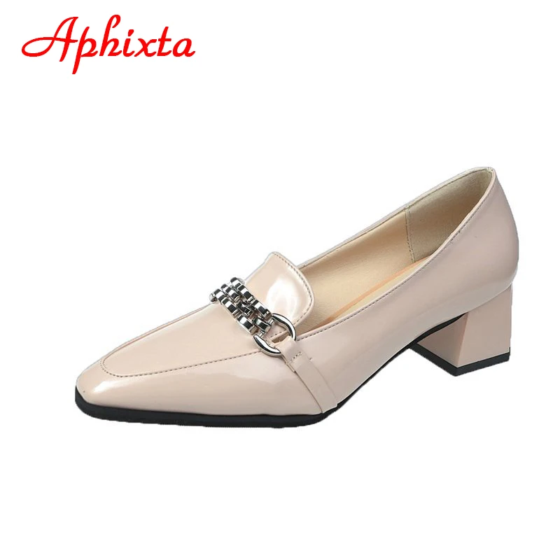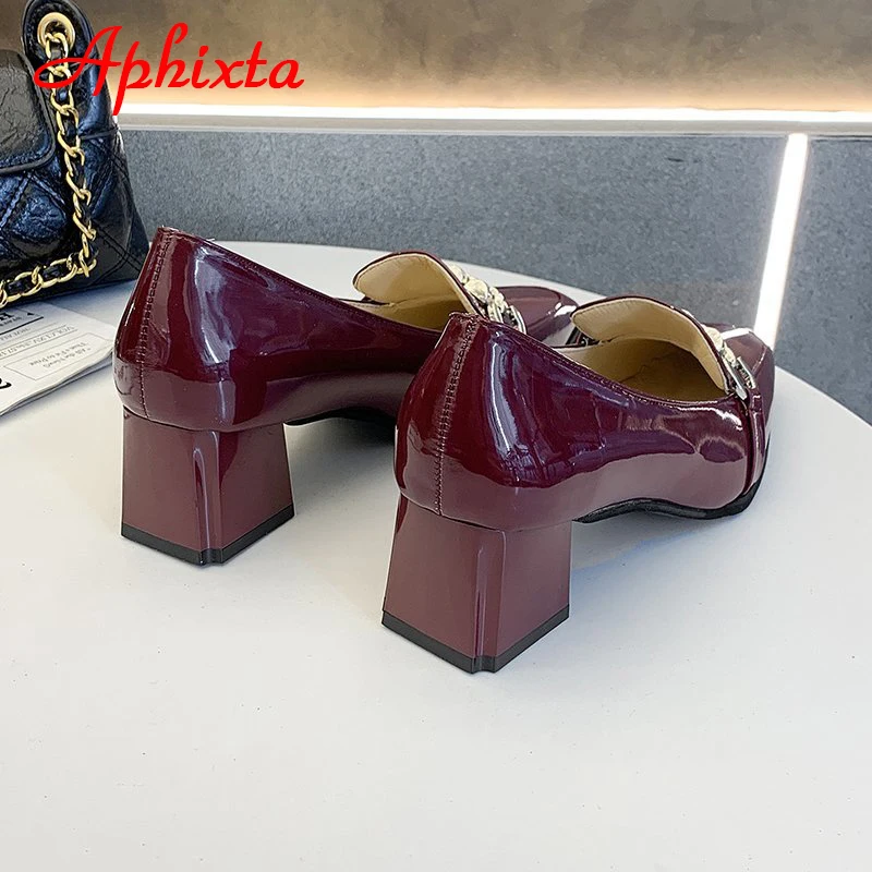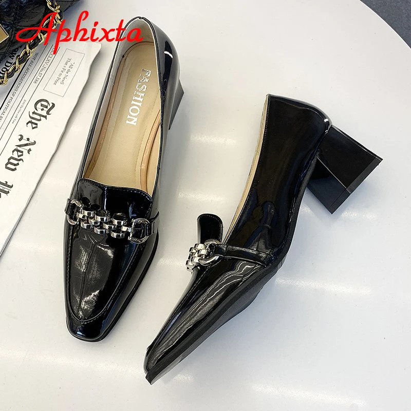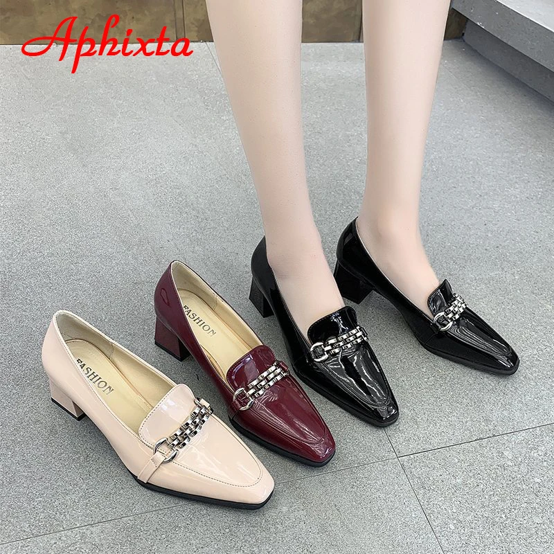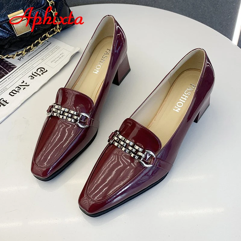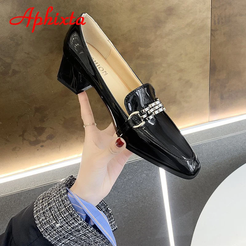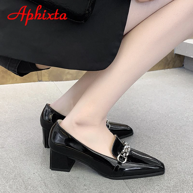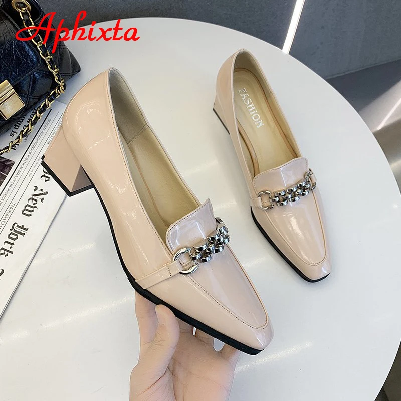 Aphixta Little Square Toe Shoes Women Pumps Metal Chain Buckle Square Heels Bling Fashion Work Office Party Shoes