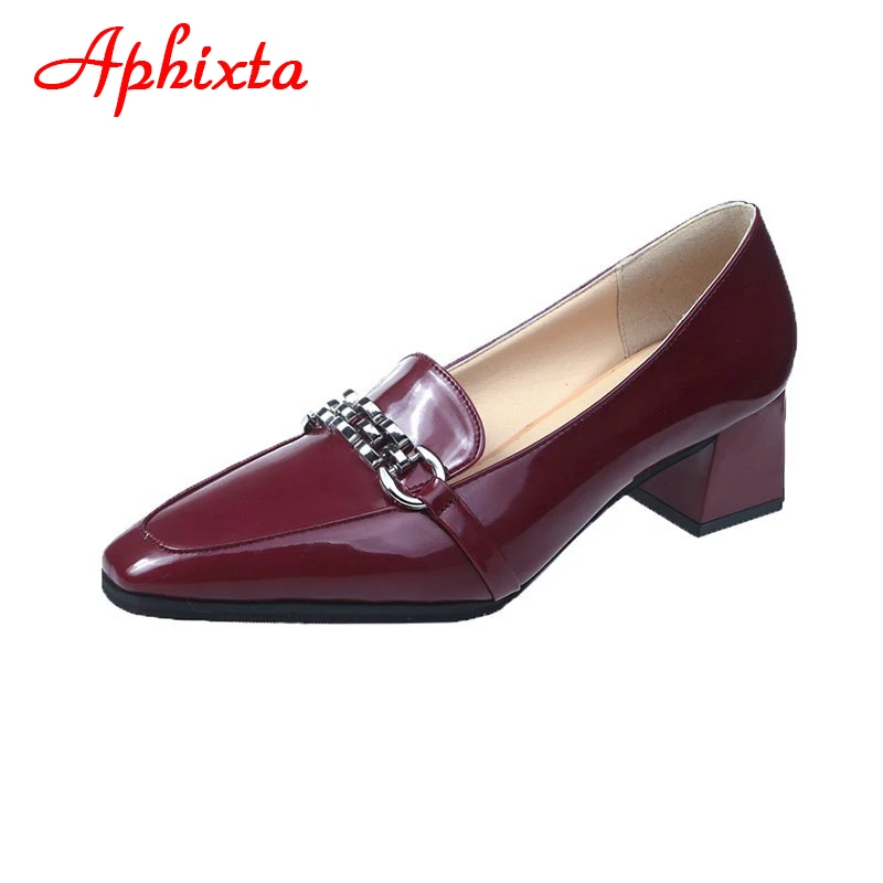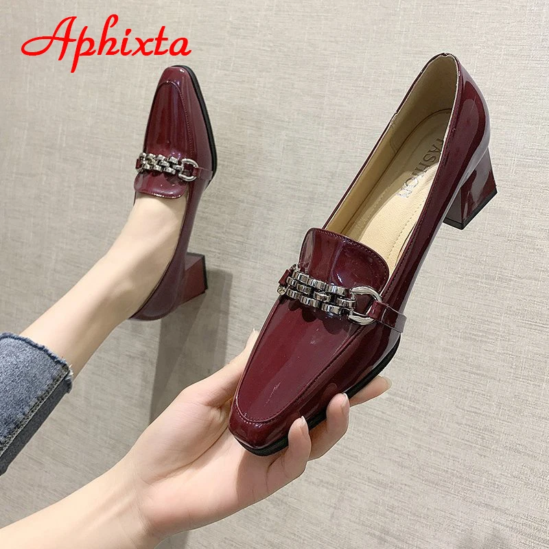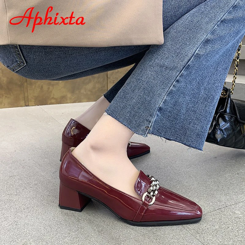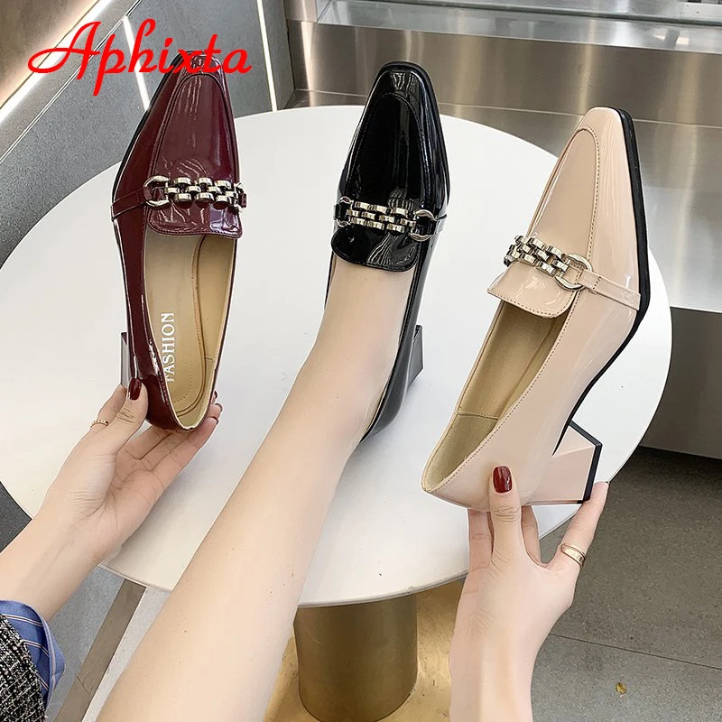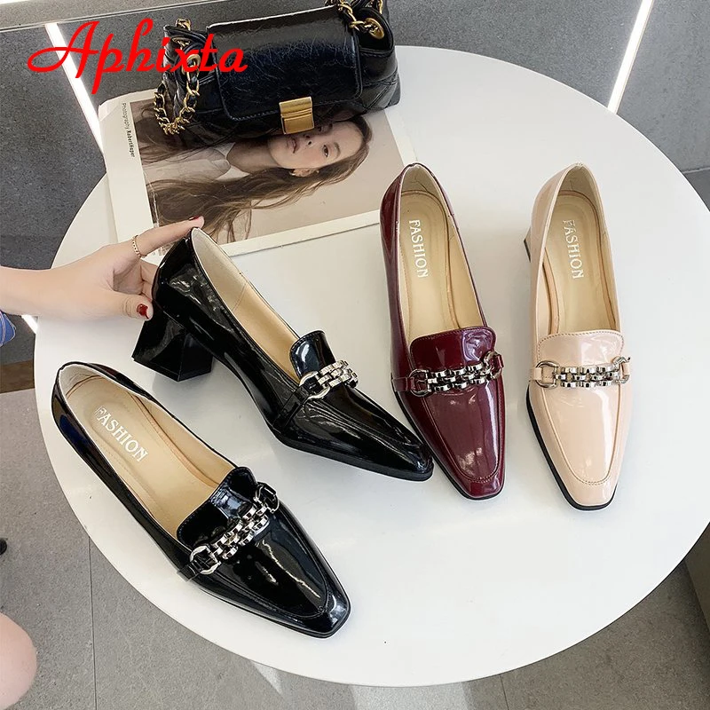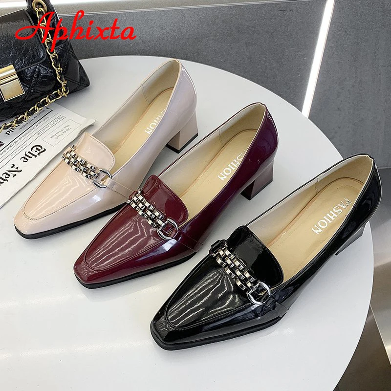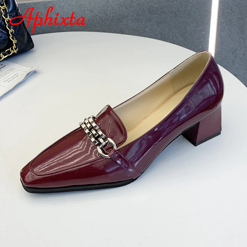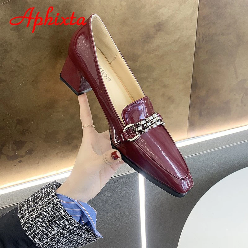 Aphixta Little Square Toe Shoes Women Pumps Metal Chain Buckle Square Heels Bling Fashion Work Office Party Shoes