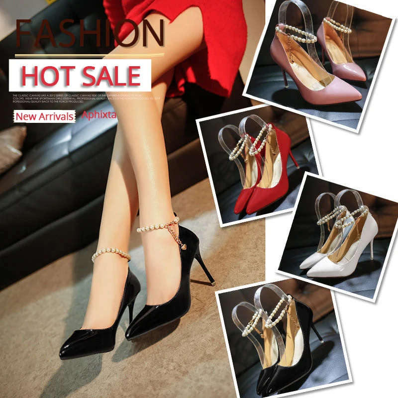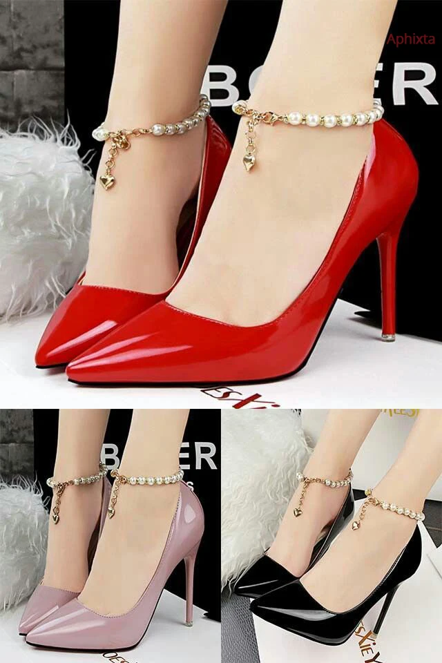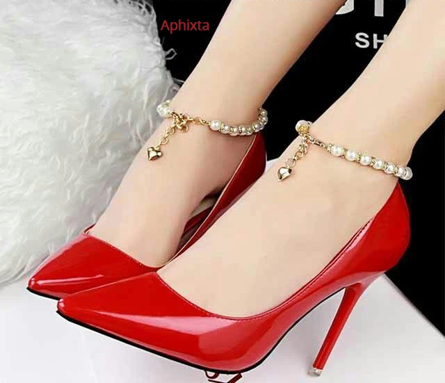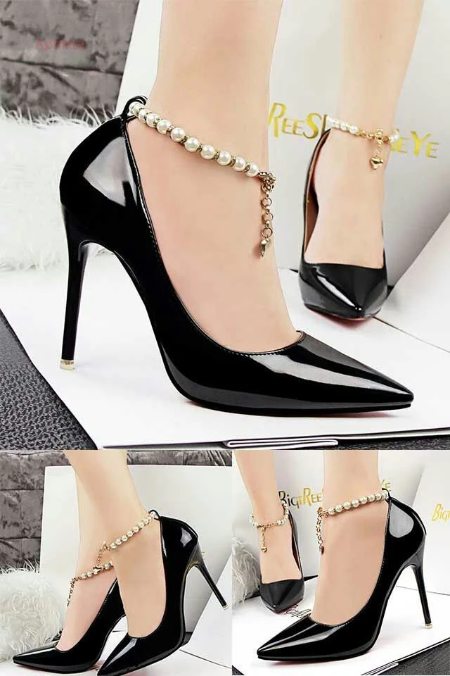Aphixta Luxury Pearl Crystals Chain Pumps Women Shoes 10cm Super High Thin Heels Pointed Toe Patent Leather Office Stiletto Heel