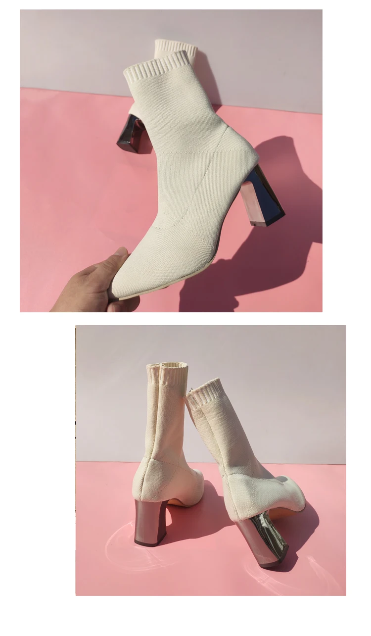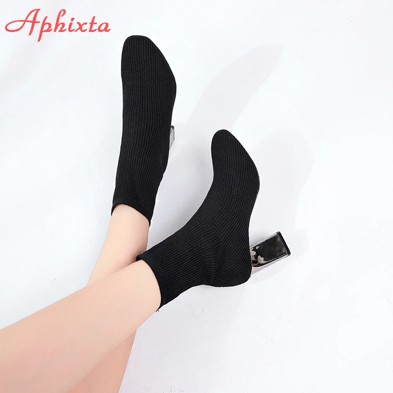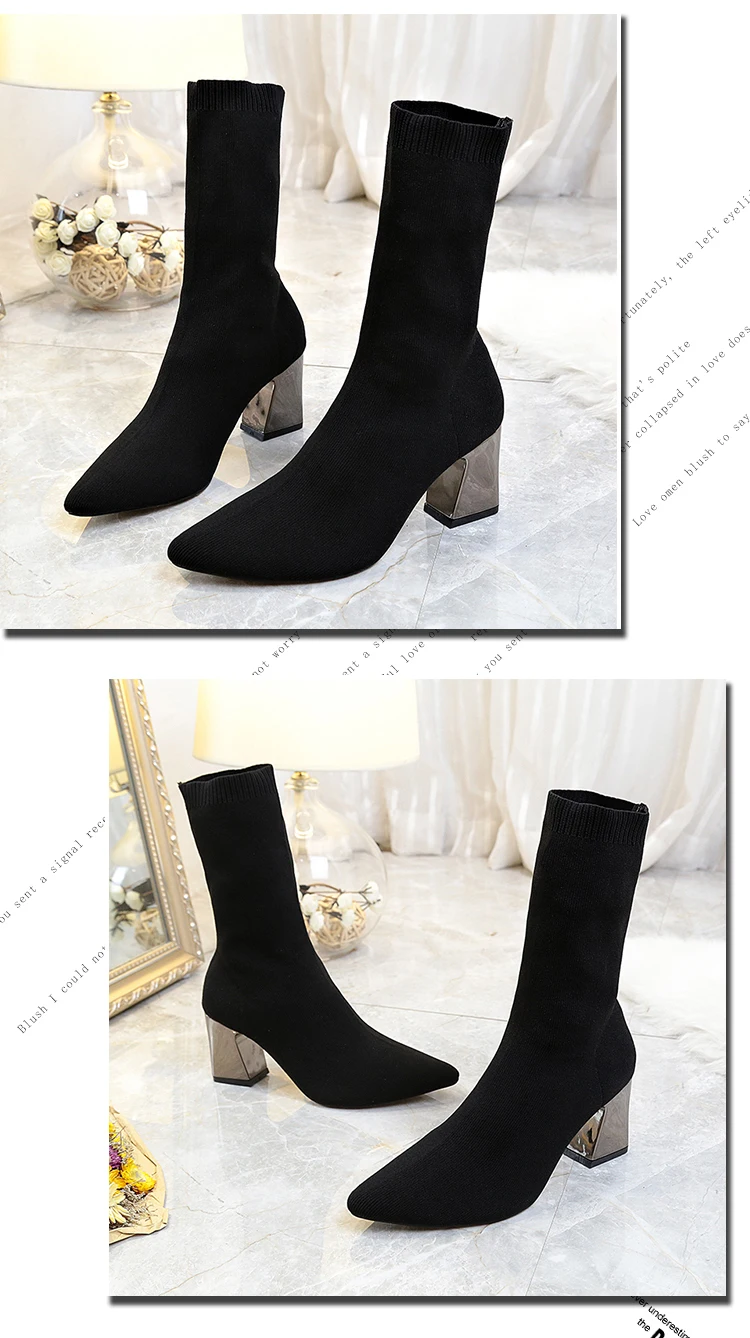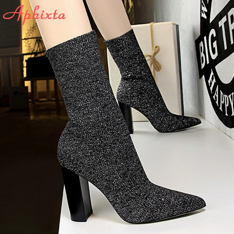 Aphixta Metal Color 7cm Square Heels Socks Boots Women Big Size 43 Stretch Fabric Elastic Pointed Toe Shoes Ankle Boot Woman