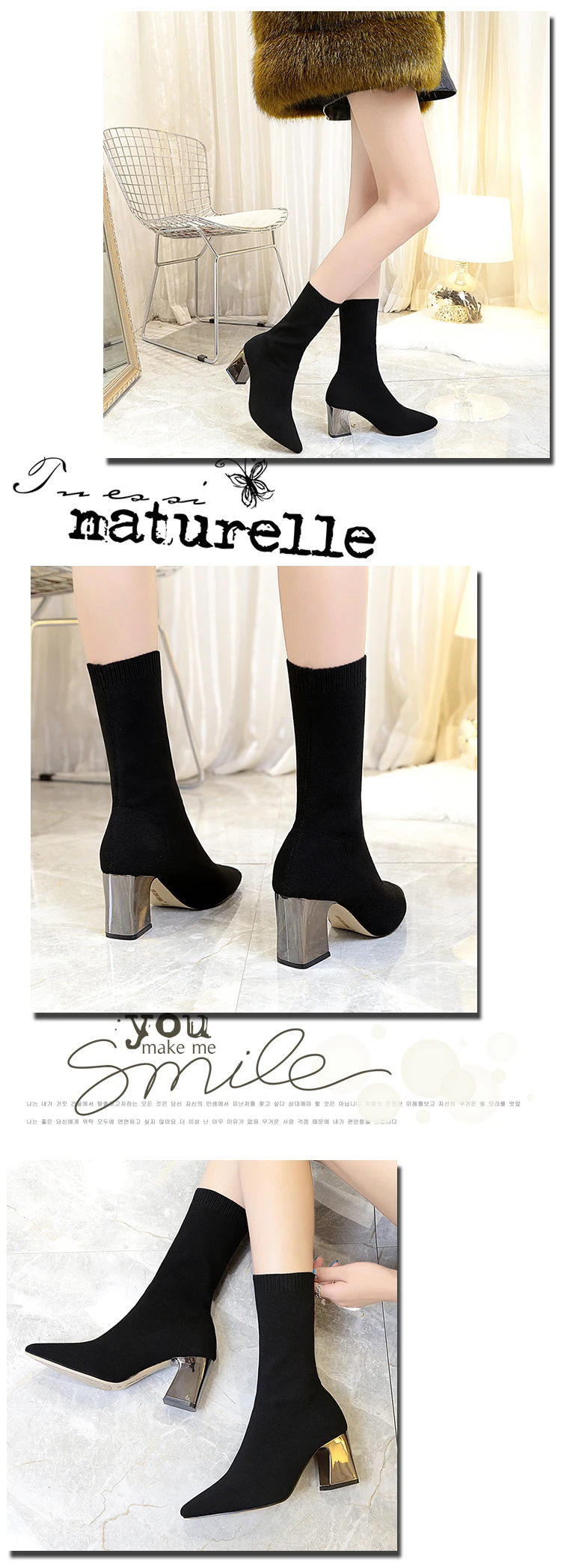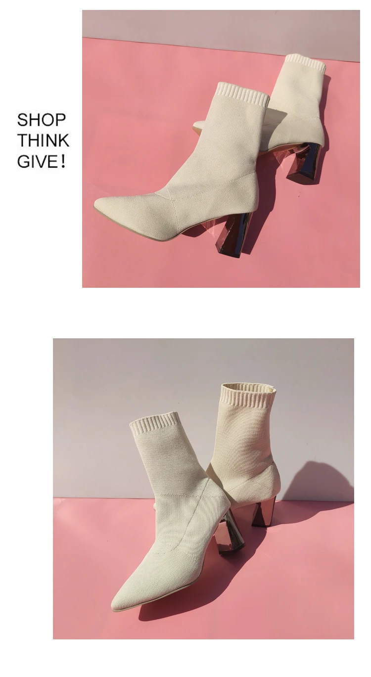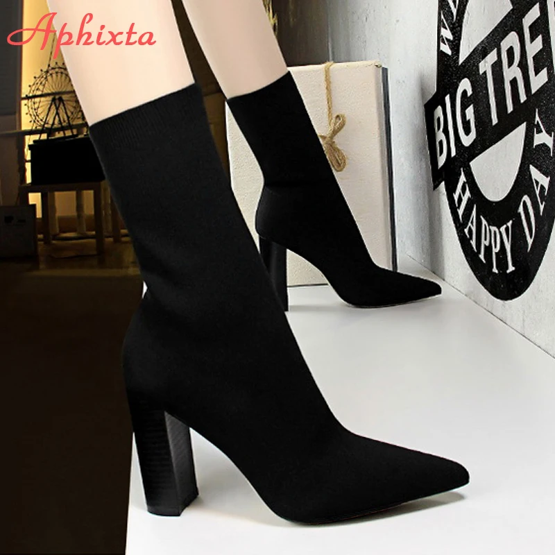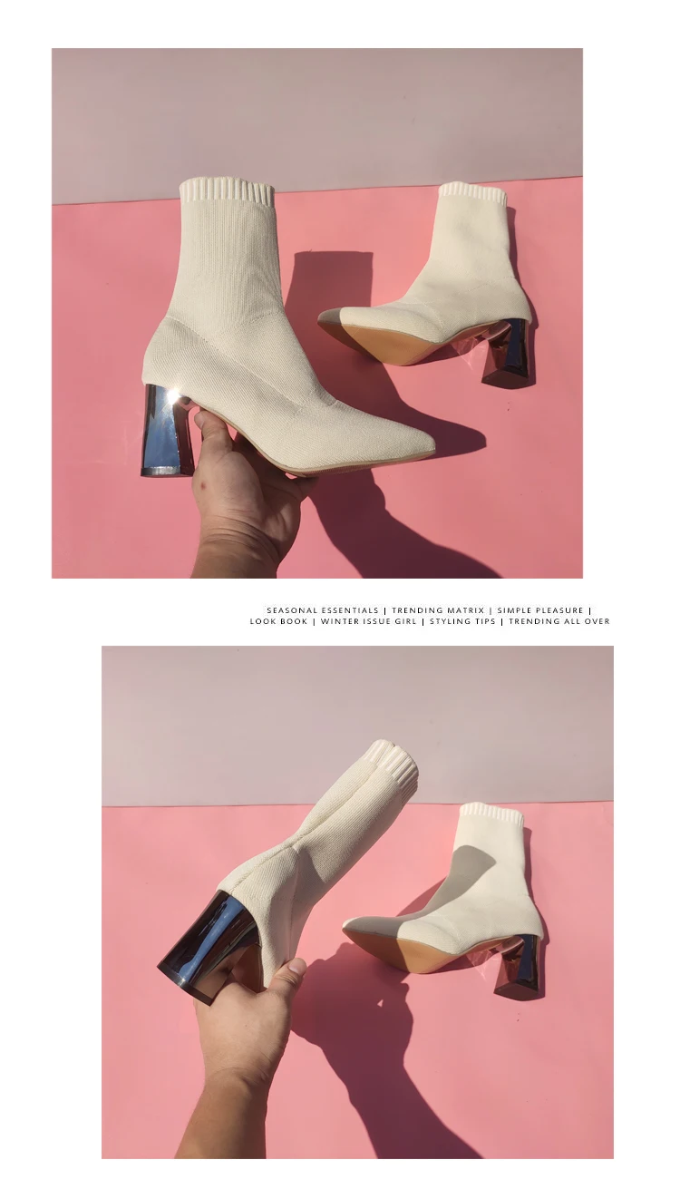 Aphixta Metal Color 7cm Square Heels Socks Boots Women Big Size 43 Stretch Fabric Elastic Pointed Toe Shoes Ankle Boot Woman