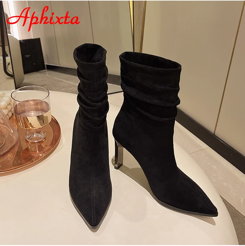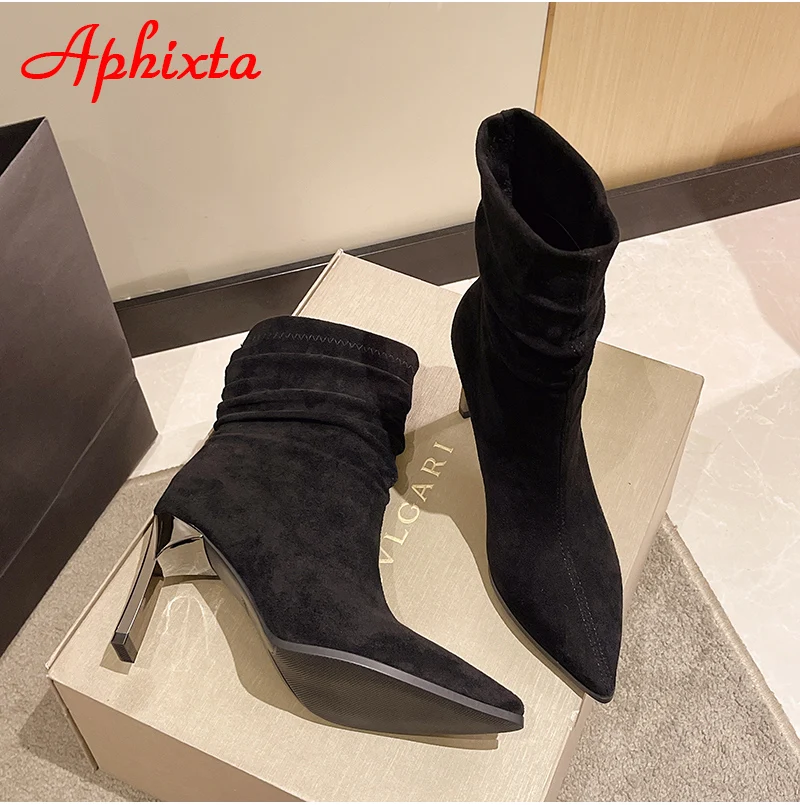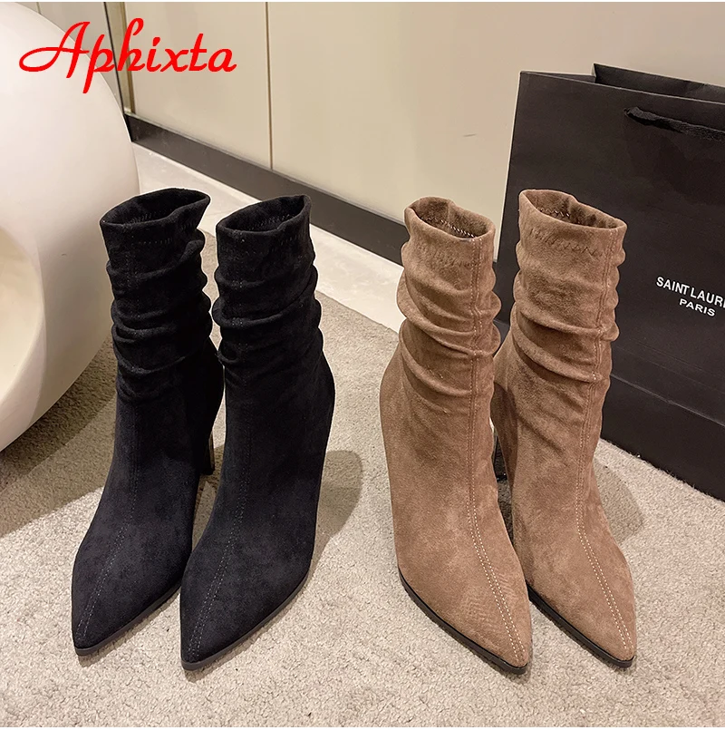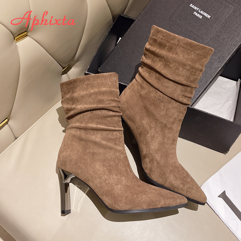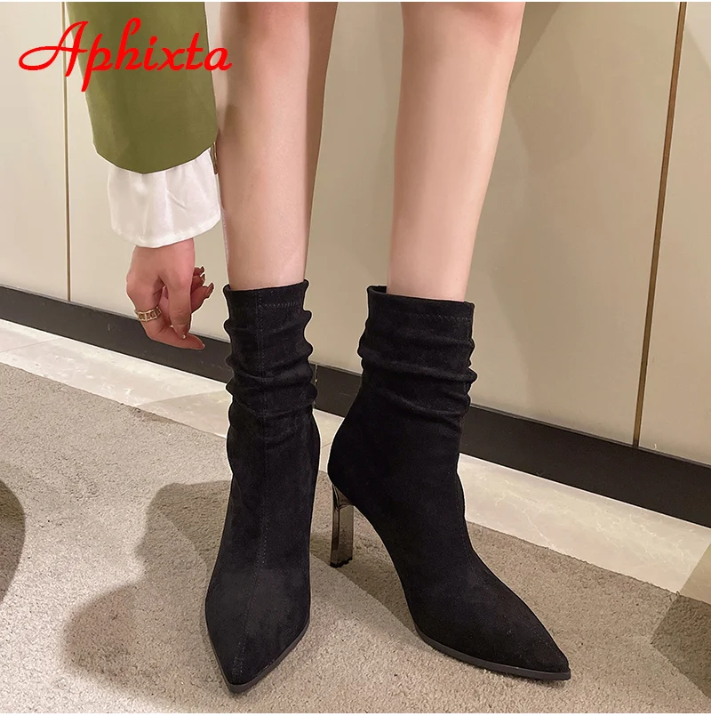 Aphixta Metal Stilettos Blade Heels Socks Boots Women Coffee Warm Pleated Stretch Fabric Pointed Toe Shoes Boats