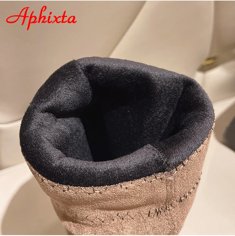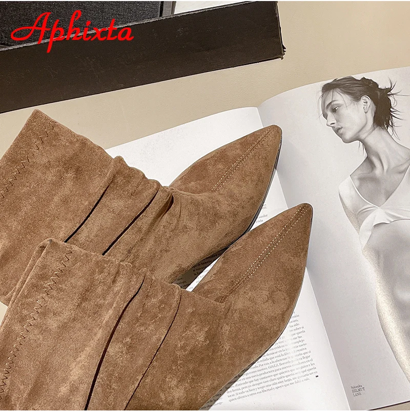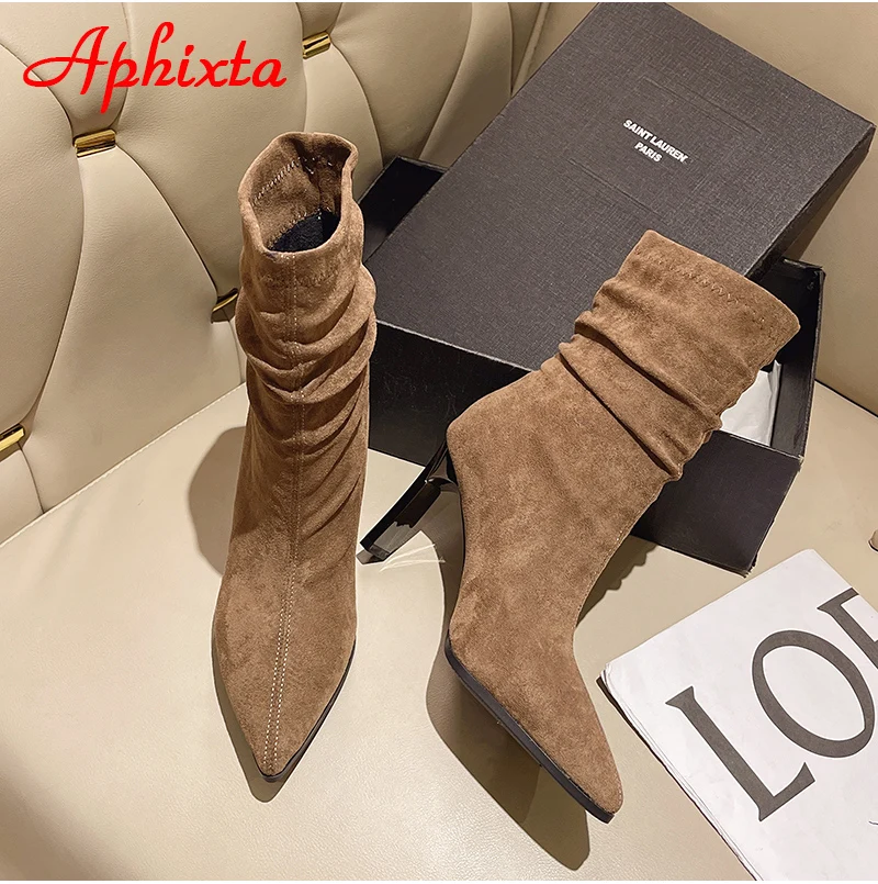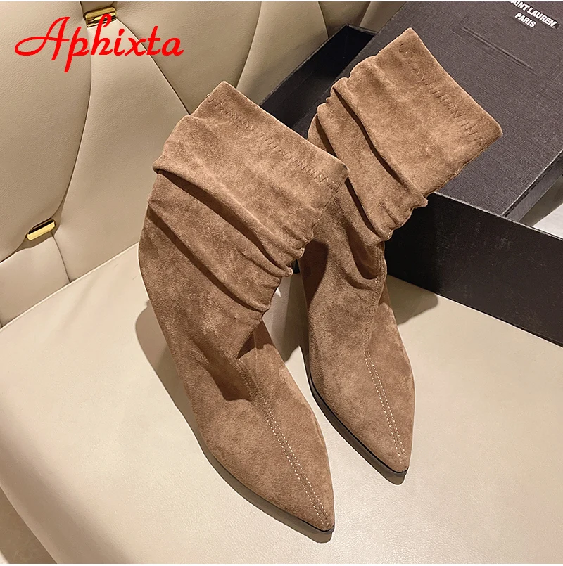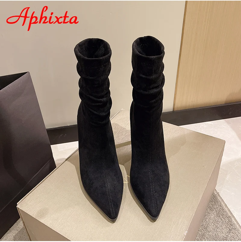 Aphixta Metal Stilettos Blade Heels Socks Boots Women Coffee Warm Pleated Stretch Fabric Pointed Toe Shoes Boats