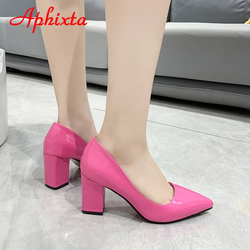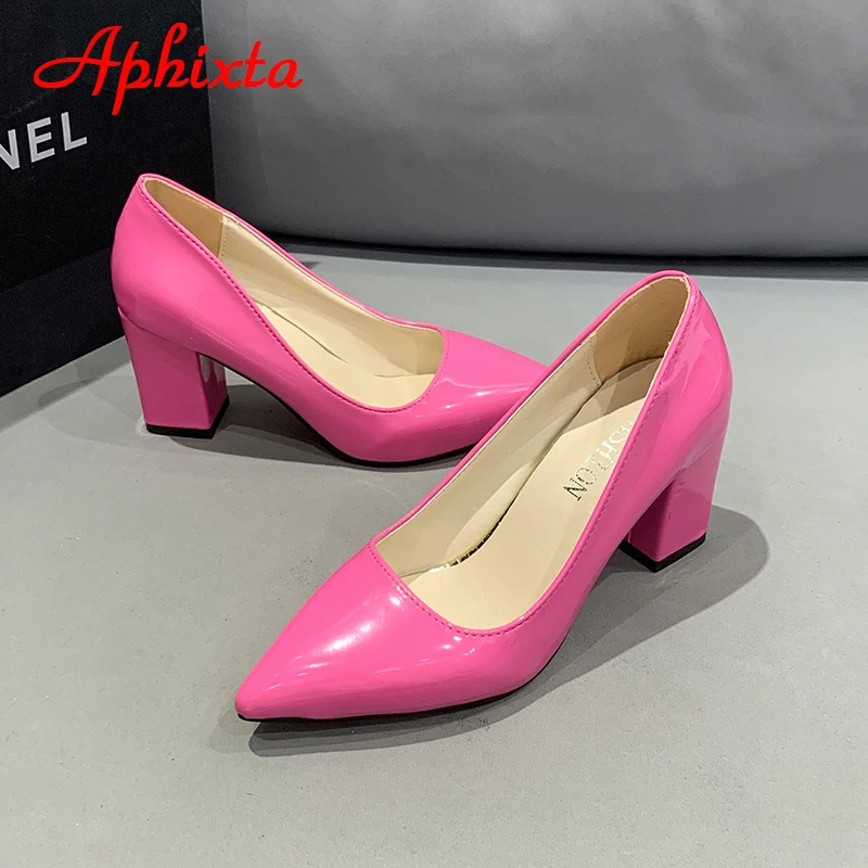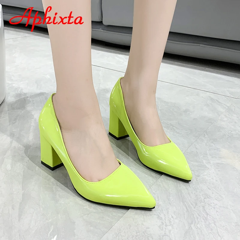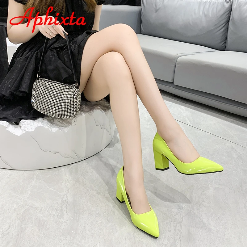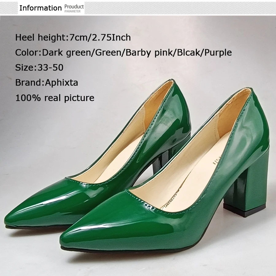 Aphixta New 2.75Inch Square Heel Patent Leather Shoes Women Pumps Dark Green Thick Heels Work Pointed Toe Plus Size 50