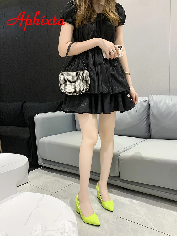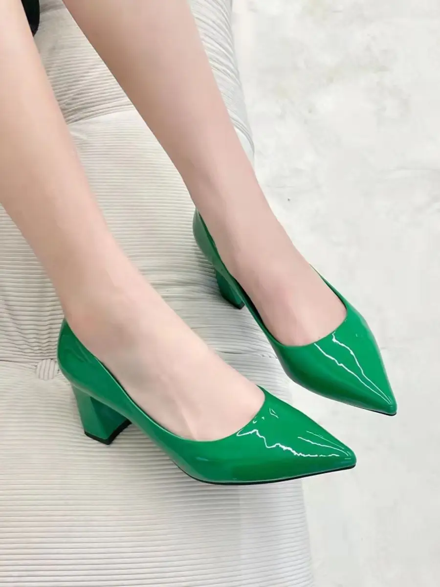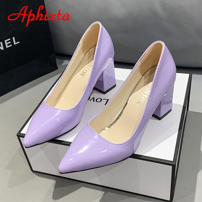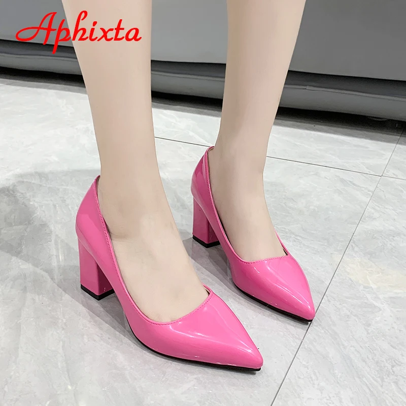 Aphixta New 2.75Inch Square Heel Patent Leather Shoes Women Pumps Dark Green Thick Heels Work Pointed Toe Plus Size 50