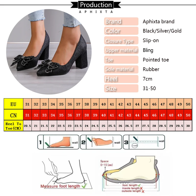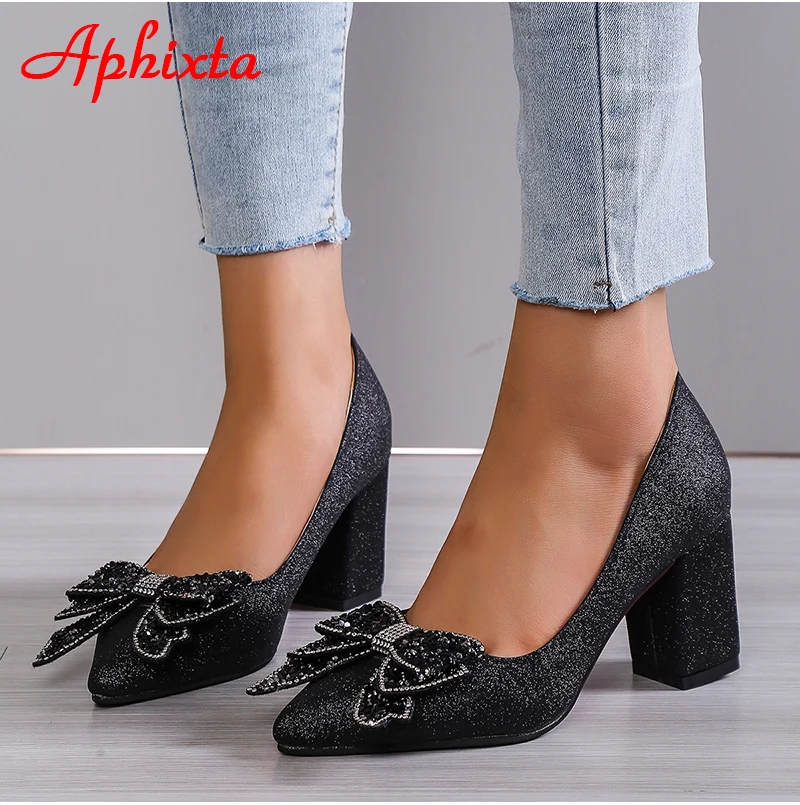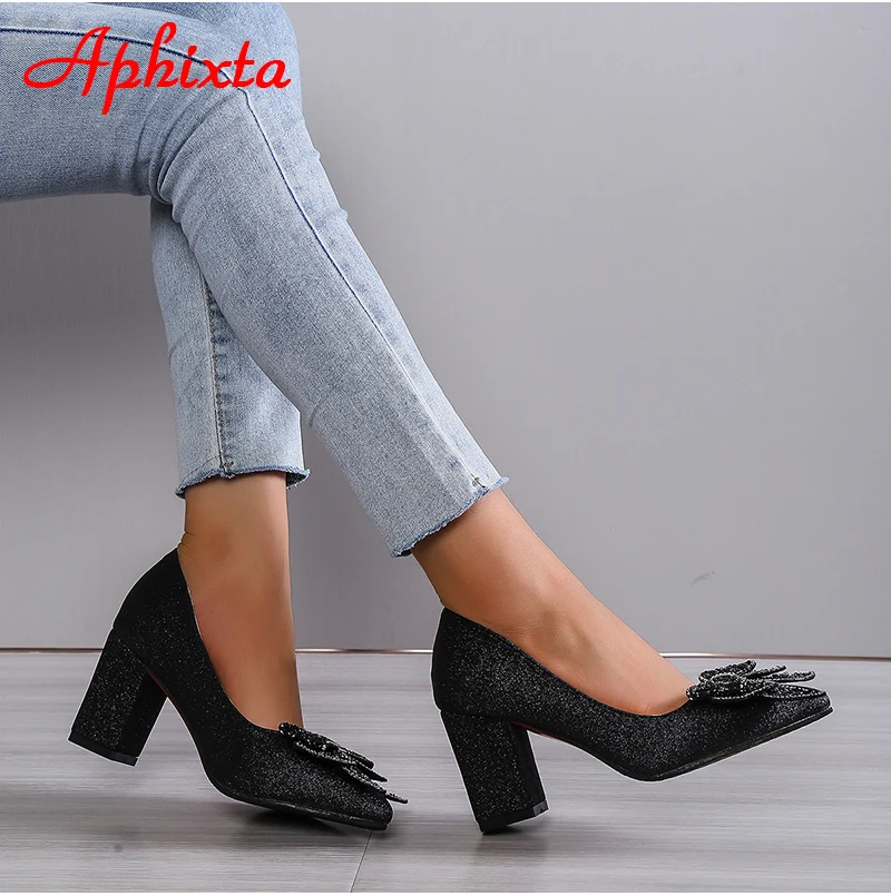 Aphixta New Appliques 7cm Square Heel Shoes Women Pumps Bling Butterfly-knot Flowers Officile Pointed Toe Super Big Size 49 50