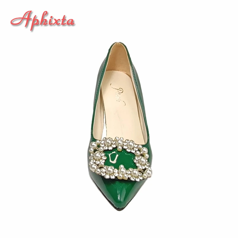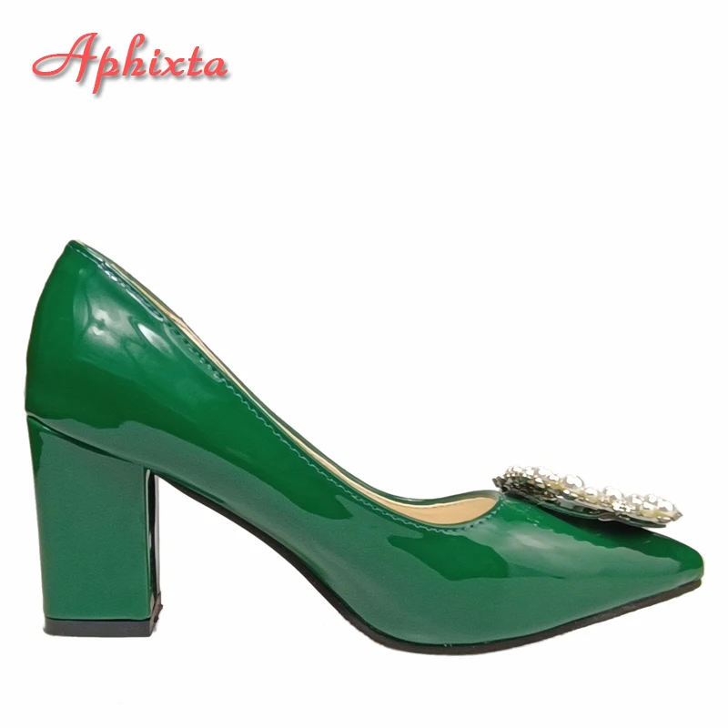 Aphixta New Dark Green Pearl Buckle Patent Leather Women's Pumps 7cm Square Heel Officile Pointed Toe Shoes Super Big Size 49 50