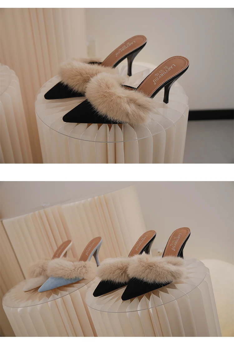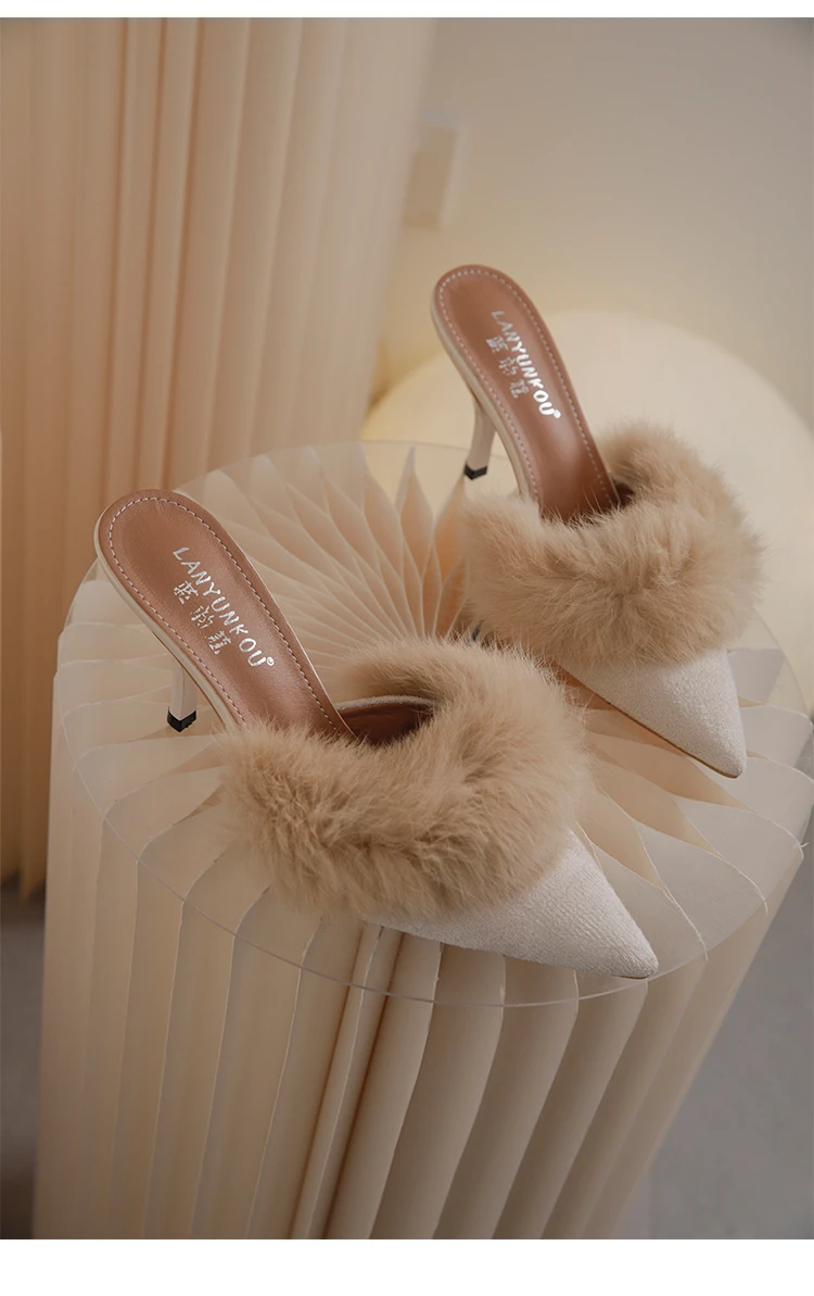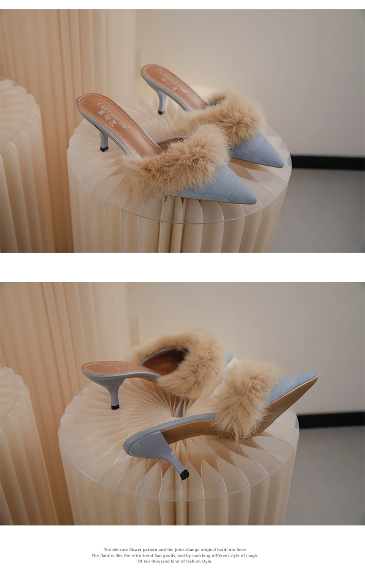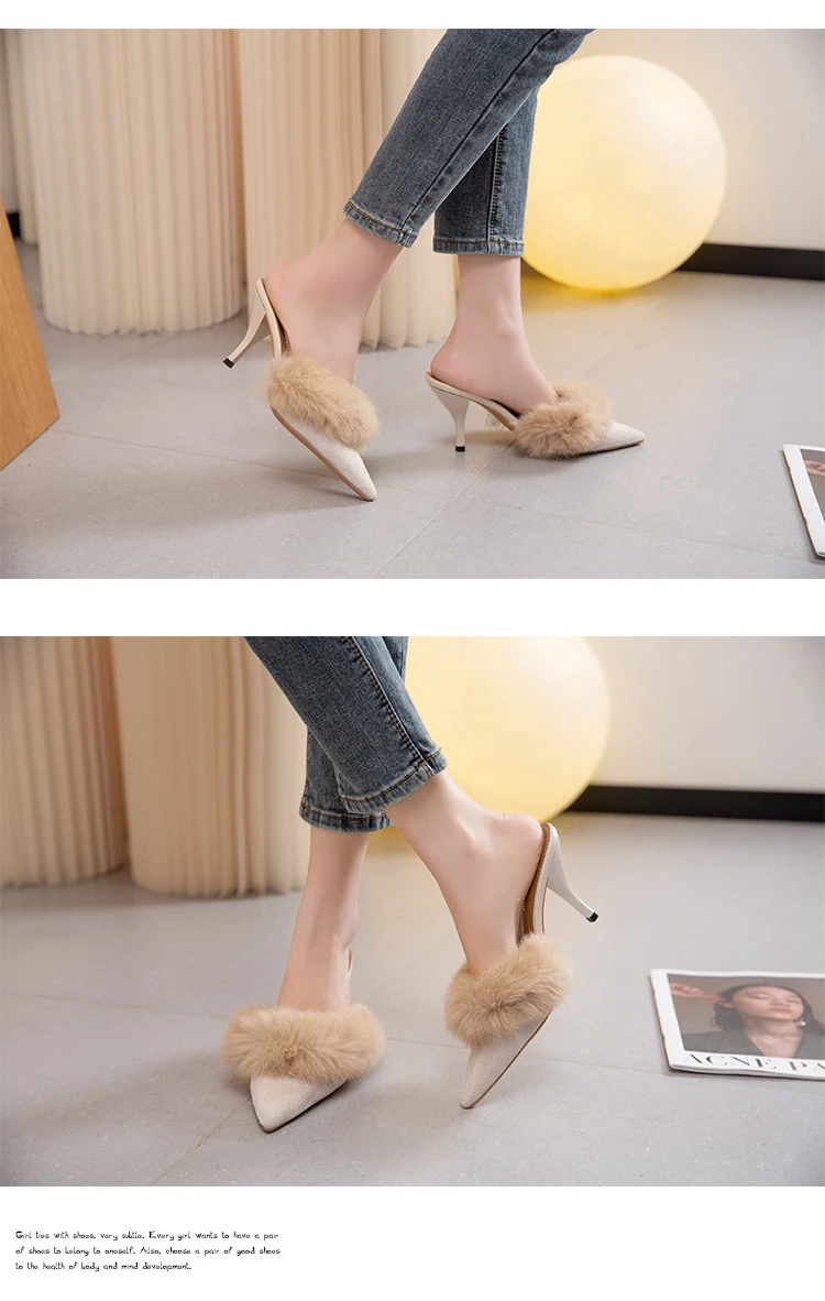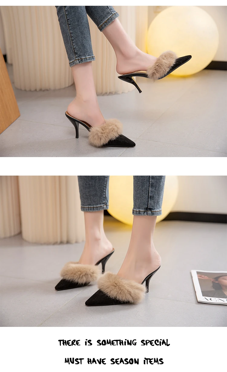 Aphixta New Soft Real Rabbit Fur Plush Pointed Toe Women Slippers 6cm/8cm Thin Heels Shoes Flat Heel Hair Slides