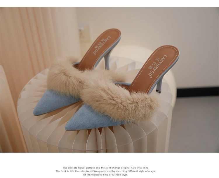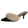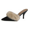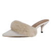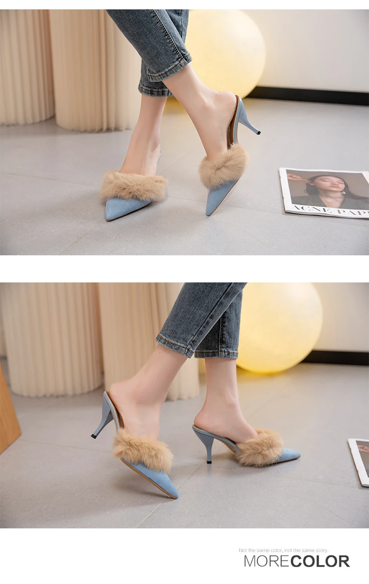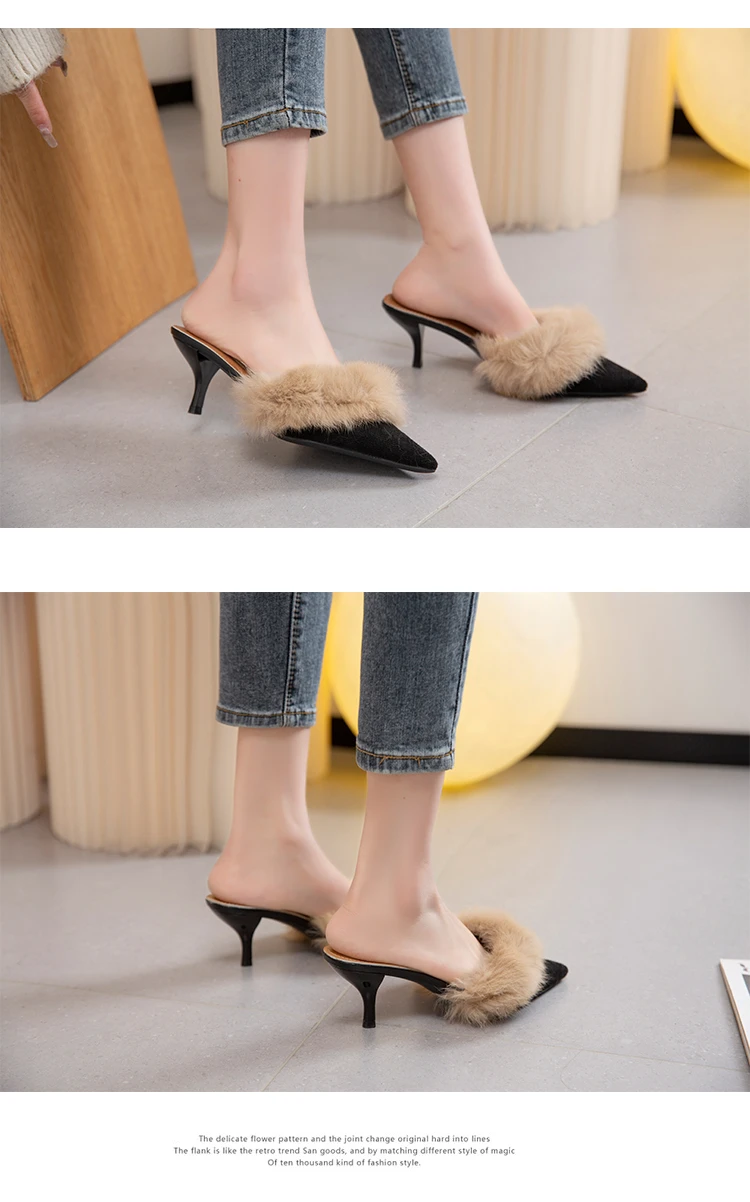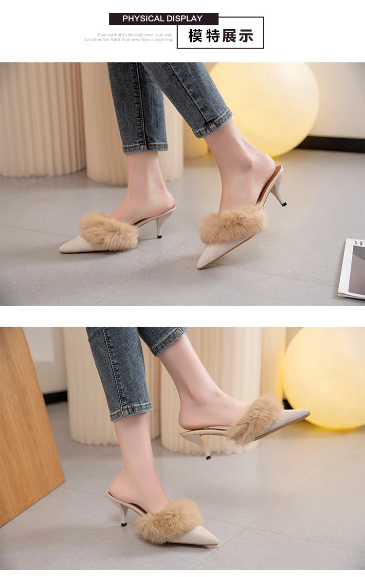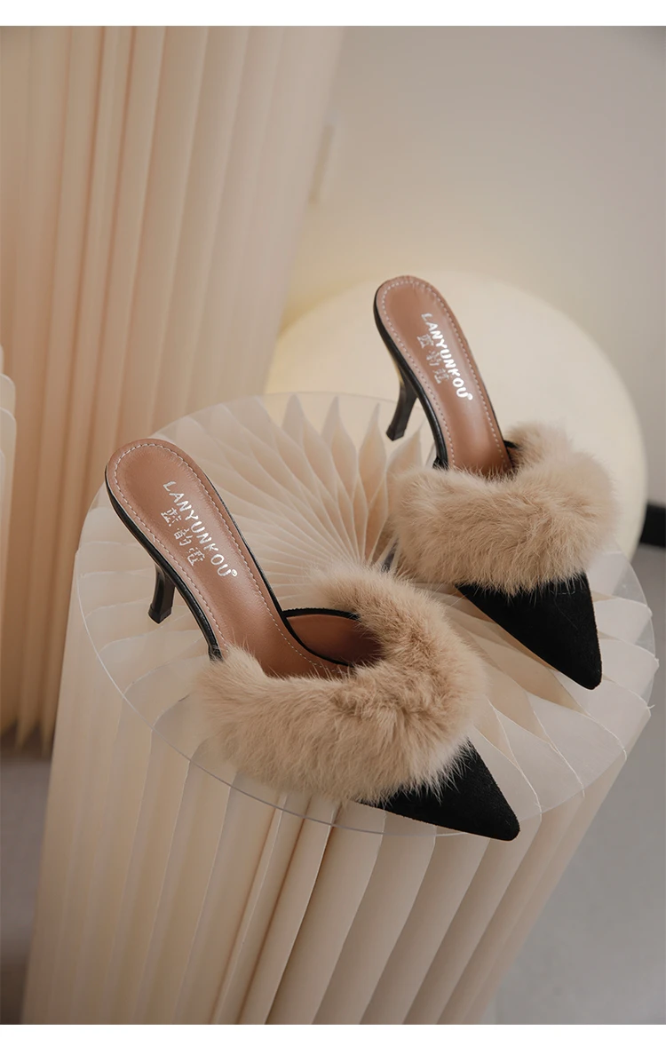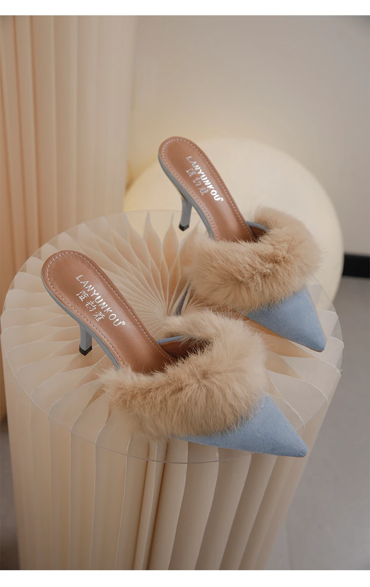 Aphixta New Soft Real Rabbit Fur Plush Pointed Toe Women Slippers 6cm/8cm Thin Heels Shoes Flat Heel Hair Slides