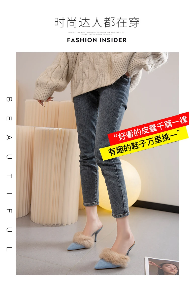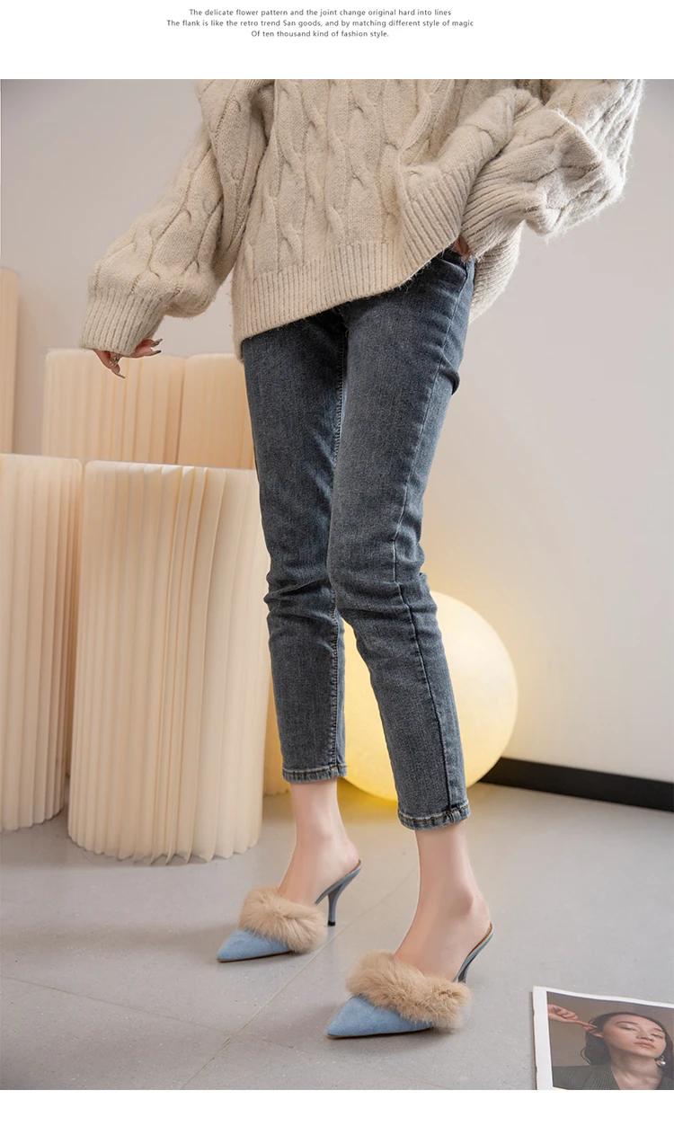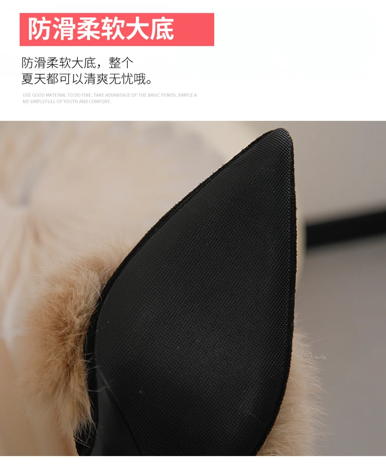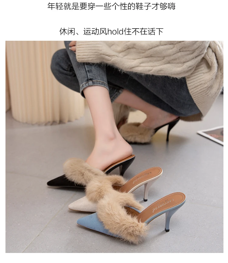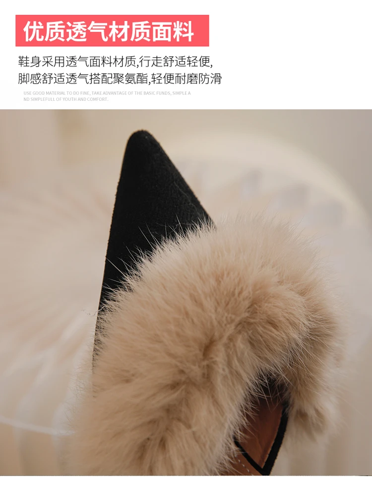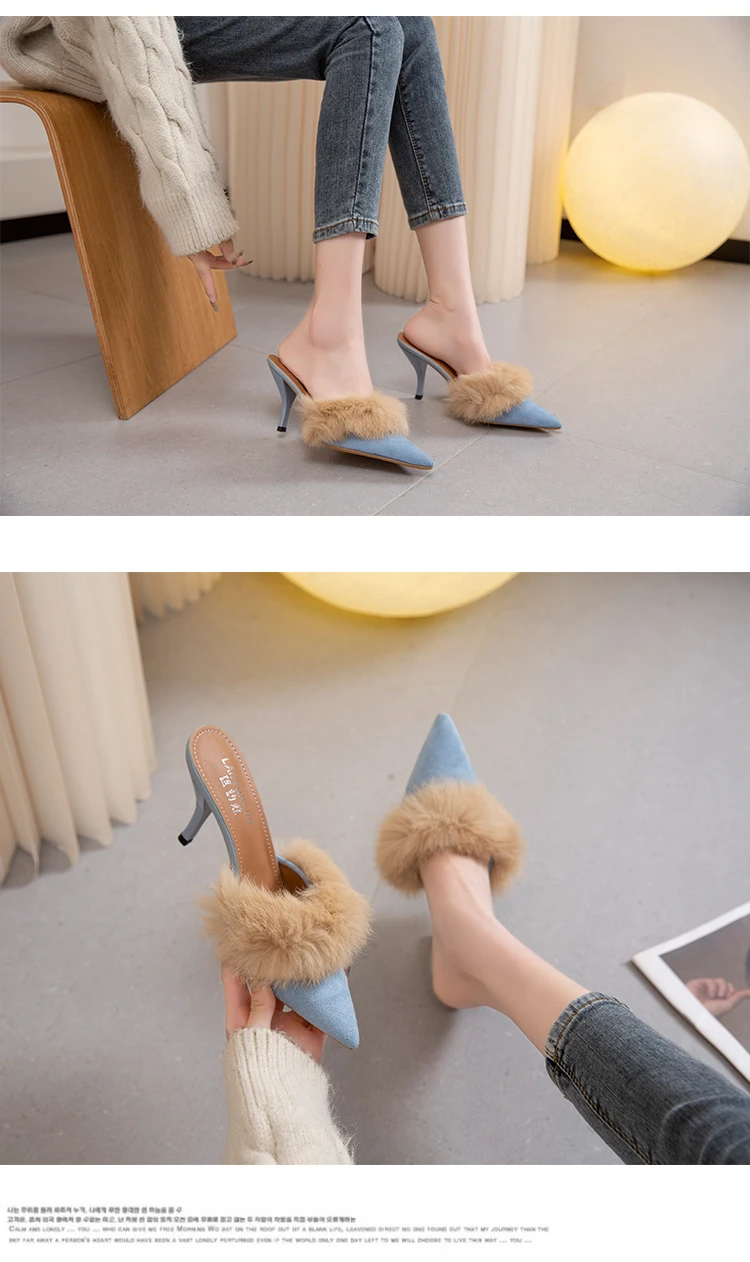 Aphixta New Soft Real Rabbit Fur Plush Pointed Toe Women Slippers 6cm/8cm Thin Heels Shoes Flat Heel Hair Slides
