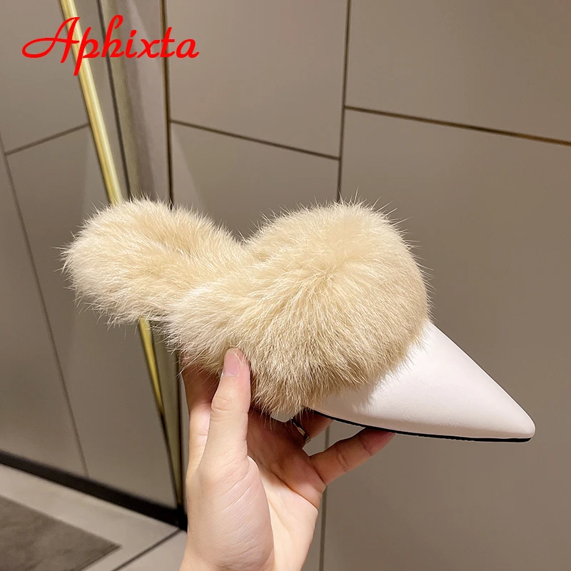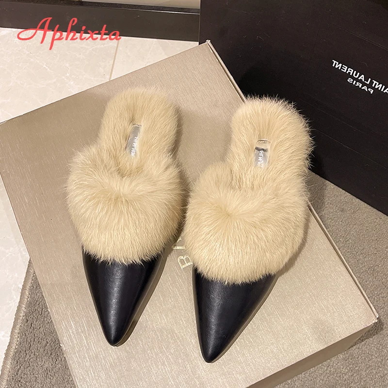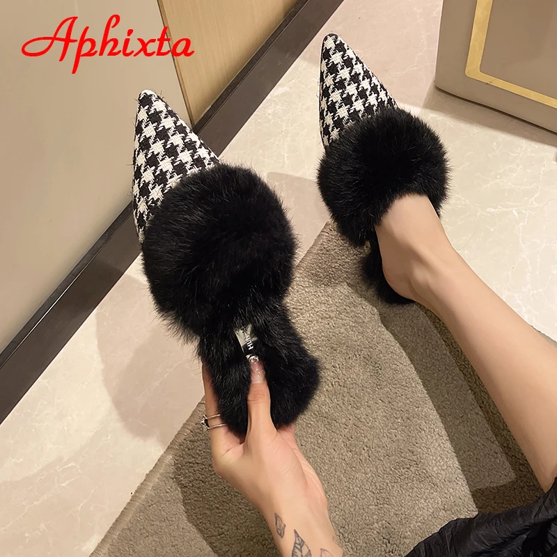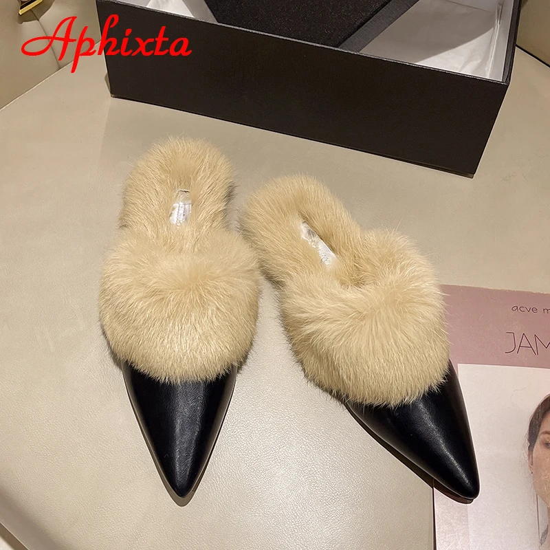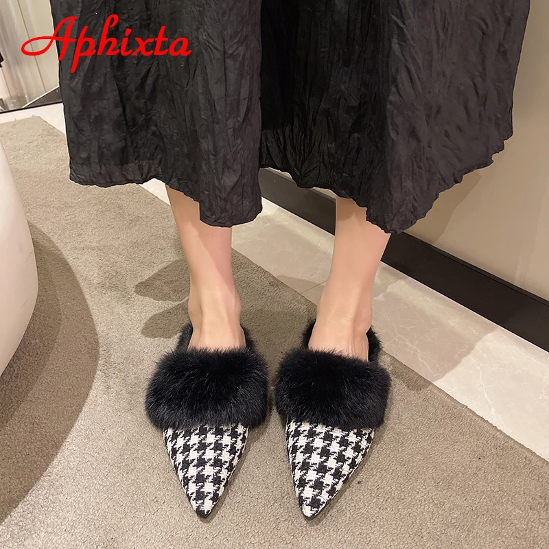 Aphixta New Warm Winter Real Rabbit Fur Plush Women Slippers Birds Furry Plaid Shoes Pointed Toe Flat Heel Hair Slides