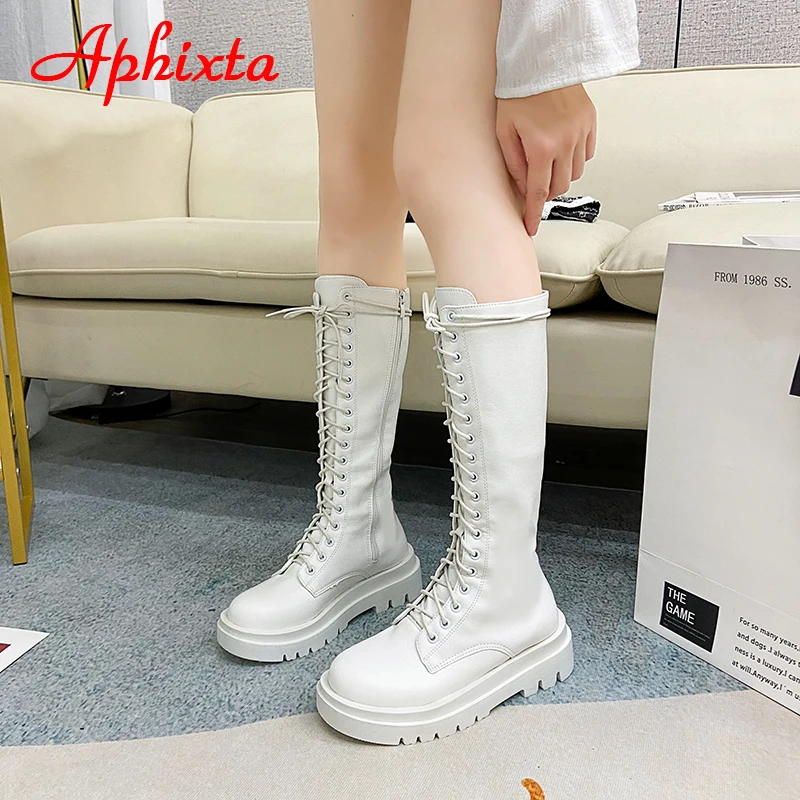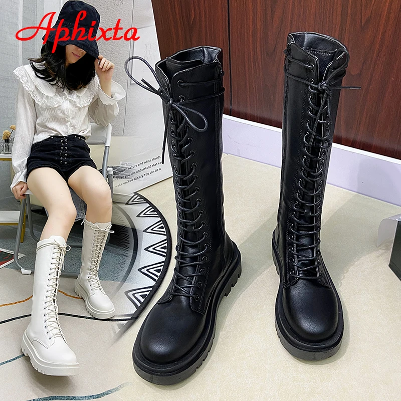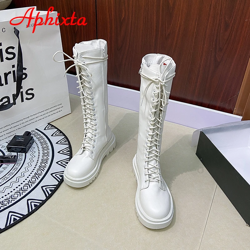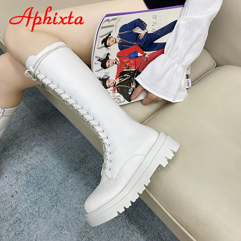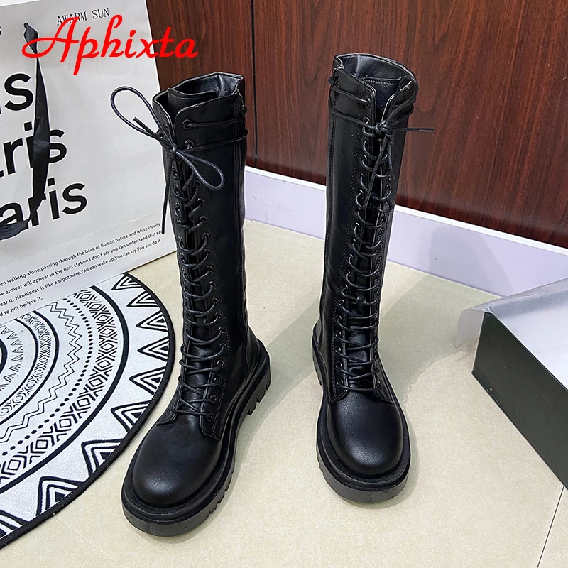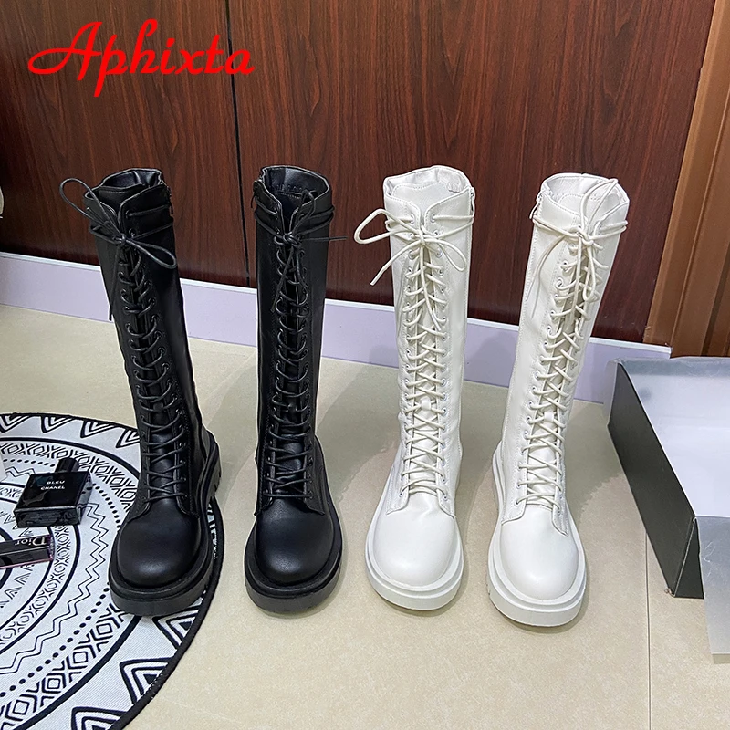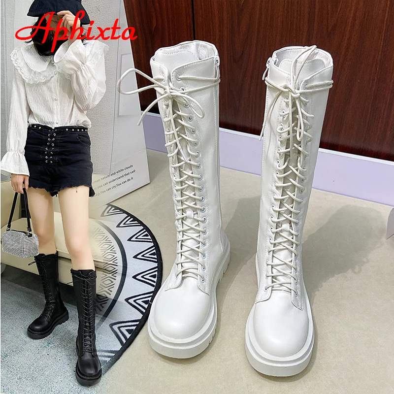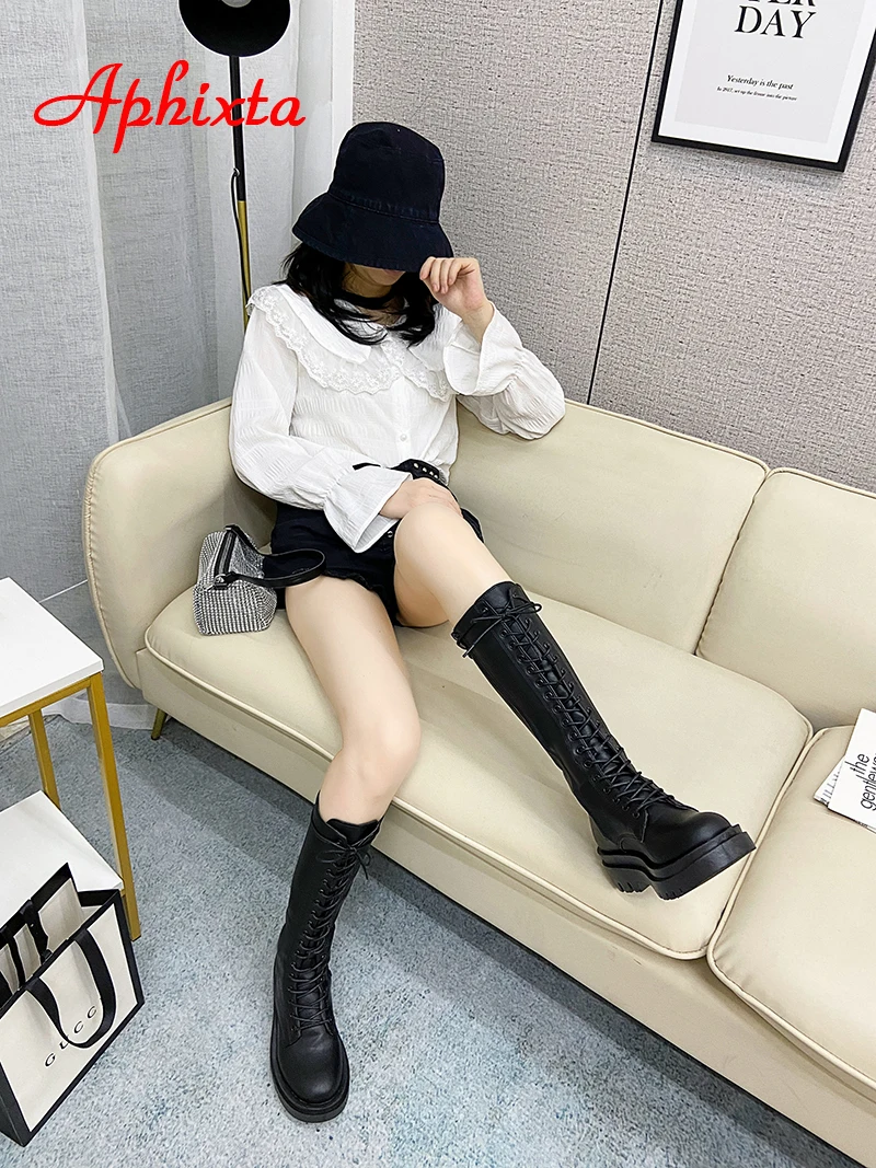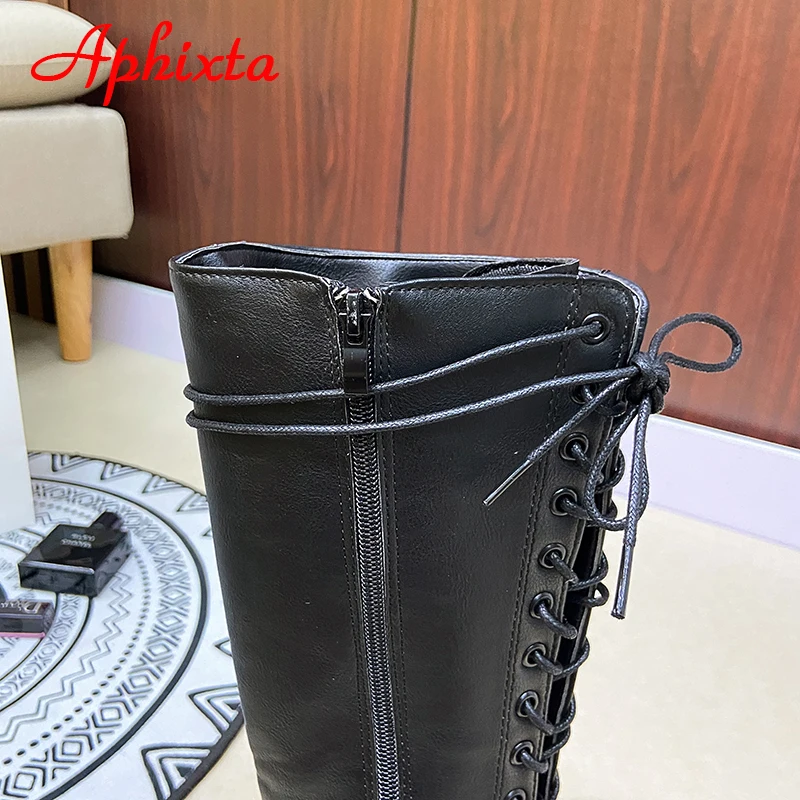 Aphixta New Winter Goth Shoes Women's Long High Boots Leather Cross-Tie Lace-up Shoes Female Fashion Platform Botas Mujer