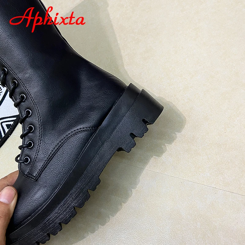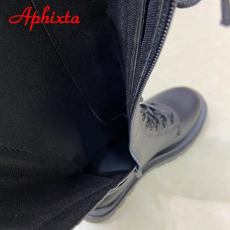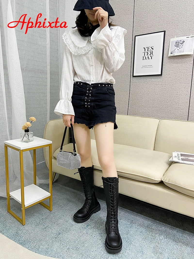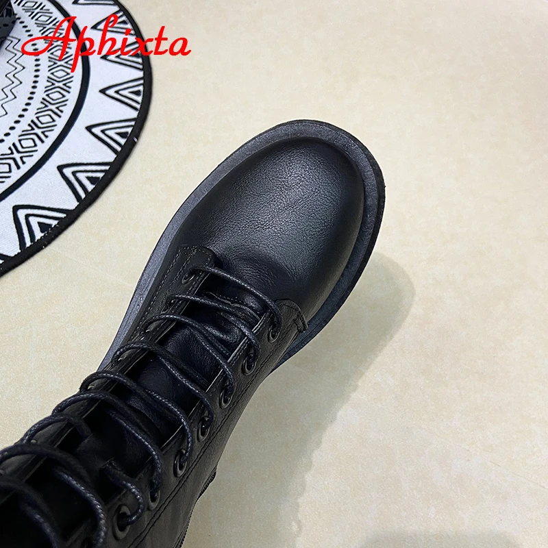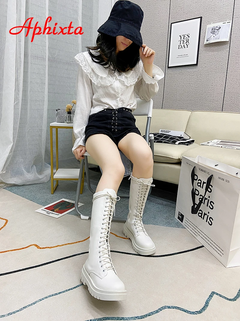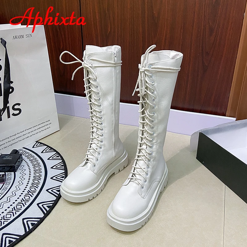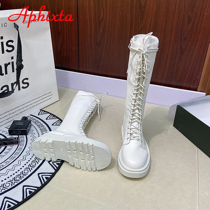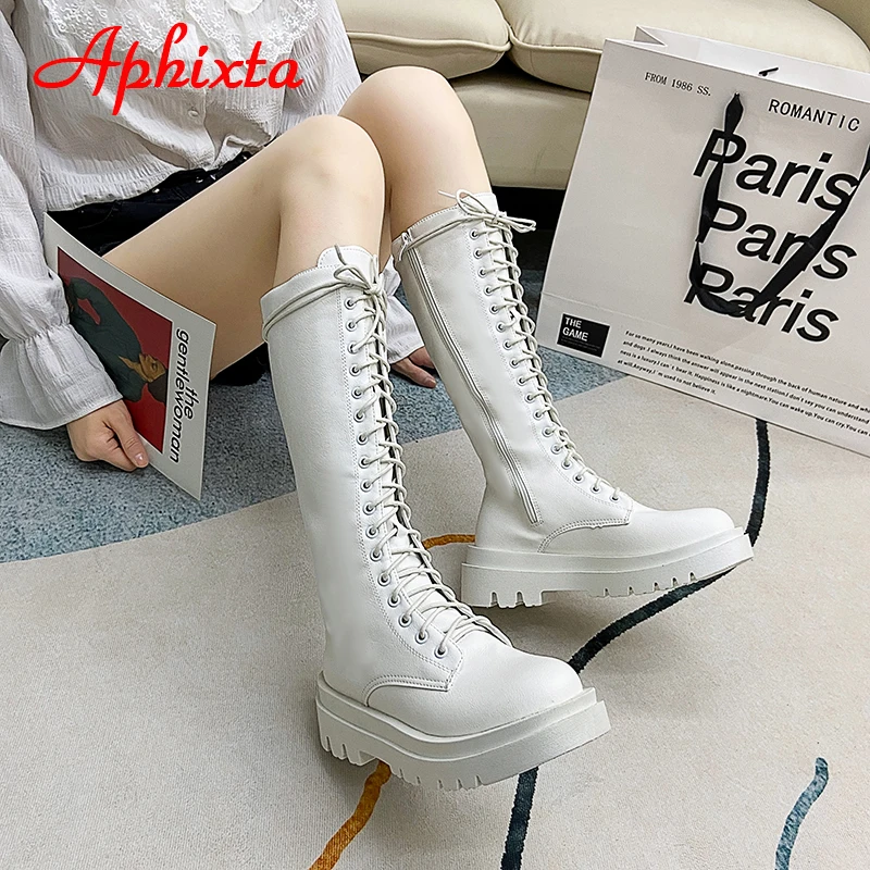Aphixta New Winter Goth Shoes Women's Long High Boots Leather Cross-Tie Lace-up Shoes Female Fashion Platform Botas Mujer