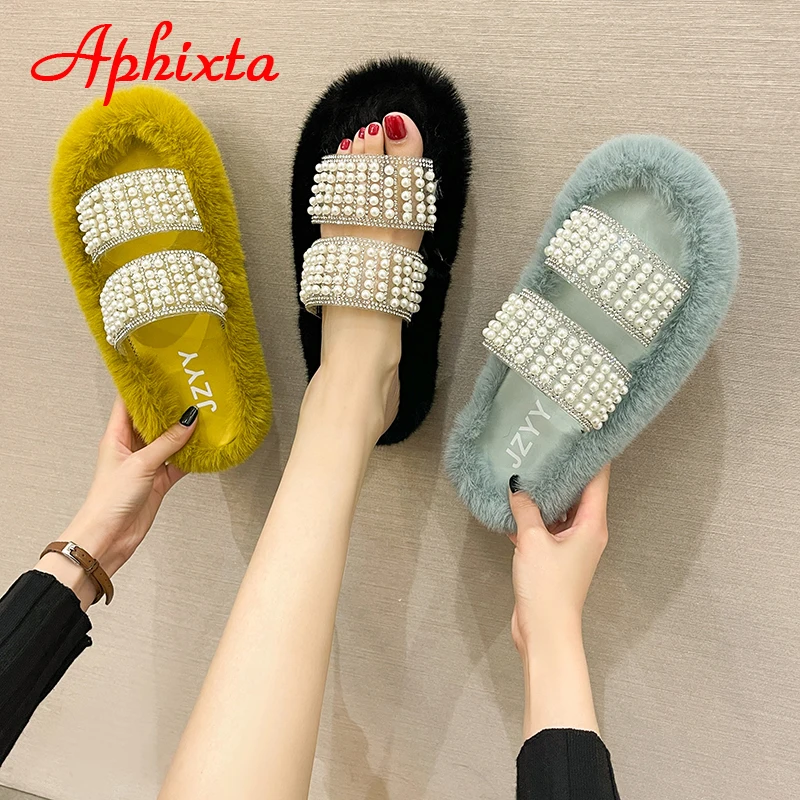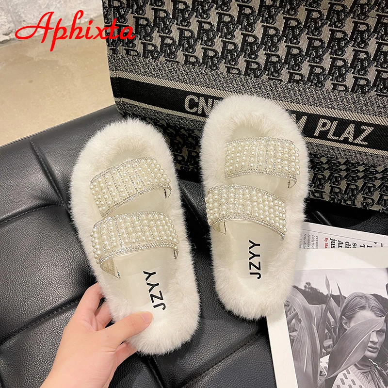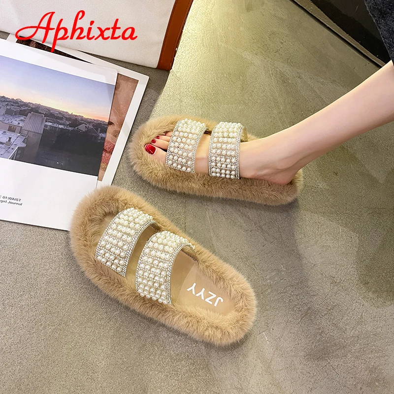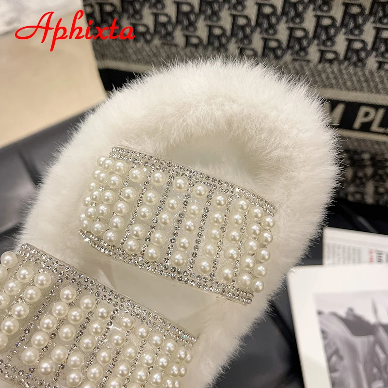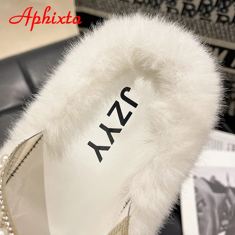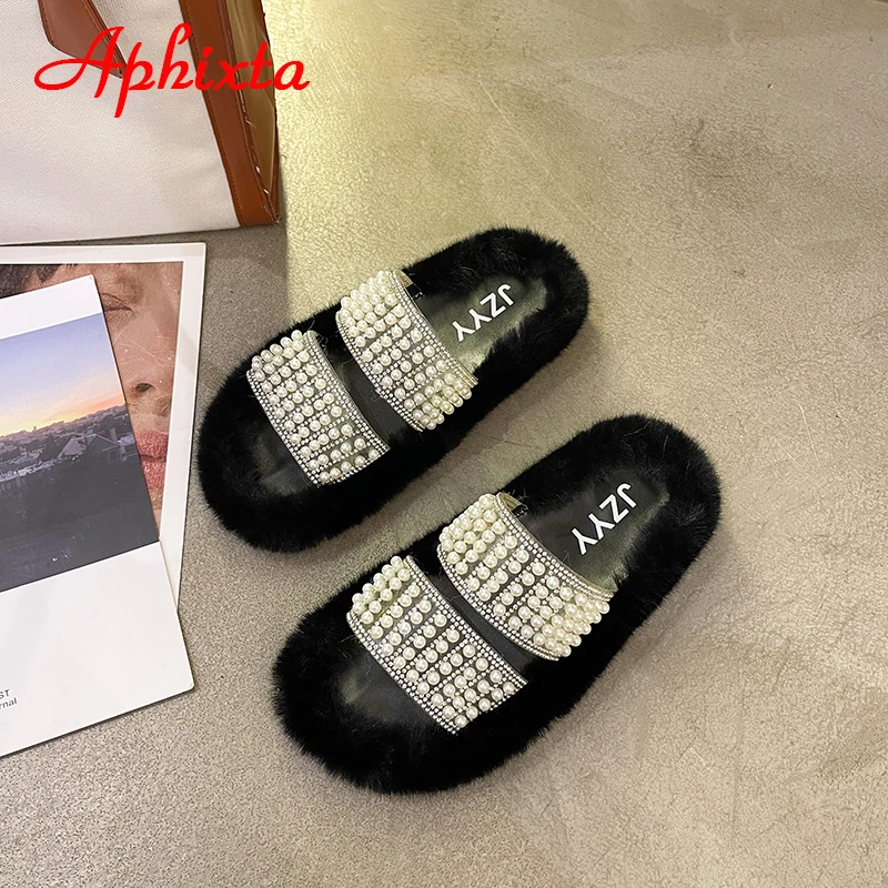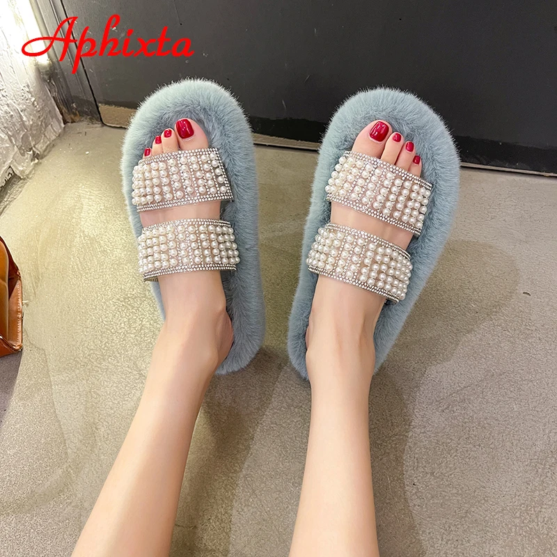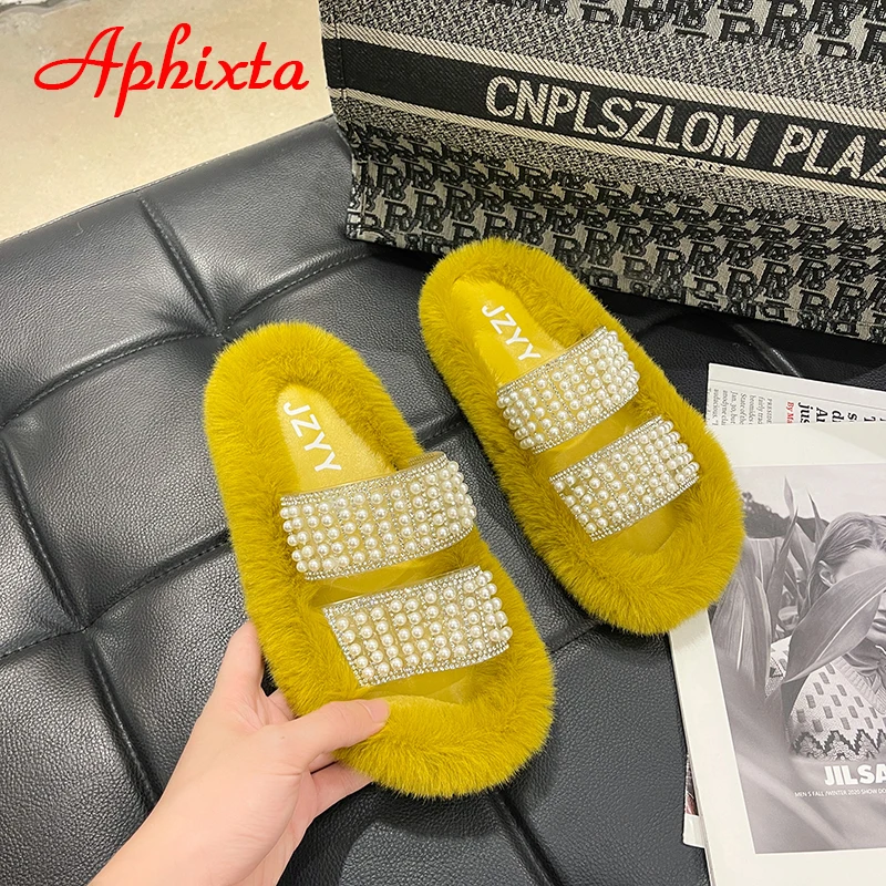 Aphixta New Winter Warm Luxury Peal Home Furry Slippers Women Round Toe Mules Shoes Indoor Flip Flop Female