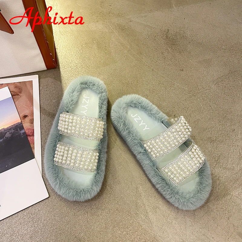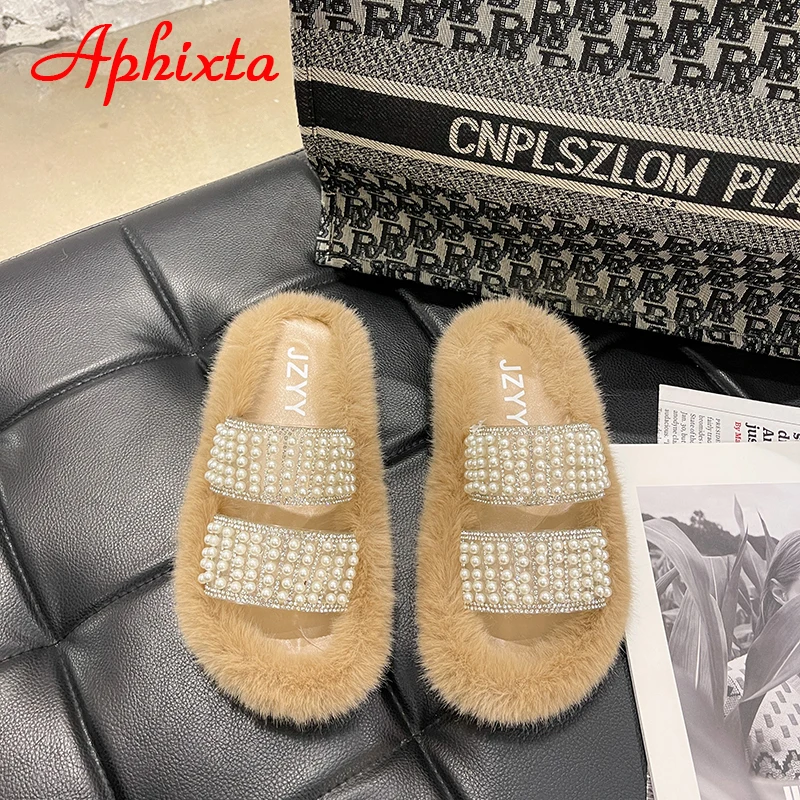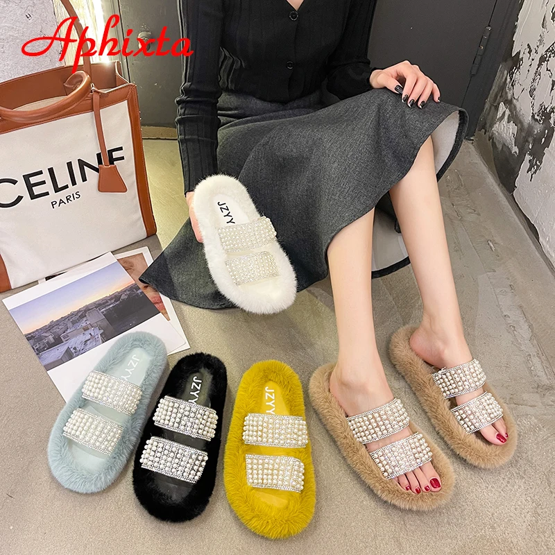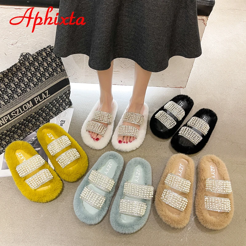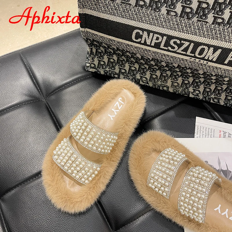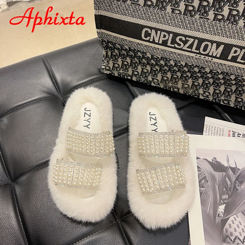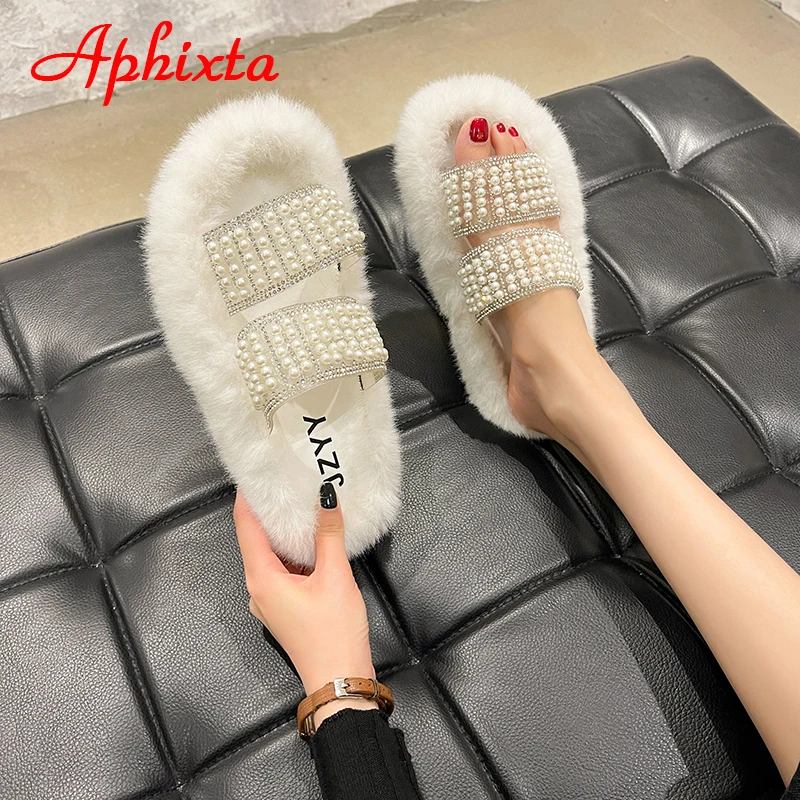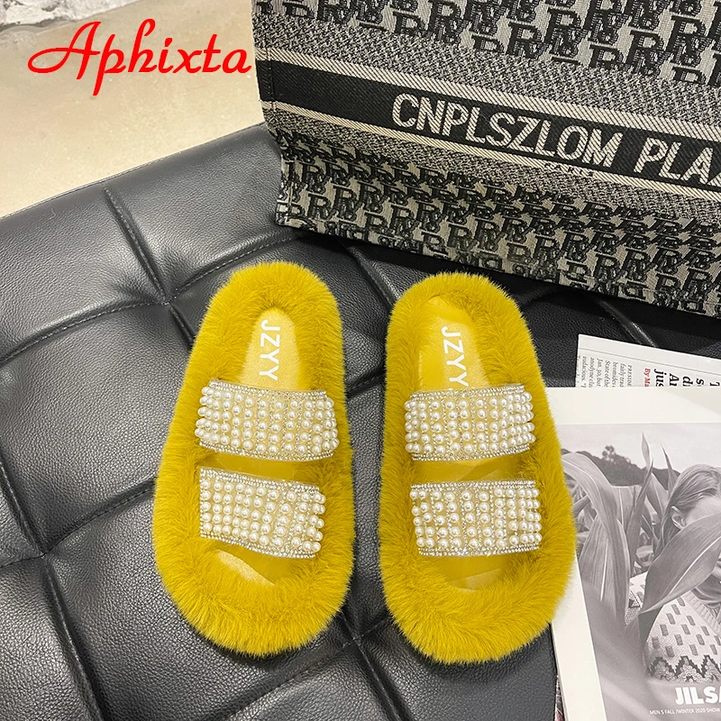Aphixta New Winter Warm Luxury Peal Home Furry Slippers Women Round Toe Mules Shoes Indoor Flip Flop Female