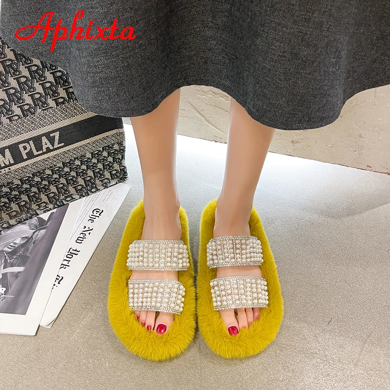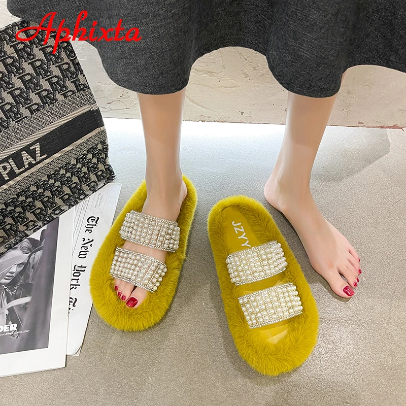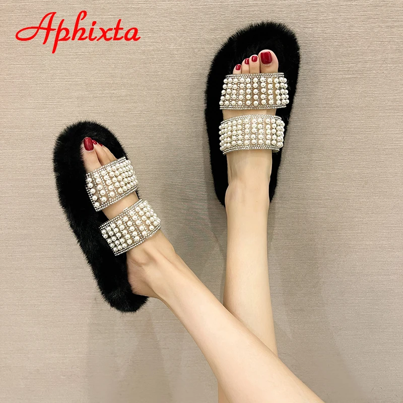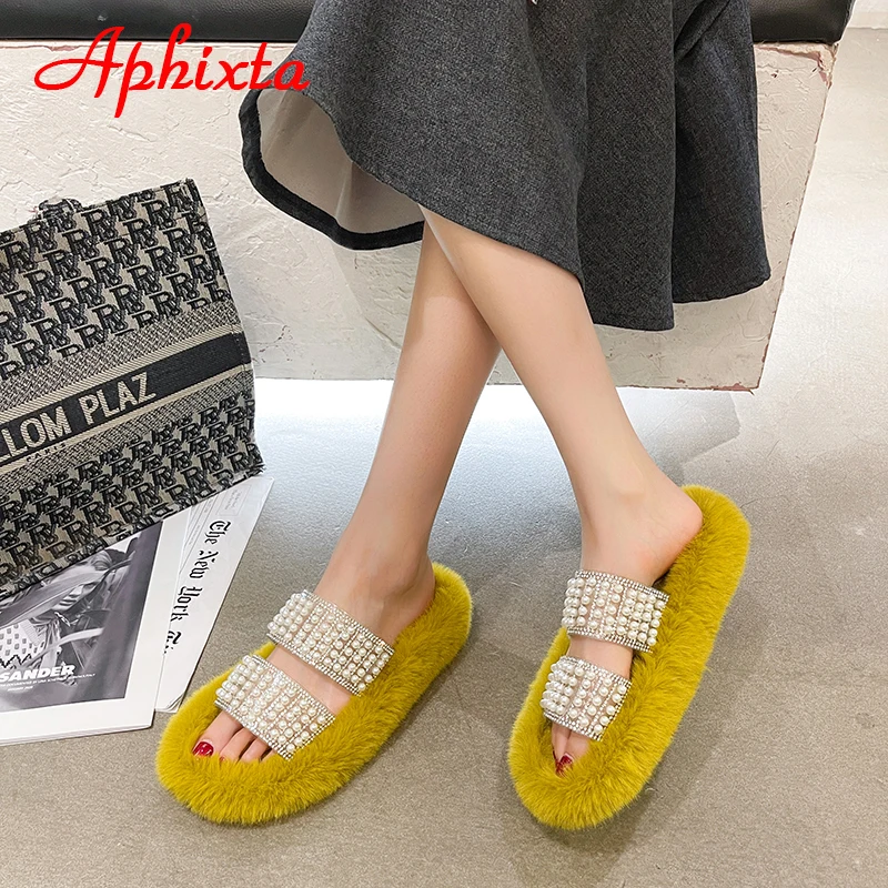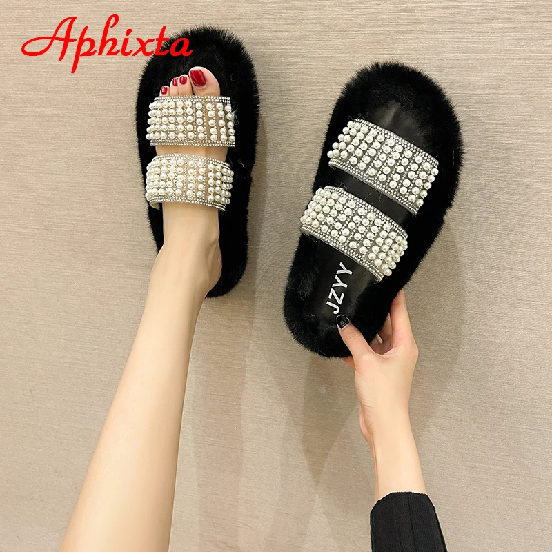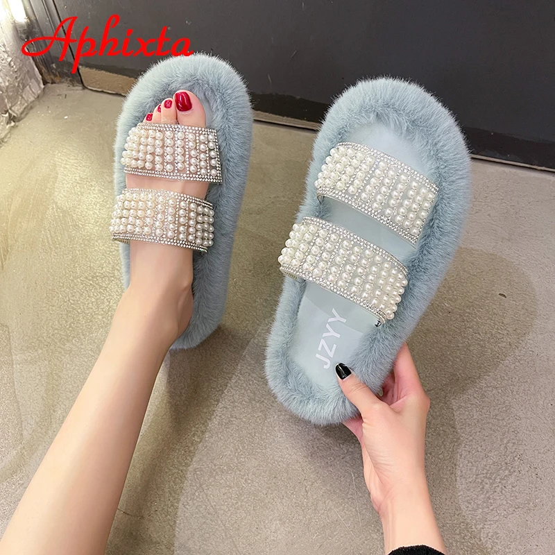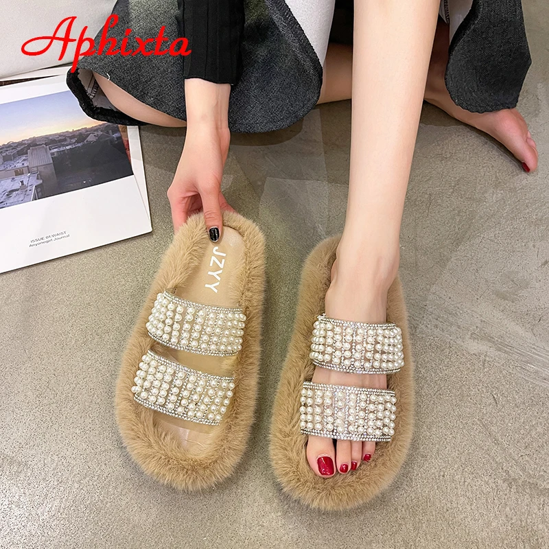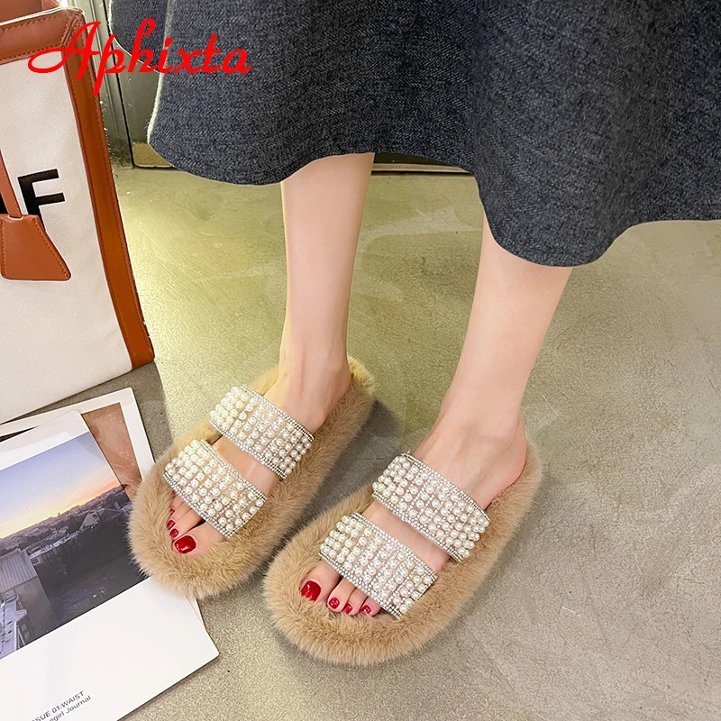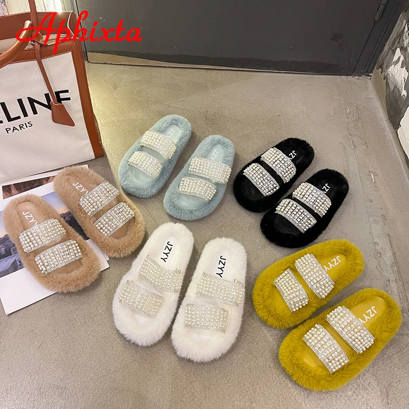 Aphixta New Winter Warm Luxury Peal Home Furry Slippers Women Round Toe Mules Shoes Indoor Flip Flop Female